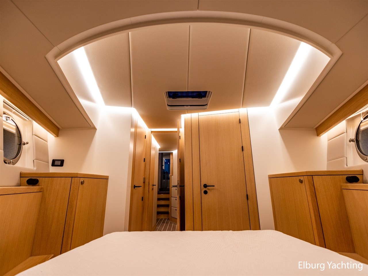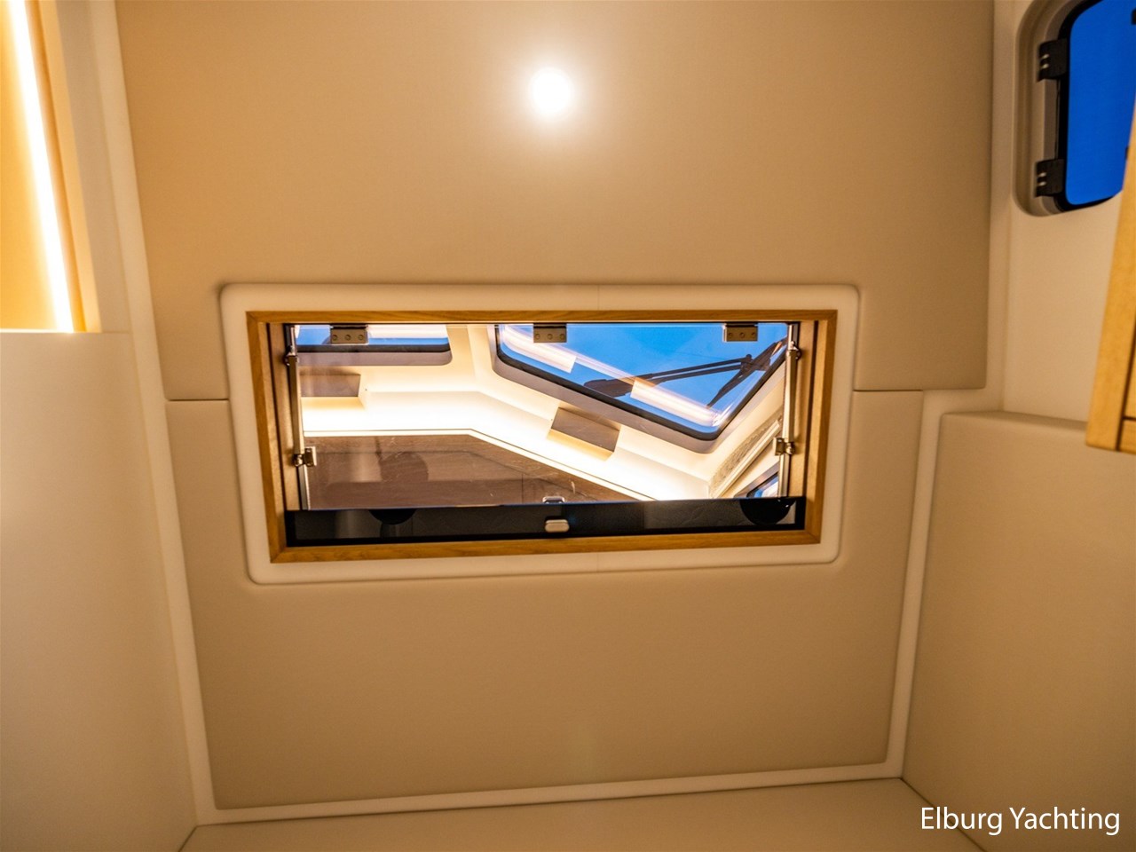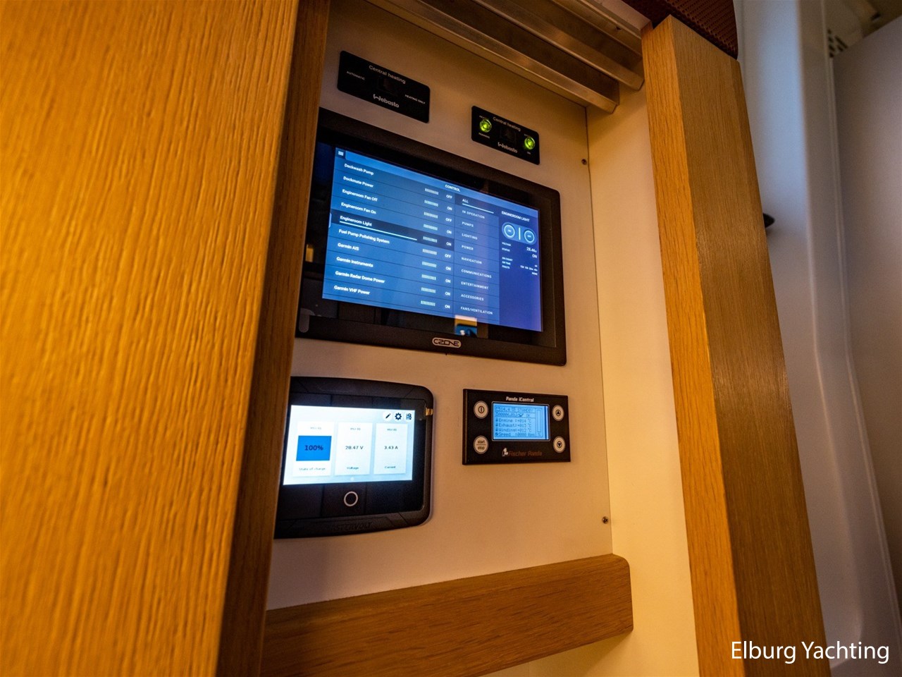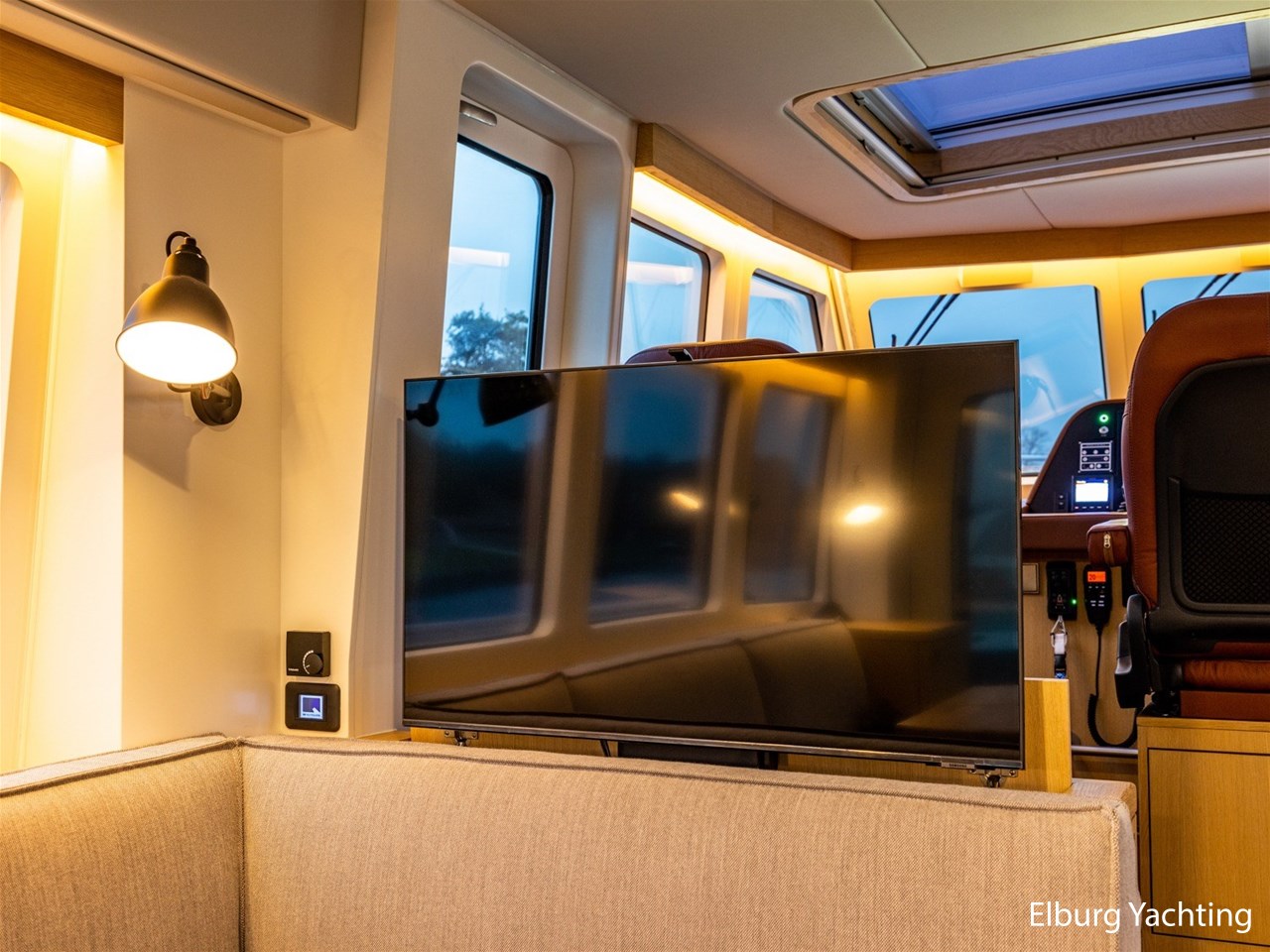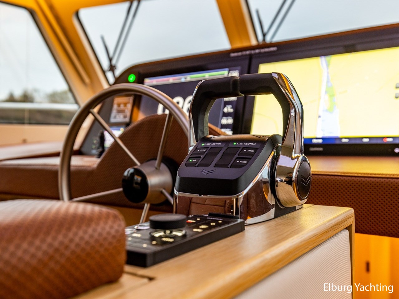 Het jacht wat u ter inspiratie kunt bezichtigen beschikt over : Achterdek en salon gelijkvloers, zij-ingang, elektrisch schuifdak bij stuurhut ( ca. 1.10 x 1.80 m, zij-ingang in reling, grote openslaande deuren naar de kuip om de salon en buitendek, dekdouche met warm/koud water bij zwemplateau, ruime leefomgeving in salon, buiten verlichting op tredes , Garmin navigatiepakket, 2 x 16" scherm, CTCV Camerasysteem voor achterdek en machinekamer, Dockmate - 2 motoren en boegschroef, Humphree interscepter set (4 x) met roll en pitch demping software + carbon vinnen, 4 x zonnepanelen op het achterdak, Fusion radio + 2 x speakers salon en 2 x cockpit (iPhone compatible), Miele was-droogcombinatie. Siemens vaatwasser, Ocean Air horren in eigenaar hut bij dekluik, shades/gordijnen in salon, lederen bekleding van de dashboardunit, elektrische lift voor vaarstoel- en passagiersstoel voor optimaal zicht, Lampe Gras zwarte design lampen, Frost zwarte douche armaturen, elektrische lift voor eettafel om te transformeren naar salon/lounge tafel, Kvadrat bekleding, geïntegreerde aluminium bolders, aluminium tredeplaat in voorroef, Aluminium geïntegreerde trap naar dak op bovenbouw, machinekamer akoestisch geïsoleerd, 3 x ruitenwissers met sproeisysteem. Lewmar dekluiken, Marlan tops, douche en toilet gescheiden voor gastenhut, Prebit leeslampjes, met USB aansluiting en dimbaar, Prebit plafondlampen dimbaar in rood/wit, Flatscreen 43" TV + lift, verborgen in salon rugleuning. In exclusieve samenwerking met Yachtfull International.