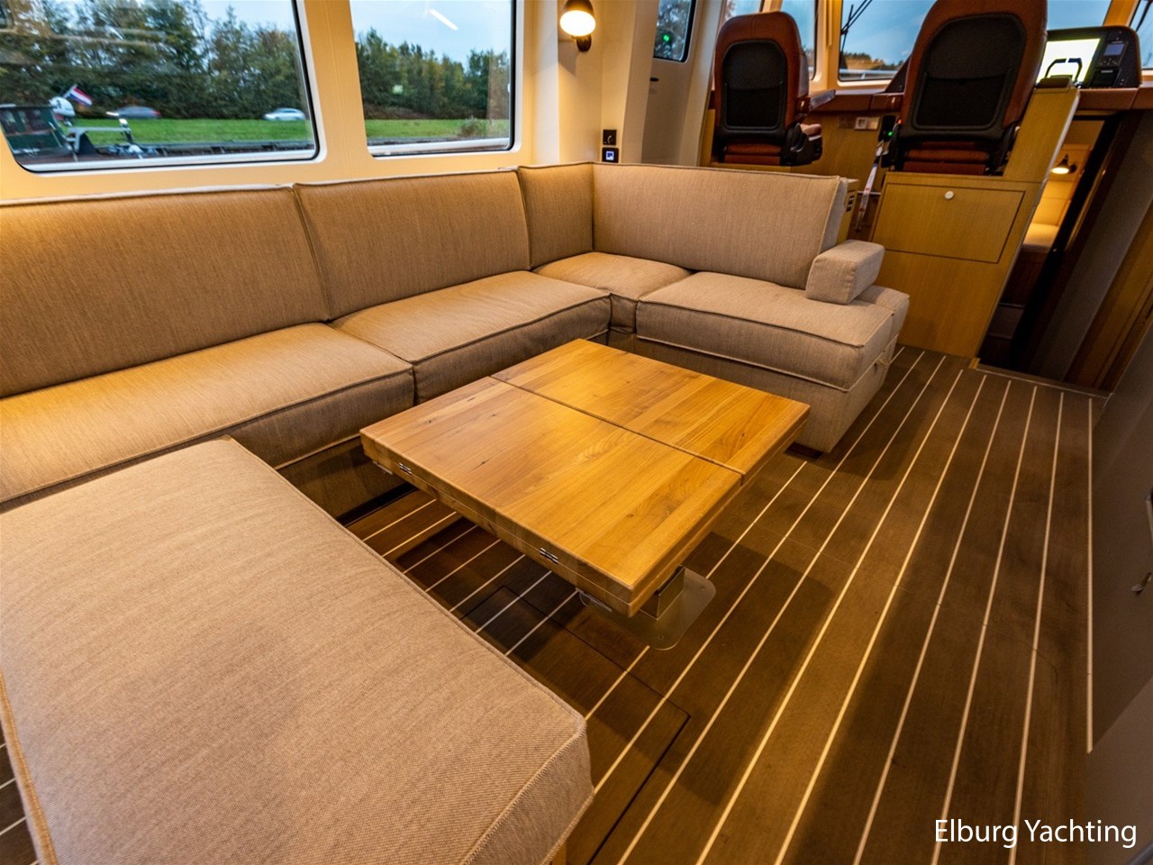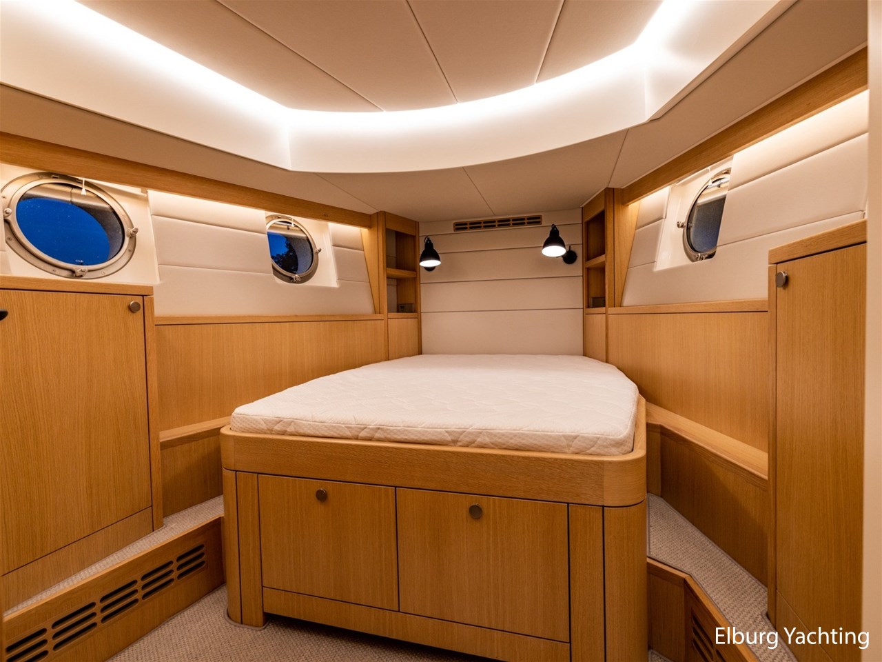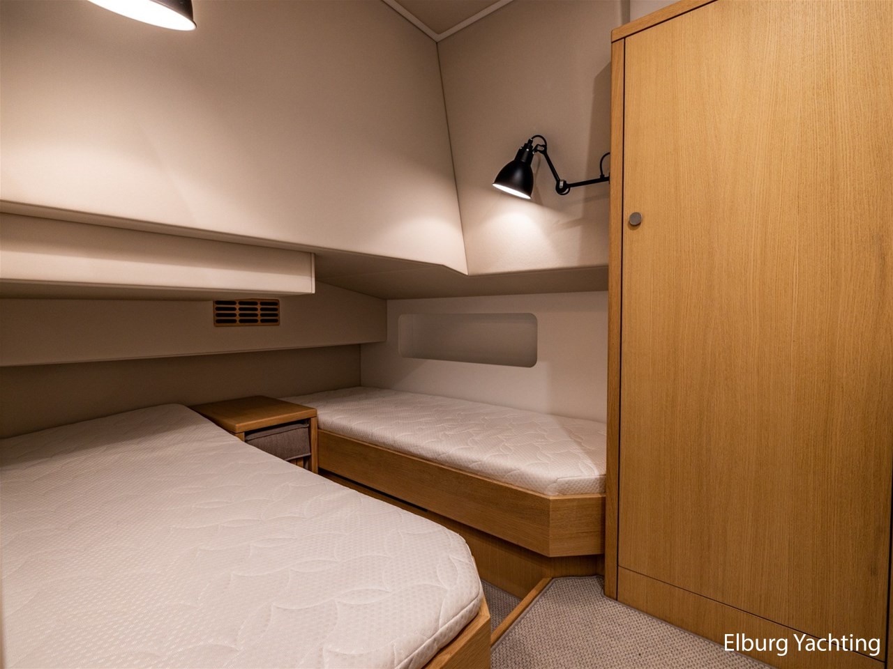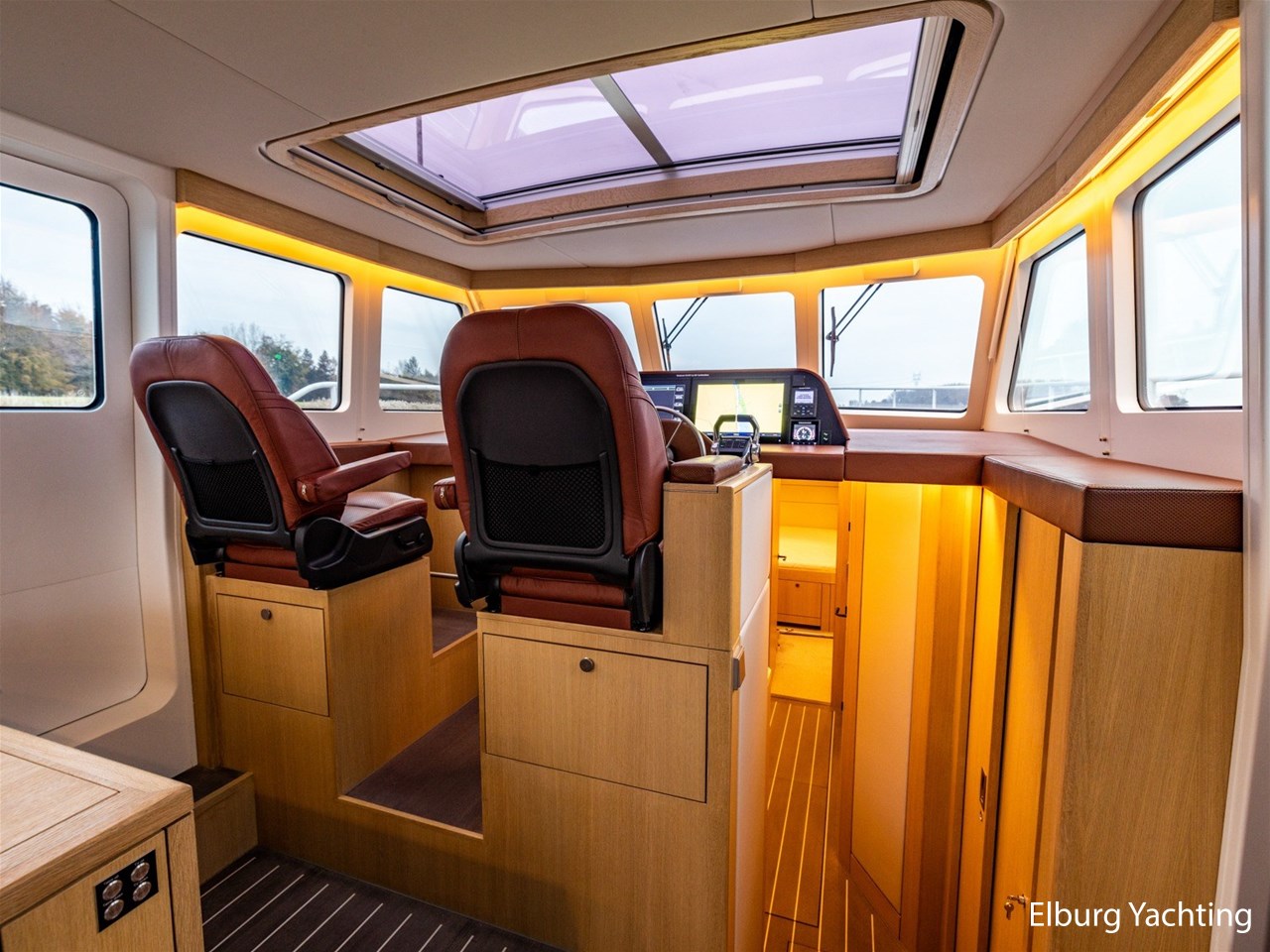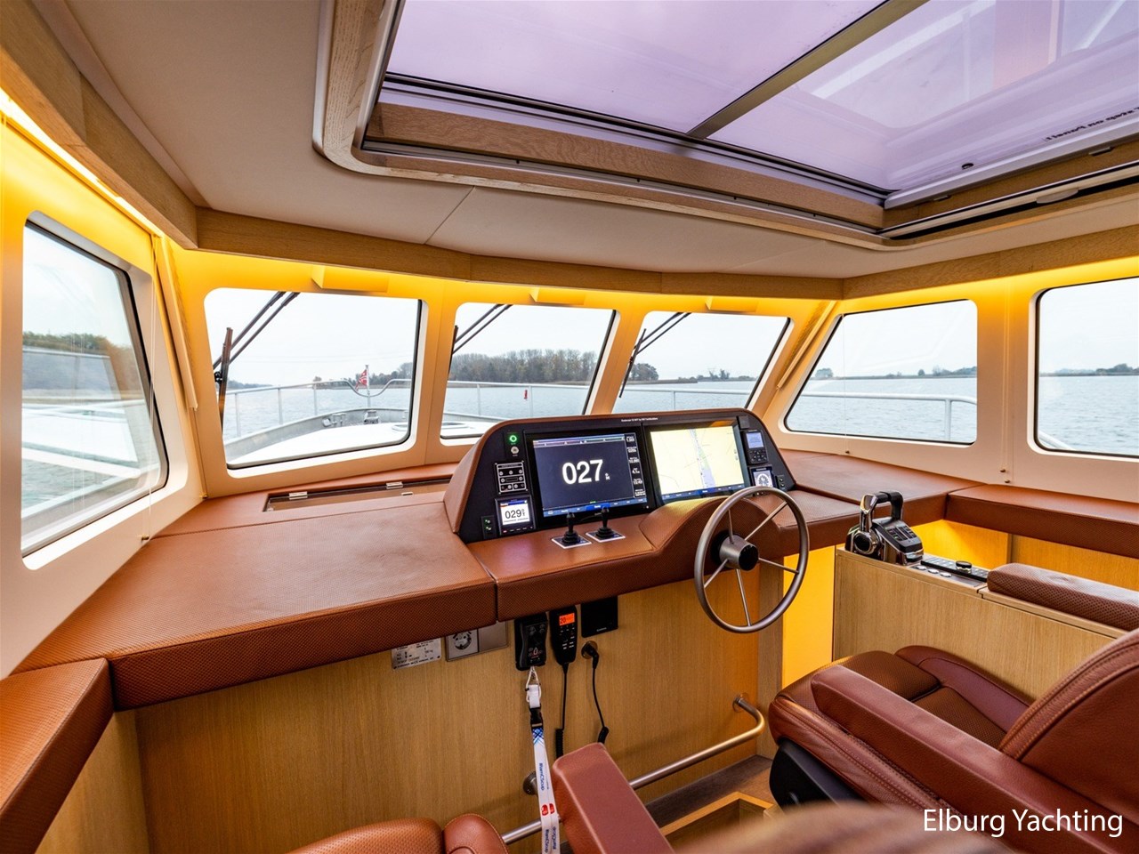 Het jacht wat u ter inspiratie kunt bezichtigen beschikt over : Achterdek en salon gelijkvloers, zij-ingang, elektrisch schuifdak bij stuurhut ( ca. 1.10 x 1.80 m, zij-ingang in reling, grote openslaande deuren naar de kuip om de salon en buitendek, dekdouche met warm/koud water bij zwemplateau, ruime leefomgeving in salon, buiten verlichting op tredes , Garmin navigatiepakket, 2 x 16" scherm, CTCV Camerasysteem voor achterdek en machinekamer, Dockmate - 2 motoren en boegschroef, Humphree interscepter set (4 x) met roll en pitch demping software + carbon vinnen, 4 x zonnepanelen op het achterdak, Fusion radio + 2 x speakers salon en 2 x cockpit (iPhone compatible), Miele was-droogcombinatie. Siemens vaatwasser, Ocean Air horren in eigenaar hut bij dekluik, shades/gordijnen in salon, lederen bekleding van de dashboardunit, elektrische lift voor vaarstoel- en passagiersstoel voor optimaal zicht, Lampe Gras zwarte design lampen, Frost zwarte douche armaturen, elektrische lift voor eettafel om te transformeren naar salon/lounge tafel, Kvadrat bekleding, geïntegreerde aluminium bolders, aluminium tredeplaat in voorroef, Aluminium geïntegreerde trap naar dak op bovenbouw, machinekamer akoestisch geïsoleerd, 3 x ruitenwissers met sproeisysteem. Lewmar dekluiken, Marlan tops, douche en toilet gescheiden voor gastenhut, Prebit leeslampjes, met USB aansluiting en dimbaar, Prebit plafondlampen dimbaar in rood/wit, Flatscreen 43" TV + lift, verborgen in salon rugleuning. In exclusieve samenwerking met Yachtfull International.