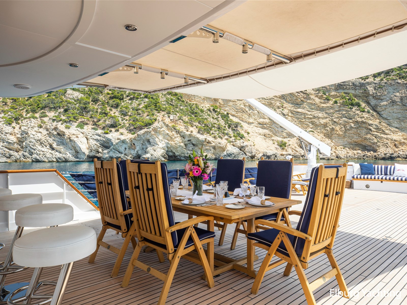 Het brugdek beschikt over een bar, vaste bank aan de achterzijde en veel dek-ruimte flexibel te gebruiken, zeker wanneer beide tenders worden ingezet. Een klein zonnedek bovenop de brug biedt enige privacy, grote zonnekussens en een prachtig uitzicht. Een bank op het voordek biedt extra privé zitplaatsen buiten.