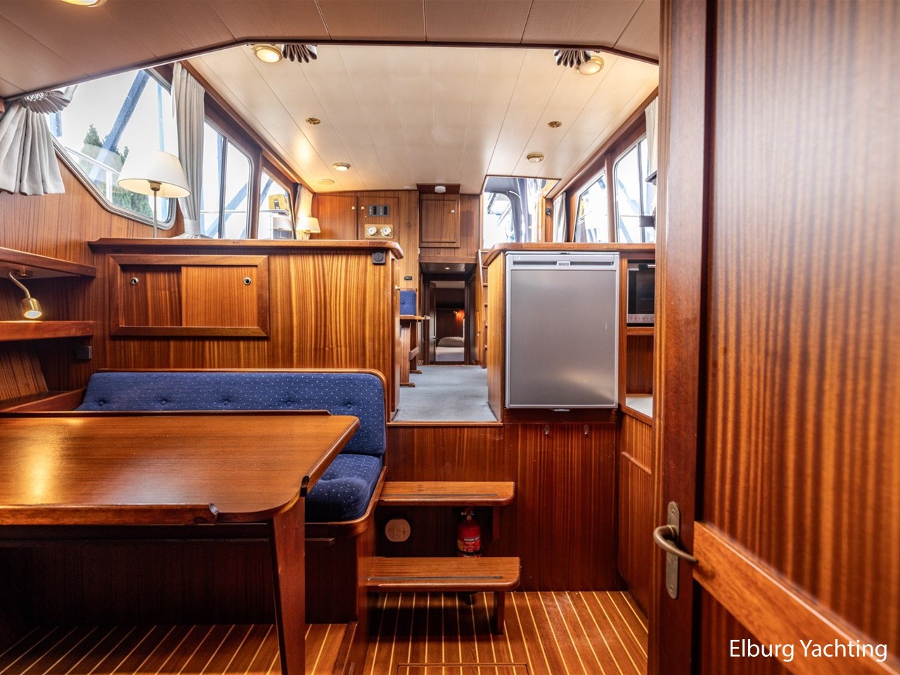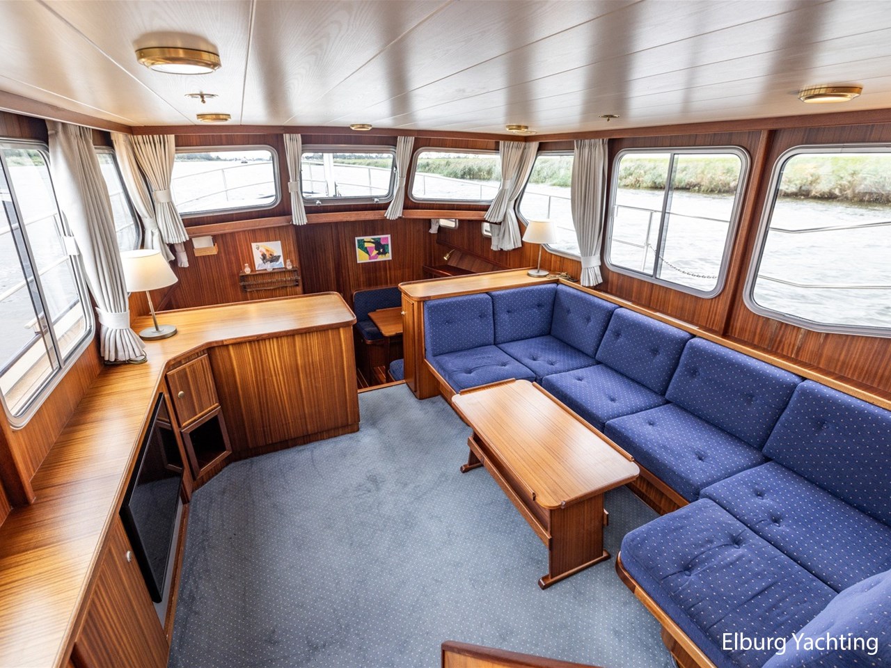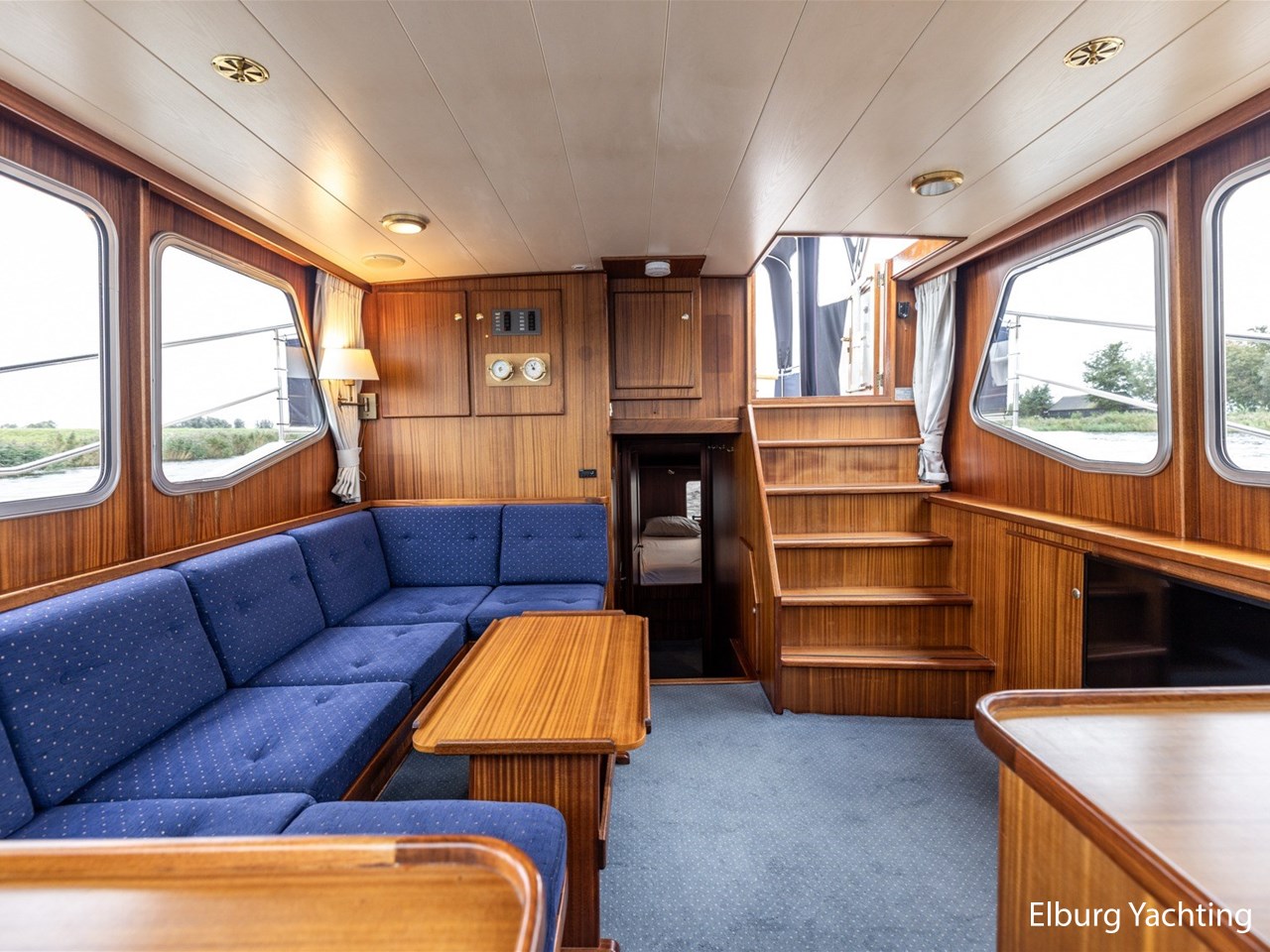 - Scheeps zijdeglas mahonyhouten interieur met blauwe kussens en een bijpassende vloer