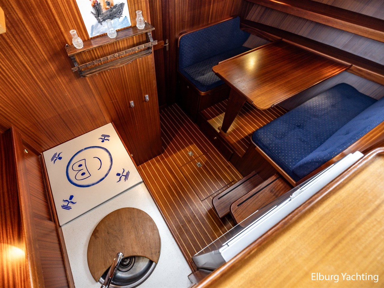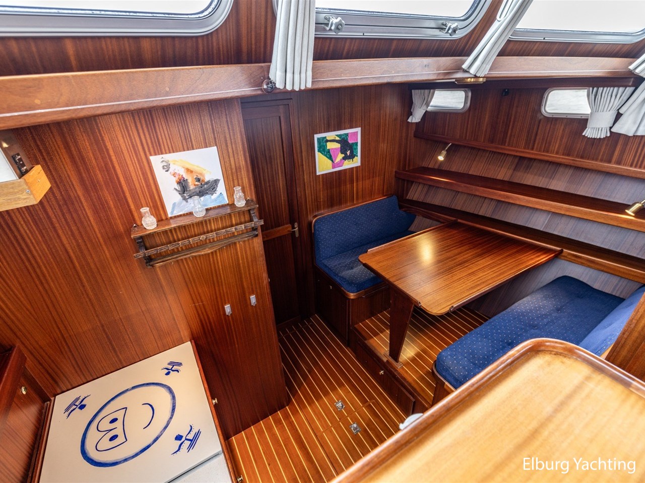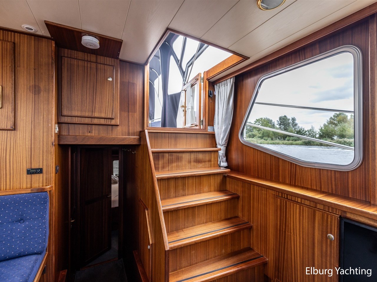 - Scheeps zijdeglas mahonyhouten interieur met blauwe kussens en een bijpassende vloer