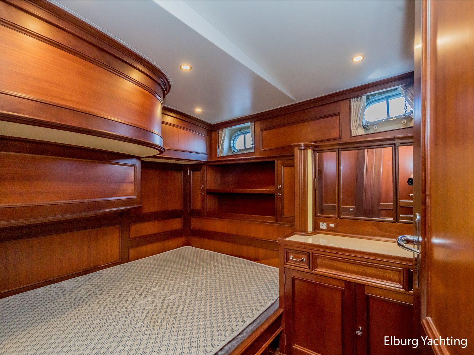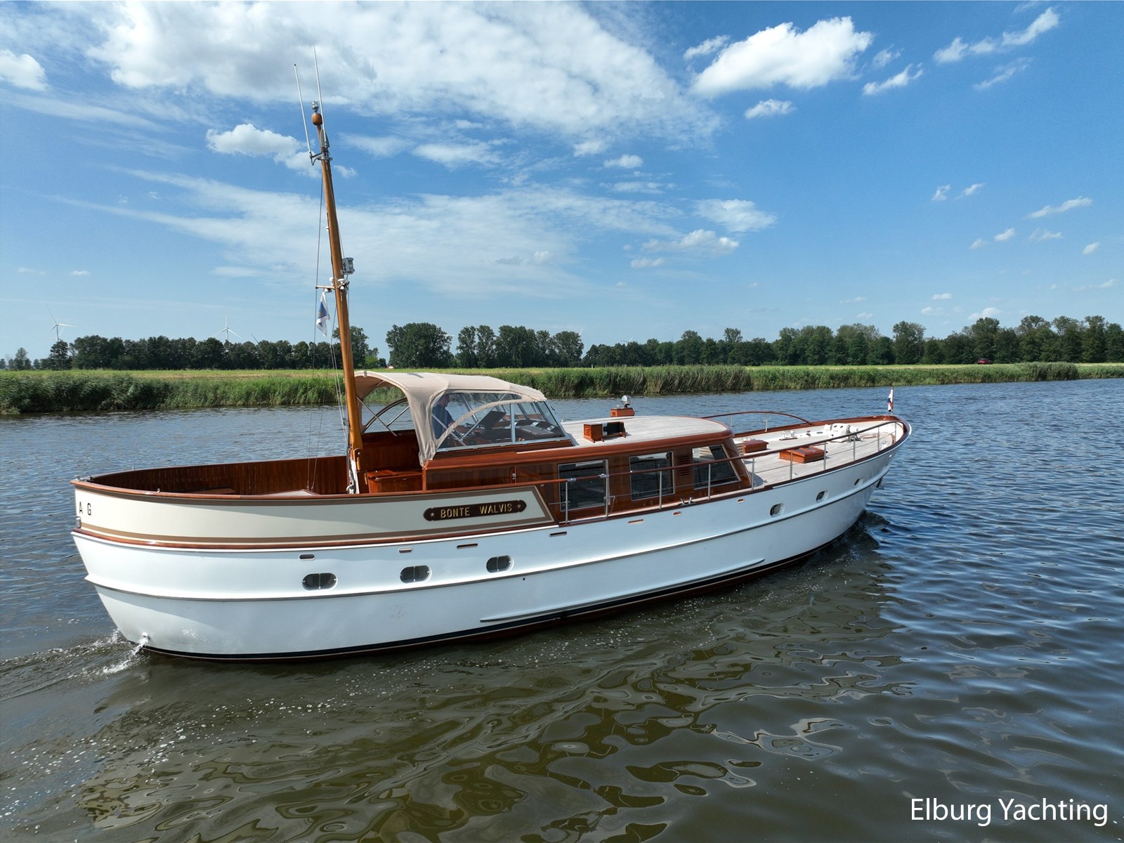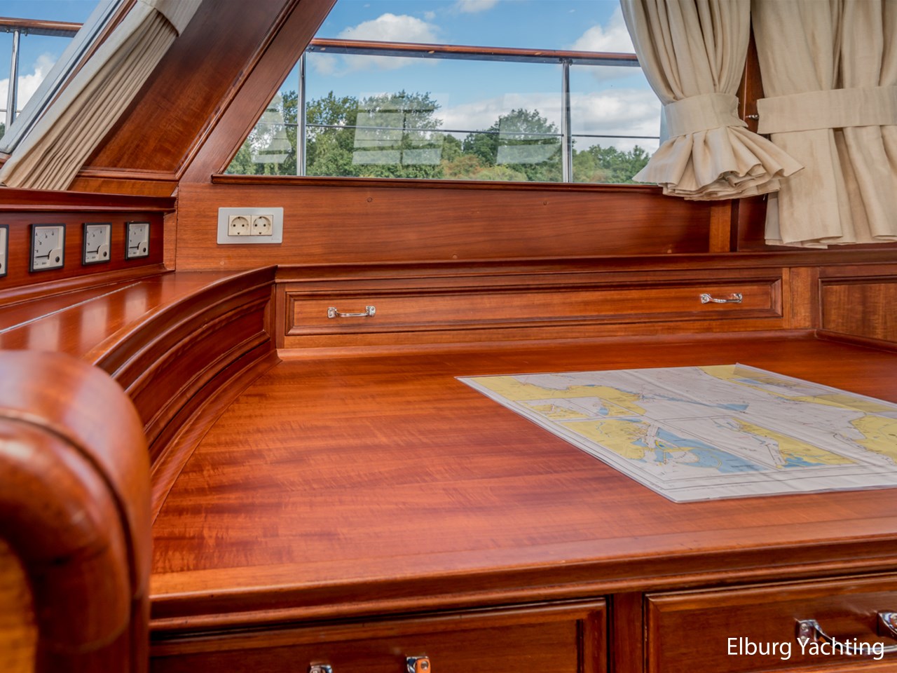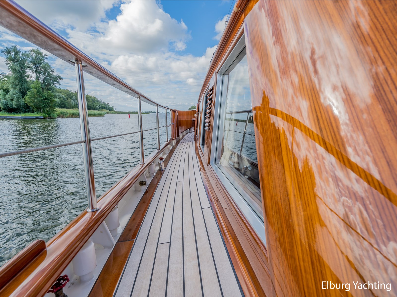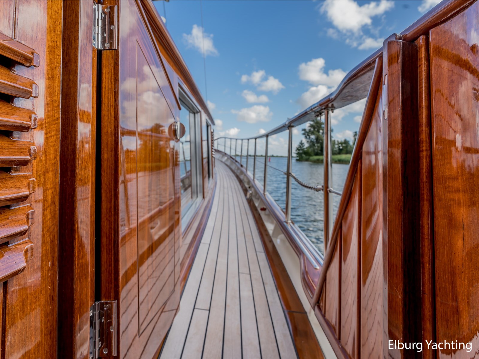 De Lunstroo 56 - (Total Refit 2015) is een stuk maritieme geschiedenis en zonder twijfel een van de meest in het oog springende kotterjachten die rondvaart. Het schip is gelanceerd in 1974, maar heeft in 2015 een volledige refit ondergaan op bij Nicolaas Witsen, waar kosten nog moeite zijn gespaard. Het schip heeft 2 nieuwe Perkins motoren gekregen, welke bekend staan om het lage toerental en laag geluidsniveau. Tijdens de refit is o.a. het volgende uitgevoerd : Nieuw massief teakdek (22 mm), nieuw teak kajuitdak (15 mm), Alle gelakte teakhout elementen van de kajuitopbouw zijn nieuw vervaardigd, verchroomde patrijspoorten, nieuw verpakte raamframes, de gehele elektrische installatie is vernieuwd incl. pompen en andere apparaten, nieuwe navigatieapparatuur, nieuw schroefassen, schroefaslagers, stuwdruklagers en schroeven. Alle tanks zijn open geweest, schoongemaakt en geïnspecteerd. (Zowel diesel, water en vuilwatertanks.), Leidingwerk is gemeten op wanddikte. Romp geschilderd in Awl Grip. Al het blanke lakwerk met impregneerhars en Dubbel UV Coating van Dubbelcoat Van de IJssel. (met uitzondering van de rondhouten), Motorbediening Morse omgebouwd tot elektronische bediening, Kabola CV met warmwatervoorziening gemonteerd, nieuwe stoffering, nieuw matrassen. De Lunstroo 56 beschikt over veel leefruimte in de salon en op het achterdek. Het is een uniek motorjacht met hoogwaardige afwerking met modern comfort en nieuwe techniek, geschikt om voor langere tijd op te verblijven. R.v.s. reling, r.v.s stootlijst, ruime zitgelegenheid in de salon, 7 slaapplaatsen, chroom omrand windscherm, achteringang, 2 x vluchtluik voorin, Miele wasmachine, stahoogte ca. 2 meter, achterhut geschikt voor crewcabine (incl. entree machinekamer), goed geïsoleerde machinekamer. Stereoset BOSE Binnen en Buiten (2015), Lowe TV + Lift (2015), CVO certificaat aanwezig, bilge alarm aanwezig in 3 zone’s . De huidige eigenaar heeft om makkelijker lage bruggen te passeren de voormast gedemonteerd en droog opgeslagen en de achtermast klapbaar gemaakt d.m.v. een lier. Ook is in de stuurboord hut één van de stabelbedden weggenomen om meer ruimte te creëren. De doorvaarthoogte met mast op is ca. 8,40m en met geklapte mast en kuipramen geklapt ca. 2,90m.