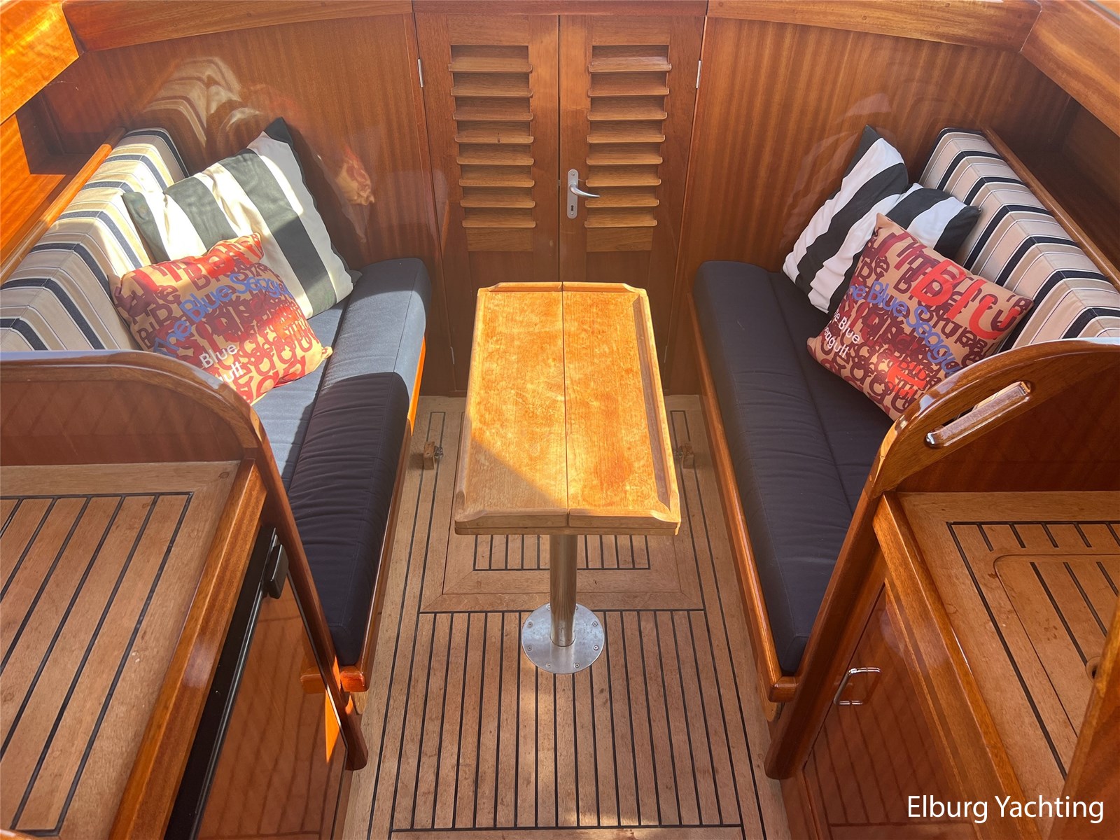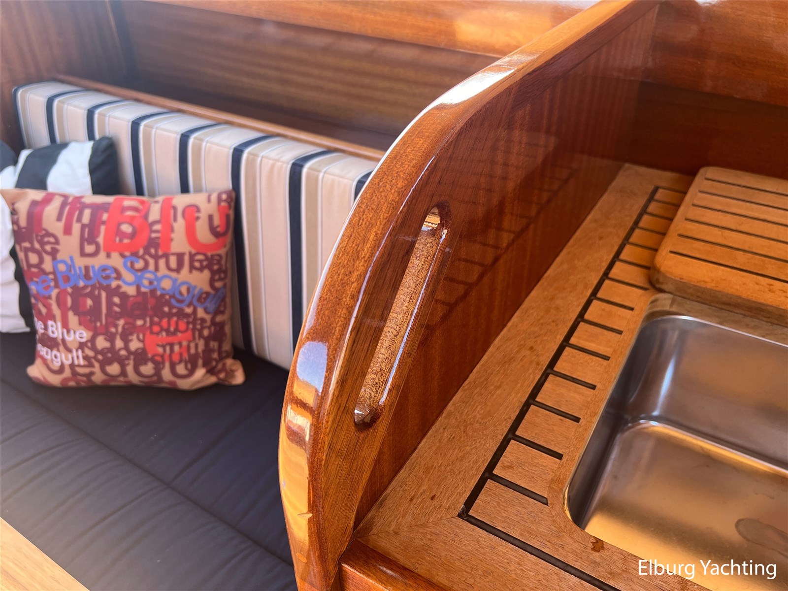 - Teakhouten interieur met wit/donkerblauwe bekleding