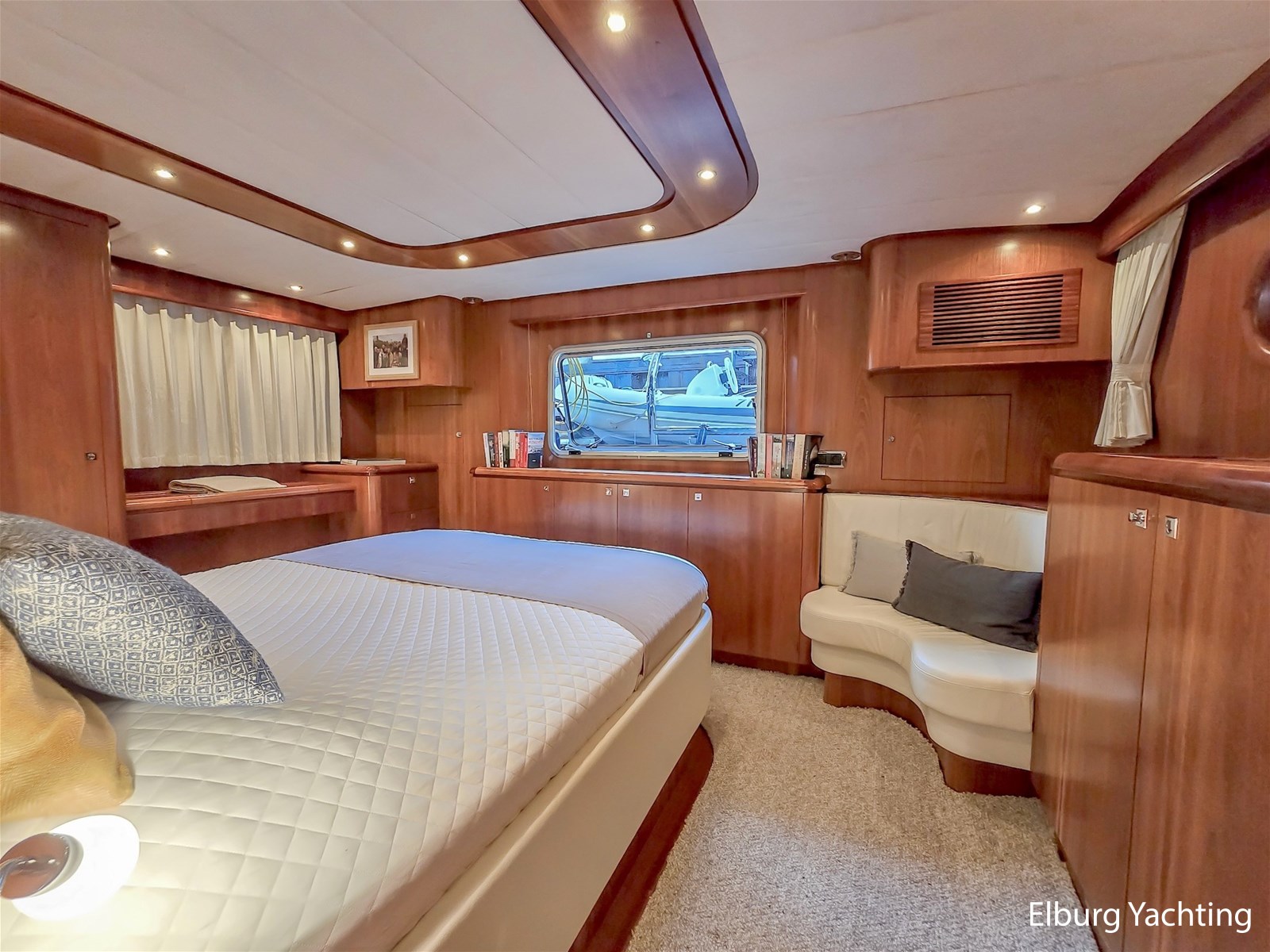 Via het stuurhuis kom je via de openslaande deuren op het riante achterdek met vaste tafel. Dit schip wordt verder geleverd met o.a: Samsung TV op lift in salon/stuurhuis/eigenaarshut, muggenhorren, groot elektrisch schuifdak in stuurhuis, r.v.s. klapbare deuren naar achterdek, r.v.s. reling, r.v.s. bolders, r.v.s. fenderkorven, r.v.s. spoelbakken, bolders op achterdek, bimini voor over achterdek, dubbele wasbakken in de eigenaarshut, op afstand bedienbare verwarming d.m.v. SMS, hydraulisch klapbare radarbeugel, kruiphoogte ca. 4.20 meter, designradiatoren in badkamers, generator start in keuken, Corian aanrechtblad, bergruimte onder keukenvloer, bergruimte voor vouwfietsen op voordek, luxe plafondbekleding, NEFF vaatwasser, AEG wasmachine (8kg), AEG droger (8kg), raam in spiegel, open badkamer in eigenaarshut, volledig betegelde douchecabines, dressoir in eigenaarshut, aluminium traanplaten in machinekamer, Firepro brandblussysteem in machinekamer, hydrauliekpomp op beide motoren, wijnkoeler, geïntegreerde bakskisten, dimbare verlichting, dekwaspomp, roerstandaanwijzer, 10 x patrijspoorten in roestvrij stalen frames, groot openslaand raam geïntegreerd in het achterschip voor extra licht en ventilatie van de eigenaarsslaapkamer, trap aan bak- en stuurboord, douche met warm/koud water en roestvrijstalen zwemtrap, teakvloer in cockpit, L-vormige bank met off-white lederen bekleding, teakhouten kuiptafel gemonteerd op twee roestvrijstalen steunen, 2 x cockpit plafondverlichting, 2 x Stereo luidspreker gemonteerd in cockpit plafond, de toegangsdeuren van de cockpit naar het stuurhuis zijn gemaakt van gepolijst roestvrij staal met dubbele beglazing en kunnen volledig harmonica-open voor optimaal contact en doorgang van de cockpit naar het stuurhuis, houtwerk interieur afgewerkt in zijdeglans gelakt kersenhout, licht zandgrijze vloerbedekking in alle delen van het interieur, behalve in de stuurhut (gelakte houten vloer), LED plafondverlichting in het hele interieur, grote centrale stuurstand met 360 graden overzicht en kapiteinsstoel, L-vormige bank afgewerkt met off-white lederen bekleding + salontafel, comfortabele zijtrap naar de salon, grote kast aan bakboordzijde met een voorlader AEG koelkast, AKAI flatscreen TV, wijnkast (koelt niet) en meerdere kasten, jaloezieën voor de ramen, uitzonderlijk veel opbergruimte/kledingkast en lades.