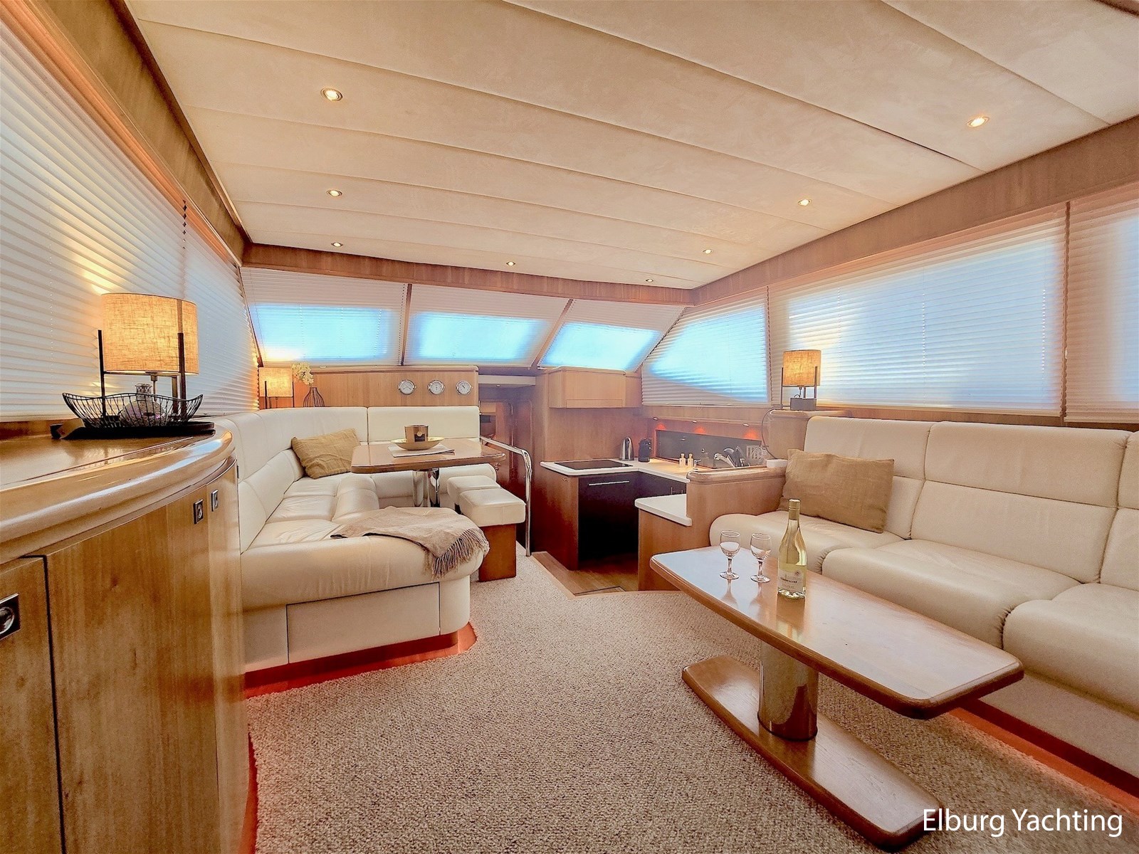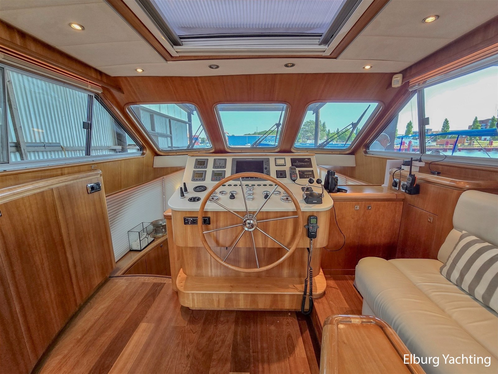 - Kersen + lederen bekleding + teak vloer in stuurhut en keuken