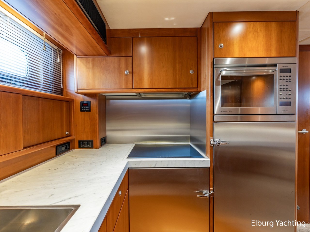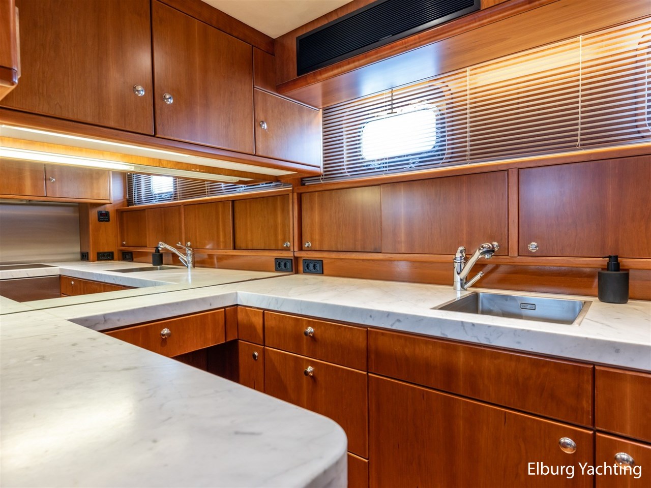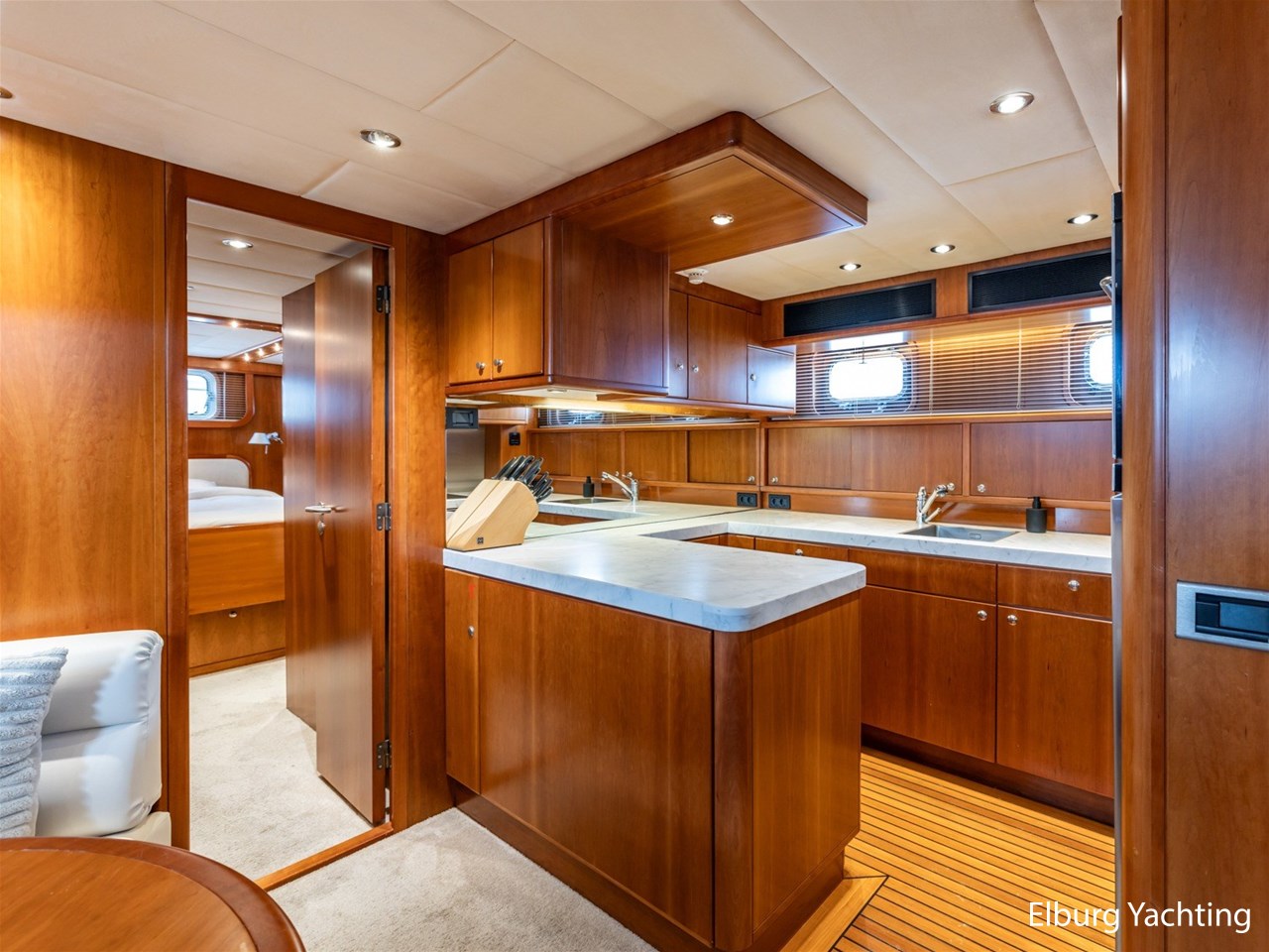 - Kersen scheepsinterieur + alcantara plafonddelen + teak vloer in de keuken