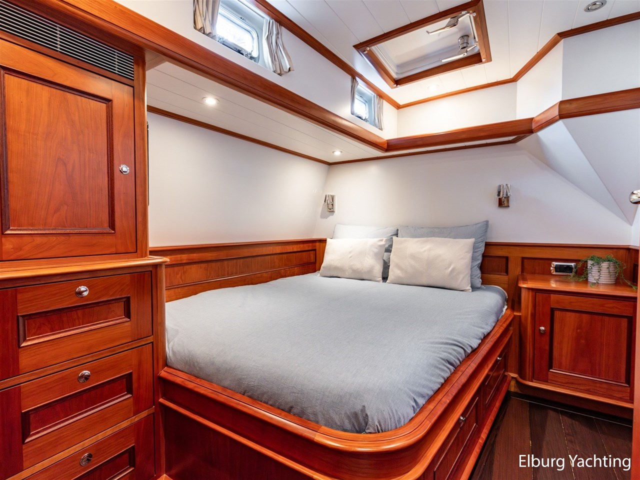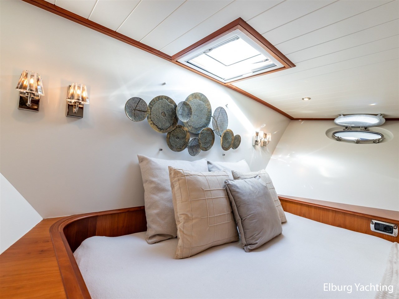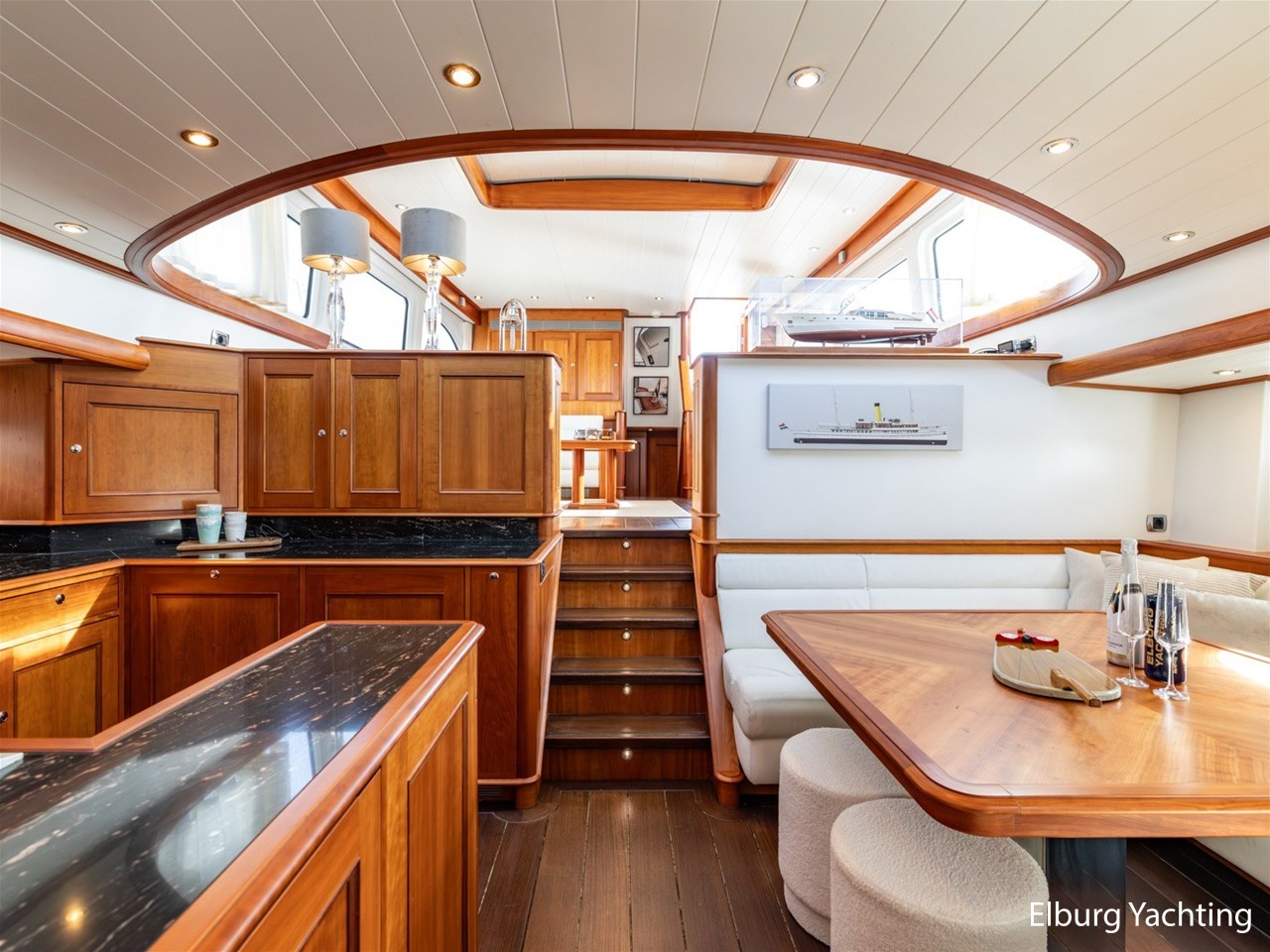 Het jacht beschikt over een ruime keuken en een zeer ruime U-vormige dinette tegenover de keuken. De eigenaarshut is ontworpen met oog voor detail en comfort. Het is een ruime hut met ensuite een badkamer, en biedt een royale inloopruimte incl. een bureau met veel kastruimte voordat de slaapruimte wordt betreedt Het interieur heeft prachtig gebogen deuropeningen en deuren, die de traditionele en klassieke charme benadrukken, terwijl de moderne accenten in het jacht haar veelzijdigheid onderstrepen.