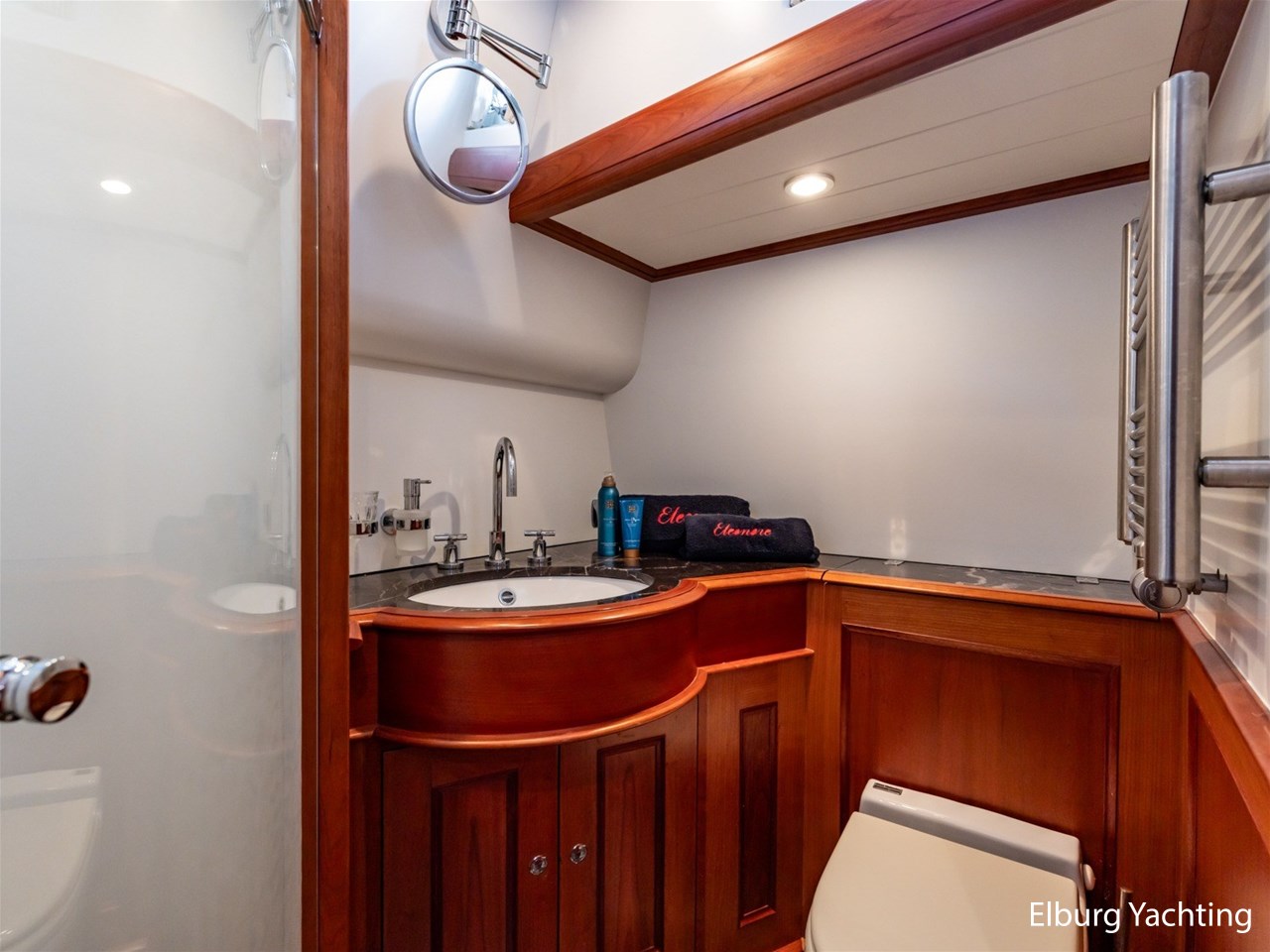 De Mulder Classic 77- Eleonore heeft 2 gastenhutten achterin. De eerste gastenhut beschikt over een ruim tweepersoons bed, de tweede gastenhut heeft twee eenpersoonsbedden. Beide gastenhutten beschikken over een eigen badkamer. De badkamers zijn voorzien van marmeren vloeren en topbladen. Het jacht beschikt over een tendergarage met hydraulische deur, Ankreo Spudpaal, onderwaterverlichting, elektrisch klapbare mast, Mastervolt Powersysteem control panel, Miele wasmachine 2105 en een Miele droger T8403, Fire pro automatische brandblusinstallatie in de machinekamer, r.v.s. reling + teakhouten potdeksel. Het jacht heeft een zeer ruim achterdek met een vaste dinette die uitermate geschikt is om met een groter gezelschap te genieten tijdens een prachtige vaartocht, wel is het mogelijk om in contact te blijven met de kapitein. Een ruime en overzichtelijke stuurstand met 2 persoons vaarbank, aansluitend een buitenbar met marmeren topblad.