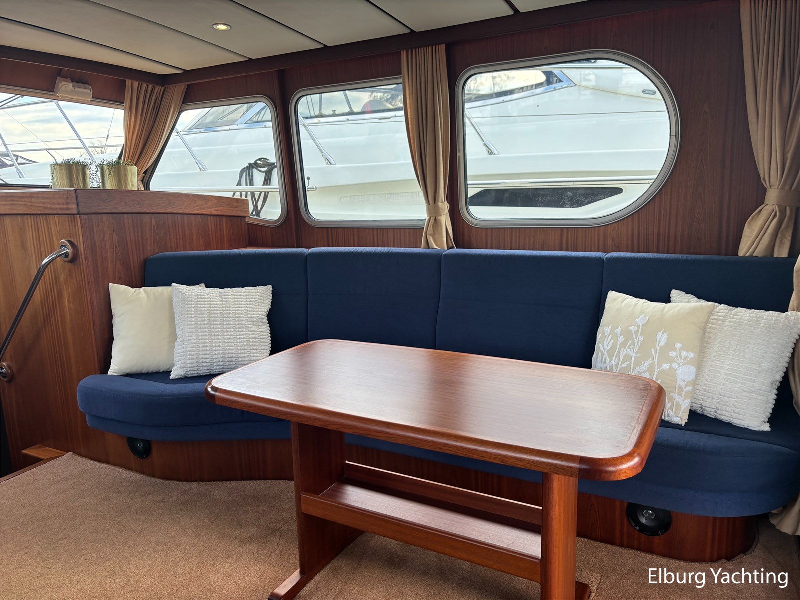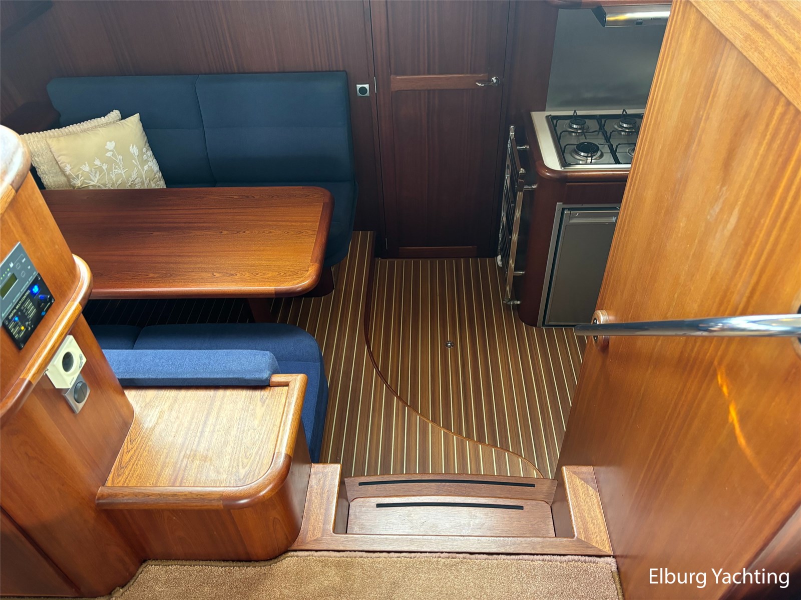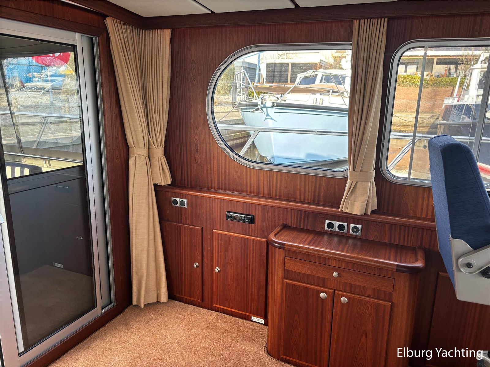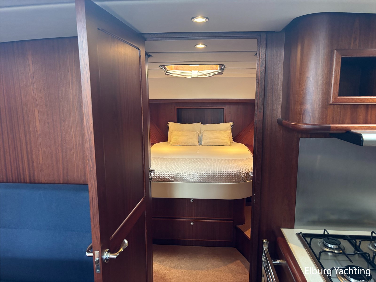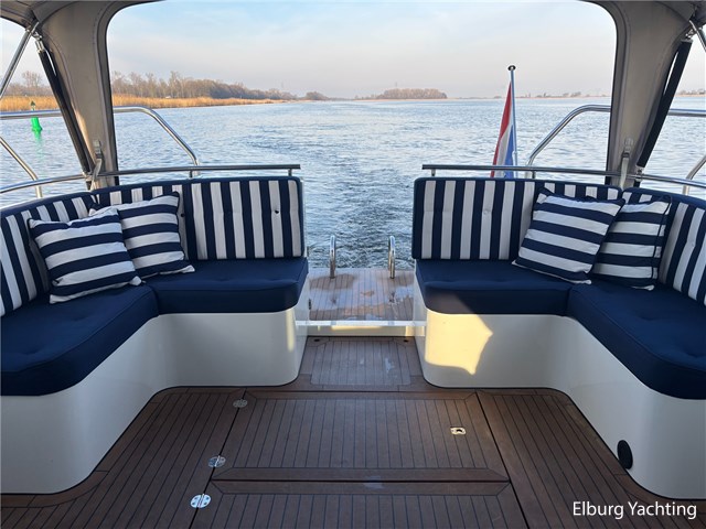 Bij de stuurstand heeft u goed overzicht door de raampartij, Het jacht is voorzien van een Sidepower afstandsbediening waardoor het jacht goed te manoeuvreren is. Vanaf de salon loopt u door middel van een trap naar beneden waar u aan de bakboord kant een ruime dinette vindt, en daar tegenover de kombuis. Als u rechtdoor loopt vindt u de eigenaars hut die voorzien is van een tweepersoons frans bed. Aangrenzend vindt u een douche in eigen cabine en een elektrisch toilet in eigen cabine. Vanuit de kombuis vindt u de gasten hut die is voorzien van een tweepersoons bed.