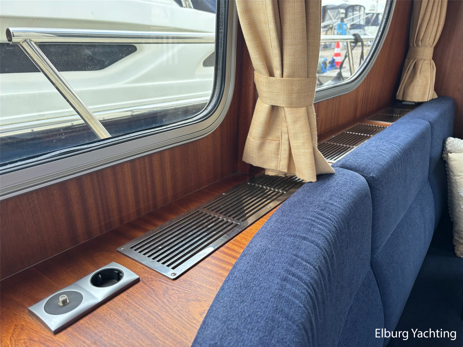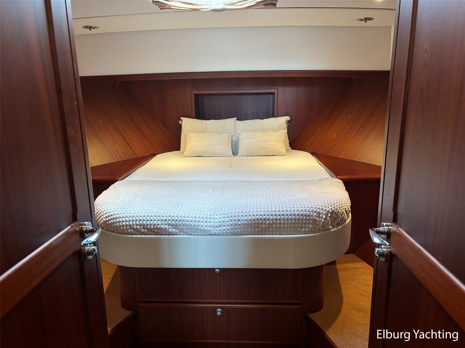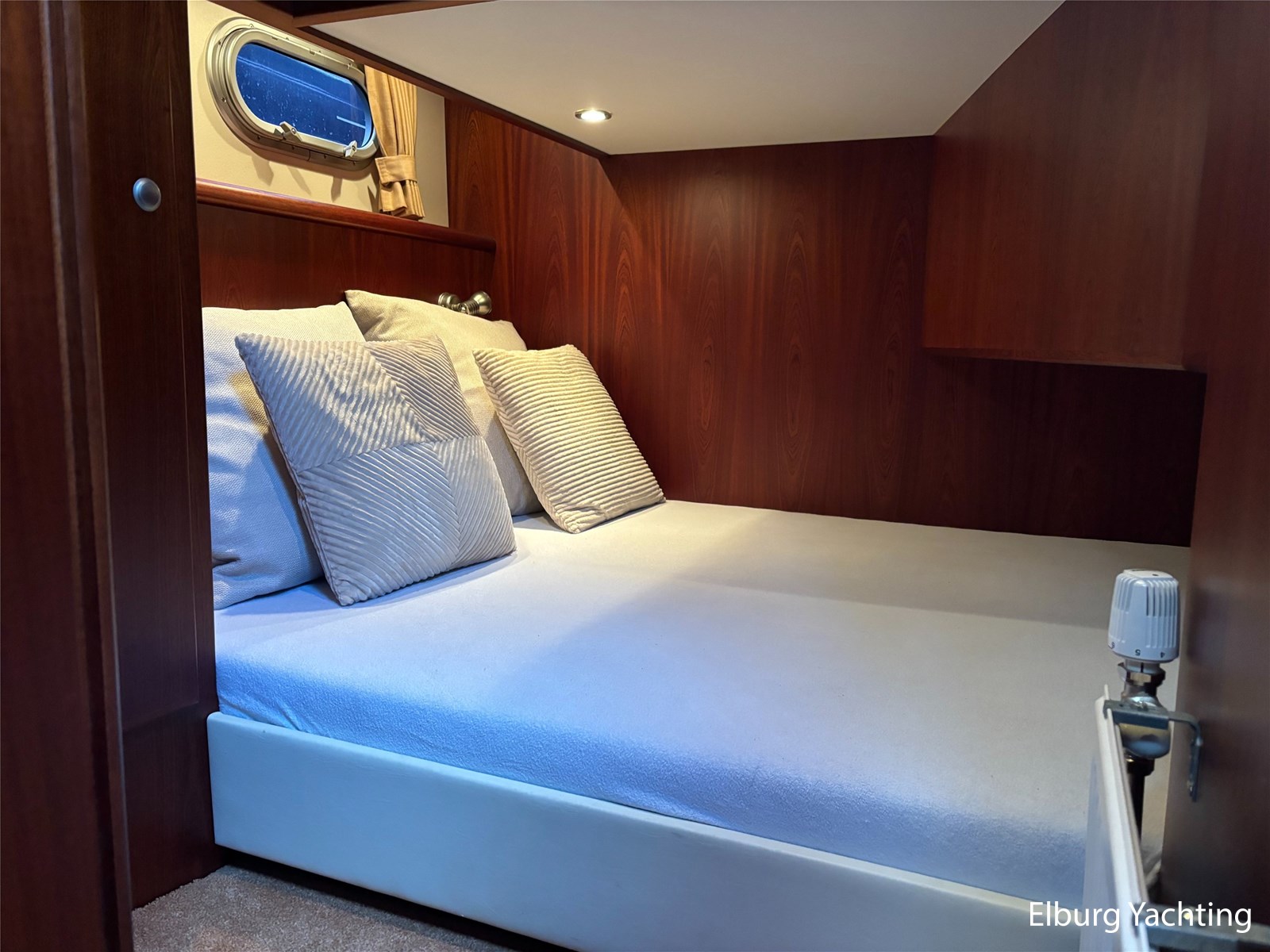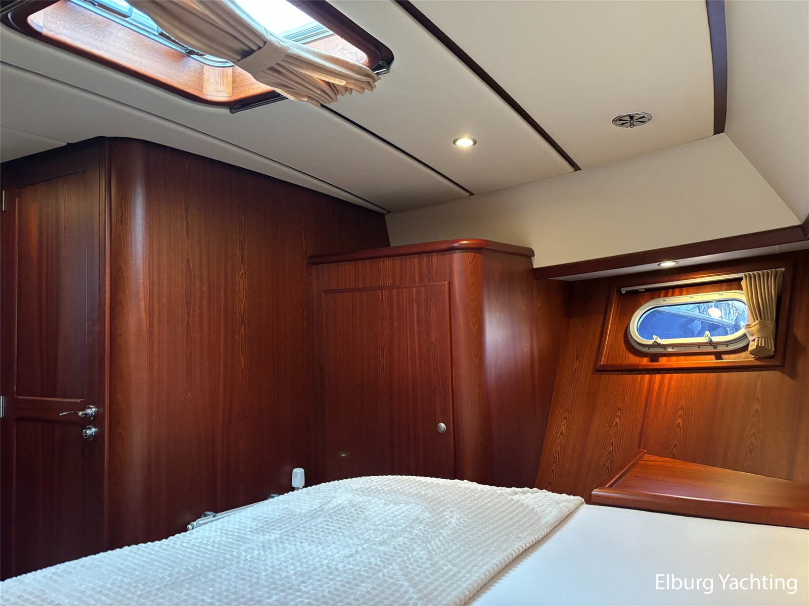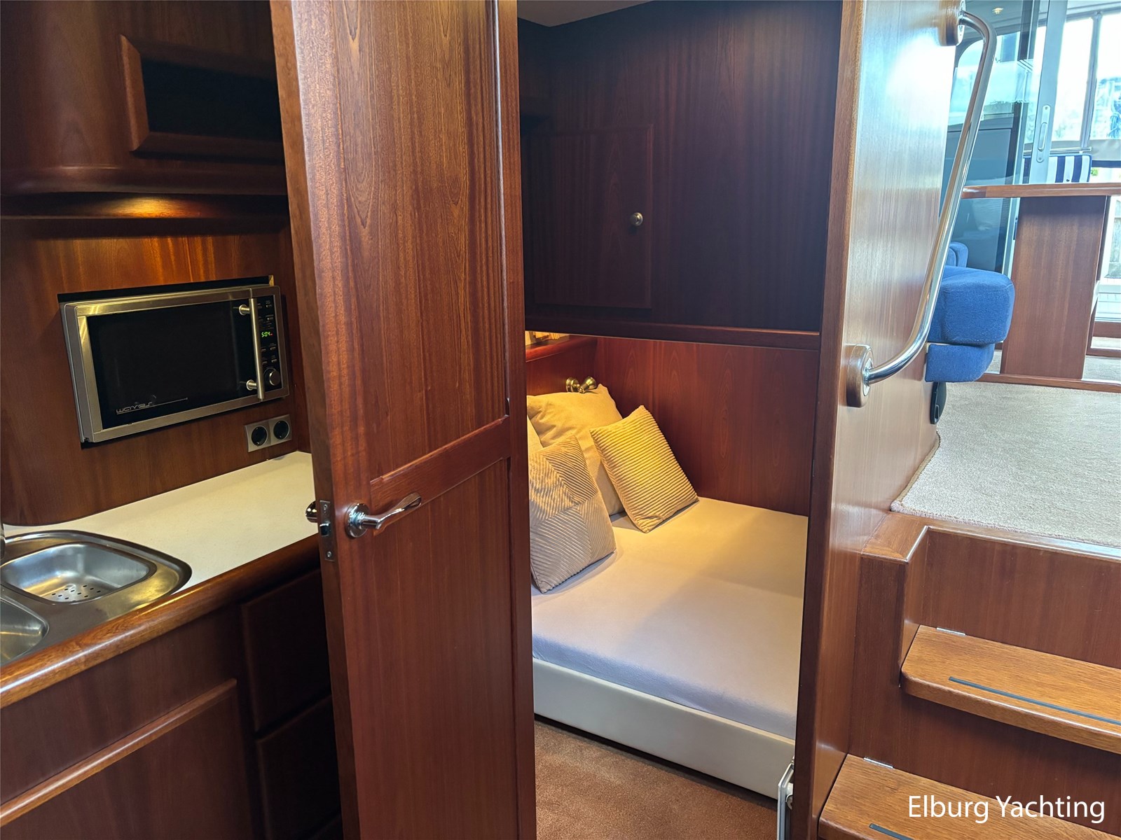 Bij de stuurstand heeft u goed overzicht door de raampartij, Het jacht is voorzien van een Sidepower afstandsbediening waardoor het jacht goed te manoeuvreren is. Vanaf de salon loopt u door middel van een trap naar beneden waar u aan de bakboord kant een ruime dinette vindt, en daar tegenover de kombuis. Als u rechtdoor loopt vindt u de eigenaars hut die voorzien is van een tweepersoons frans bed. Aangrenzend vindt u een douche in eigen cabine en een elektrisch toilet in eigen cabine. Vanuit de kombuis vindt u de gasten hut die is voorzien van een tweepersoons bed.