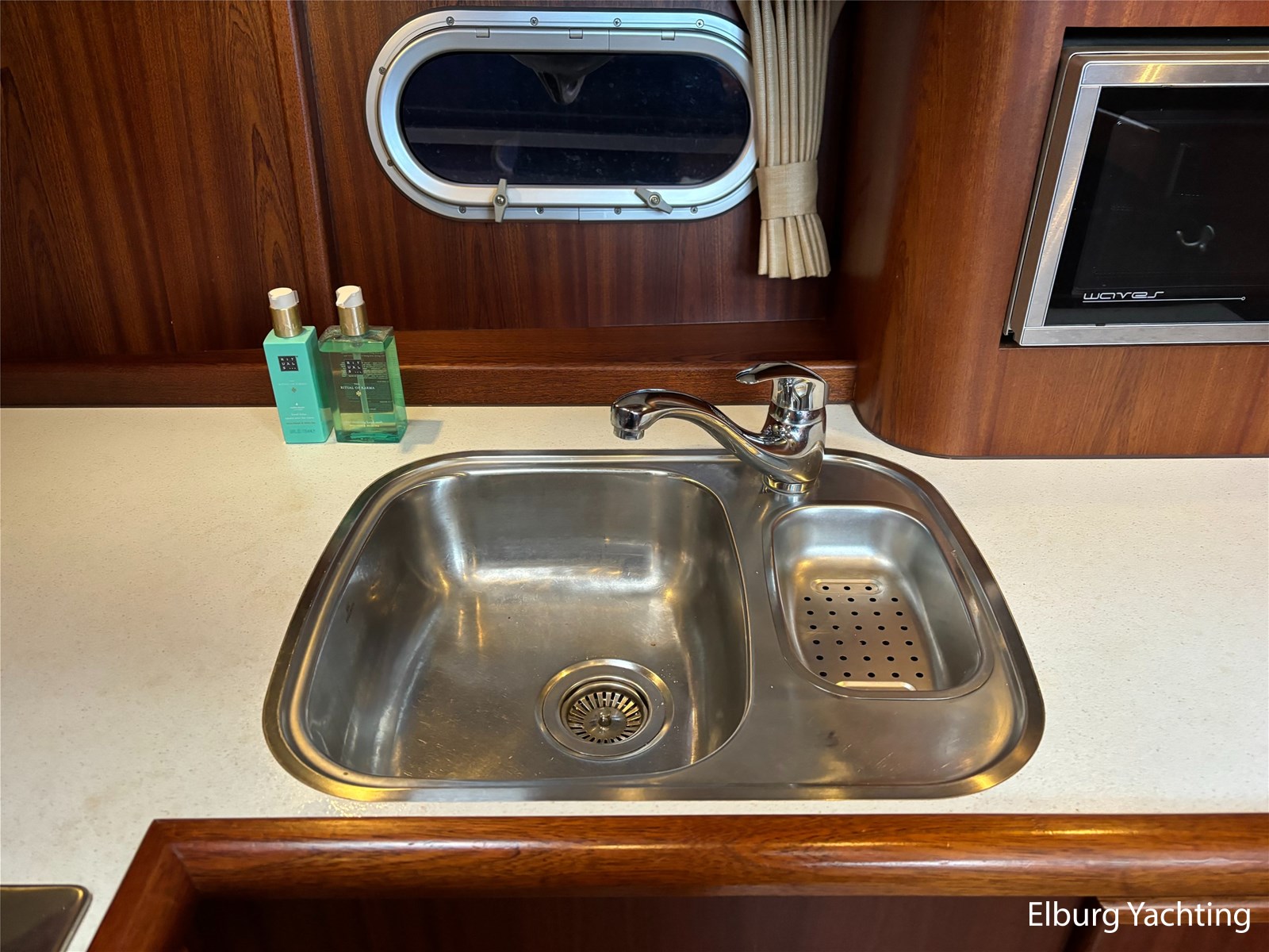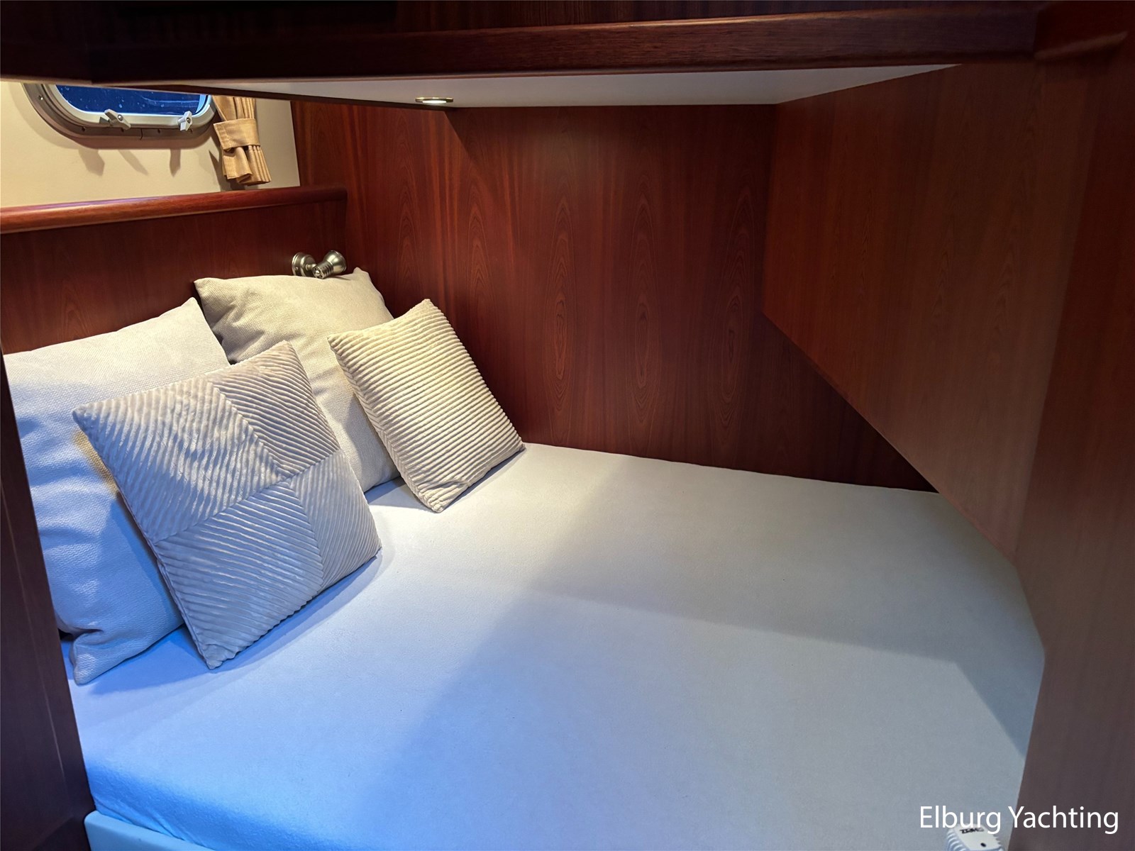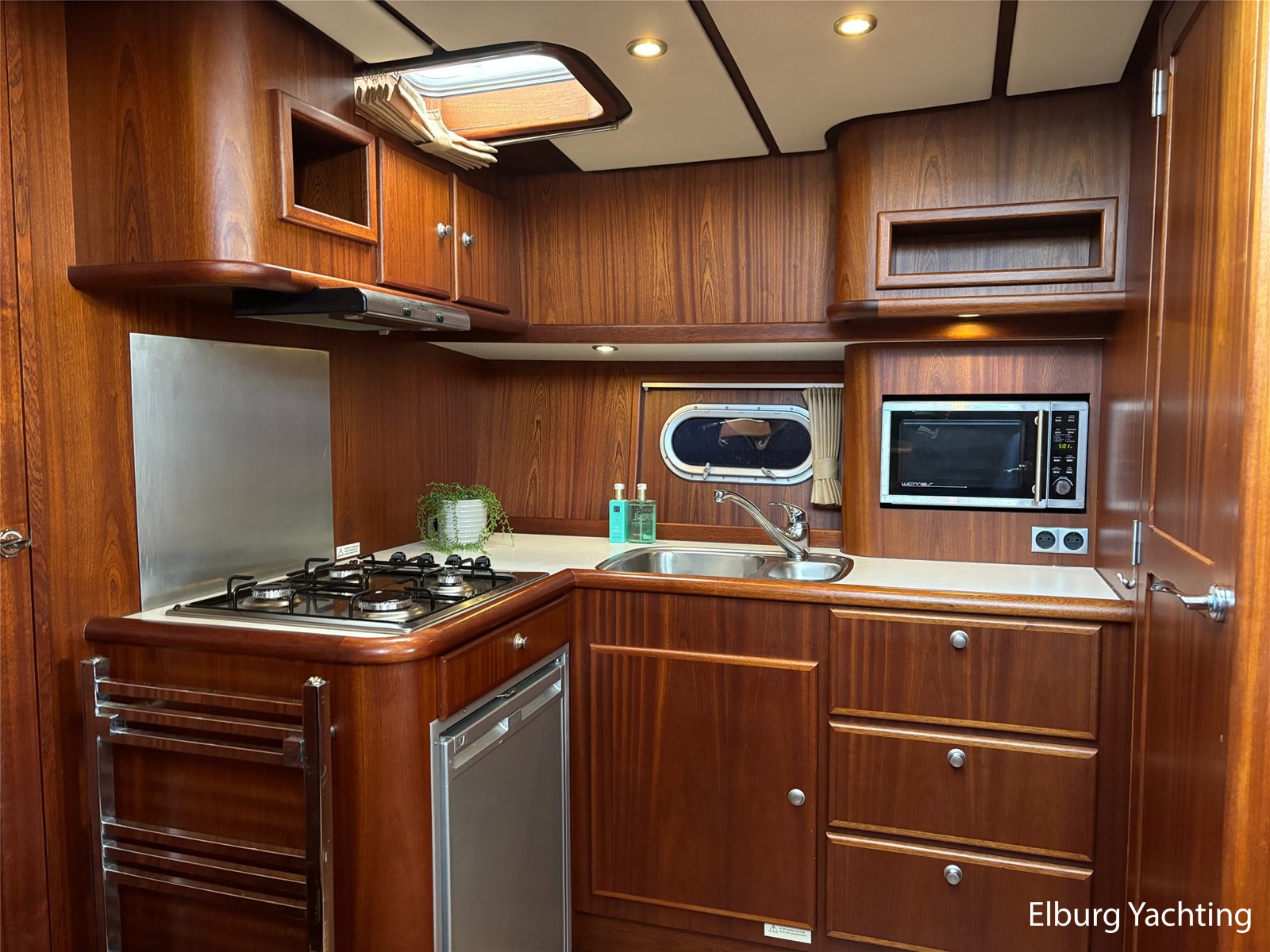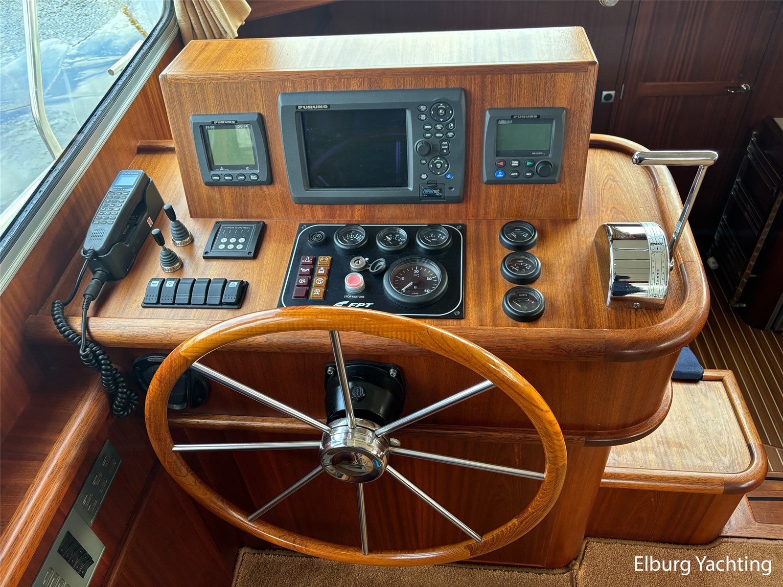Bij de stuurstand heeft u goed overzicht door de raampartij, Het jacht is voorzien van een Sidepower afstandsbediening waardoor het jacht goed te manoeuvreren is. Vanaf de salon loopt u door middel van een trap naar beneden waar u aan de bakboord kant een ruime dinette vindt, en daar tegenover de kombuis. Als u rechtdoor loopt vindt u de eigenaars hut die voorzien is van een tweepersoons frans bed. Aangrenzend vindt u een douche in eigen cabine en een elektrisch toilet in eigen cabine. Vanuit de kombuis vindt u de gasten hut die is voorzien van een tweepersoons bed.