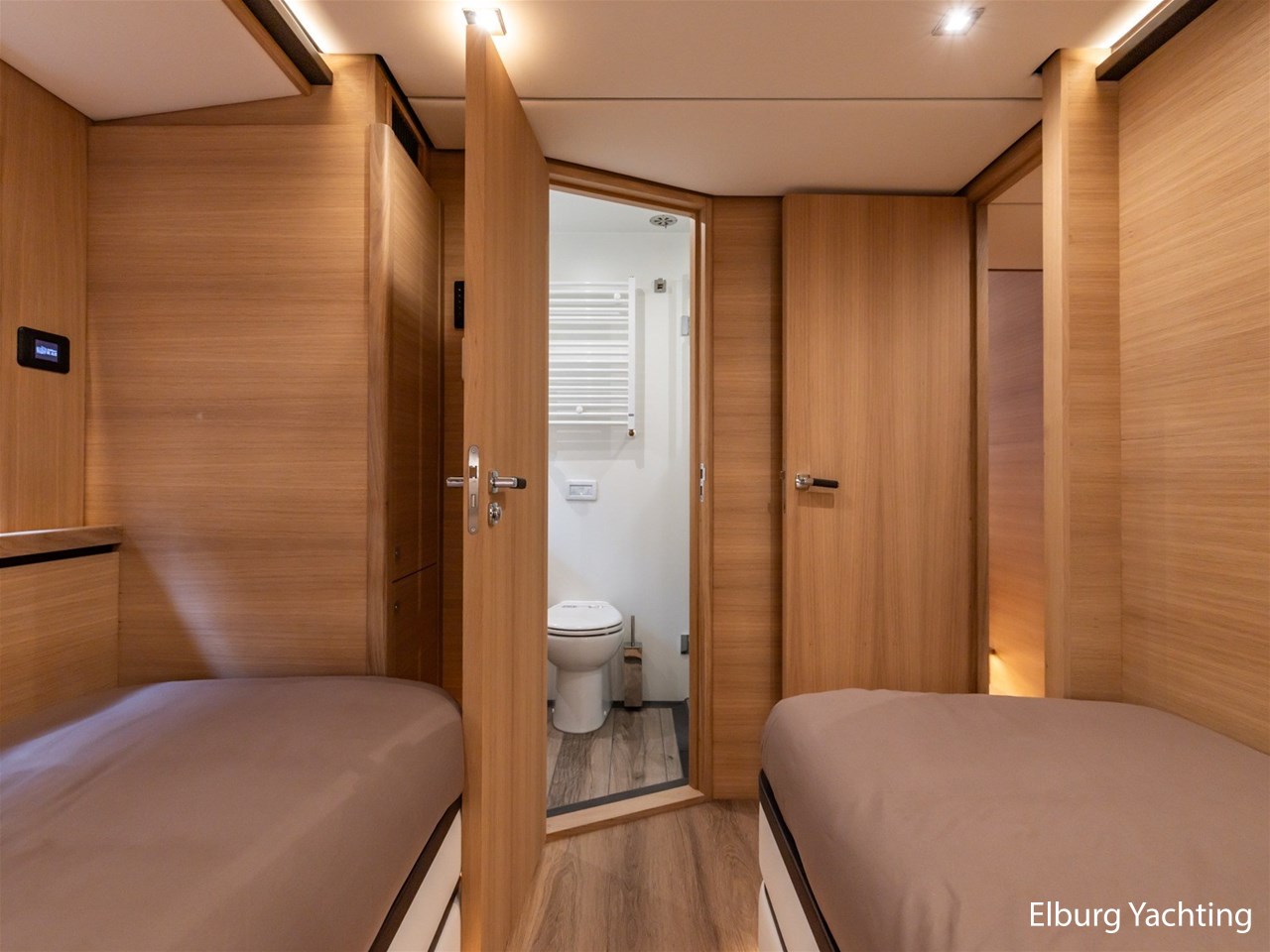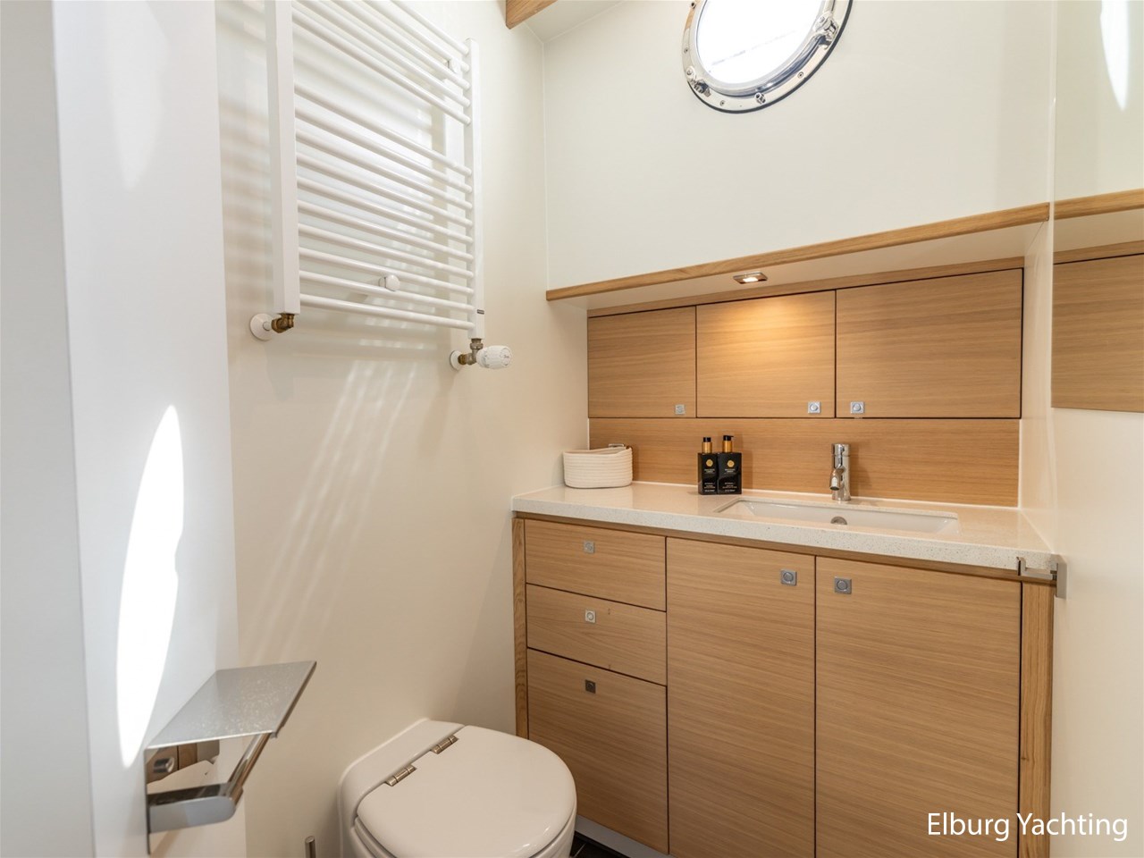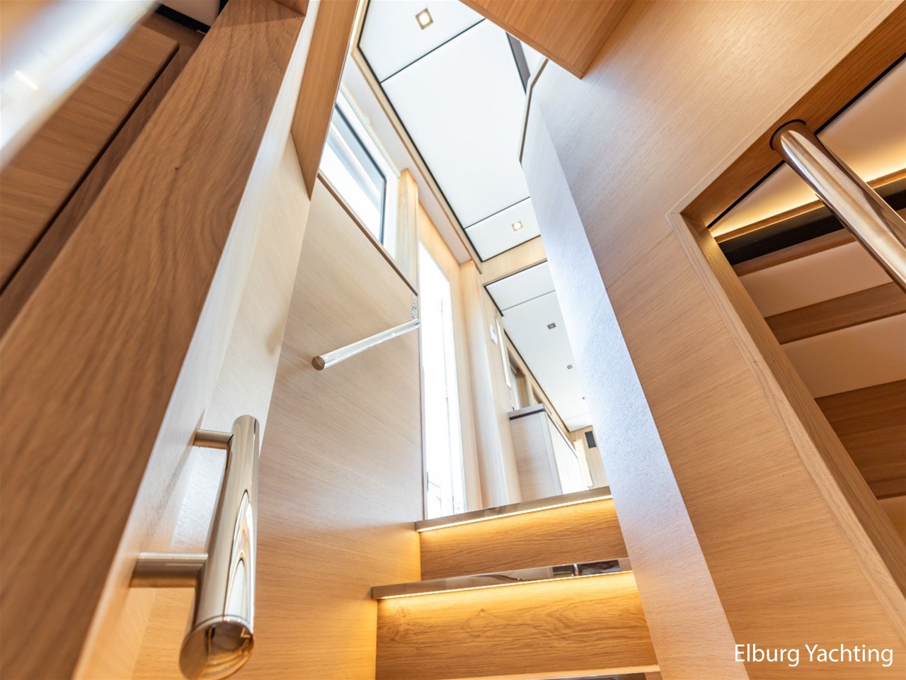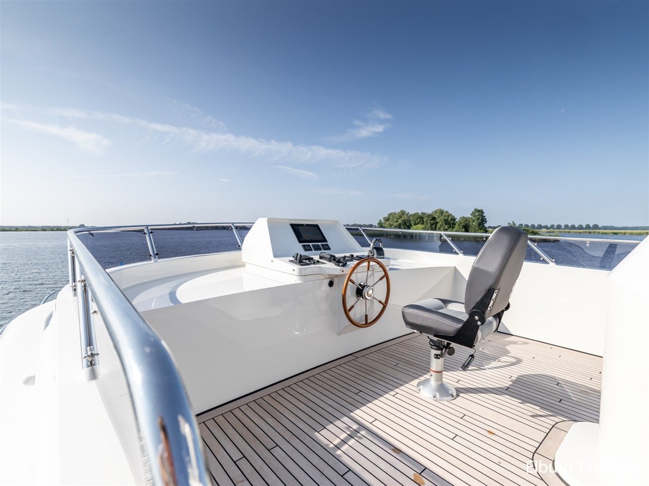 Aan boord valt direct het oog voor ruimte en design op. Het jacht is zeer ruimtelijk vormgegeven met veel hoogte (stahoogte salon ruim 2 meter). Het moderne eiken interieur in combinatie met de p.v.c. vloer (voorzien van vloerverwarming) is vakkundig tot stand gekomen en zorgt voor een aangename omgeving. Naast de centrale verwarming is het jacht voorzien van airconditioning in alle hutten, de salon en het stuurhuis. Het jacht beschikt over drie volwaardige hutten met in de eigenaarshut een ruim dubbel vrijstaand bed en on suite badkamer (lengte ca. 2 meter), aan bakboord twee enkele bedden (lengte ca. 2 meter) en aan stuurboord een ruim dubbel bed (lengte ca. 2 meter) + een enkel bed.