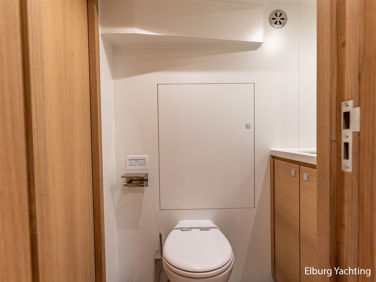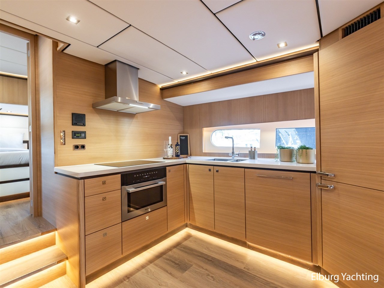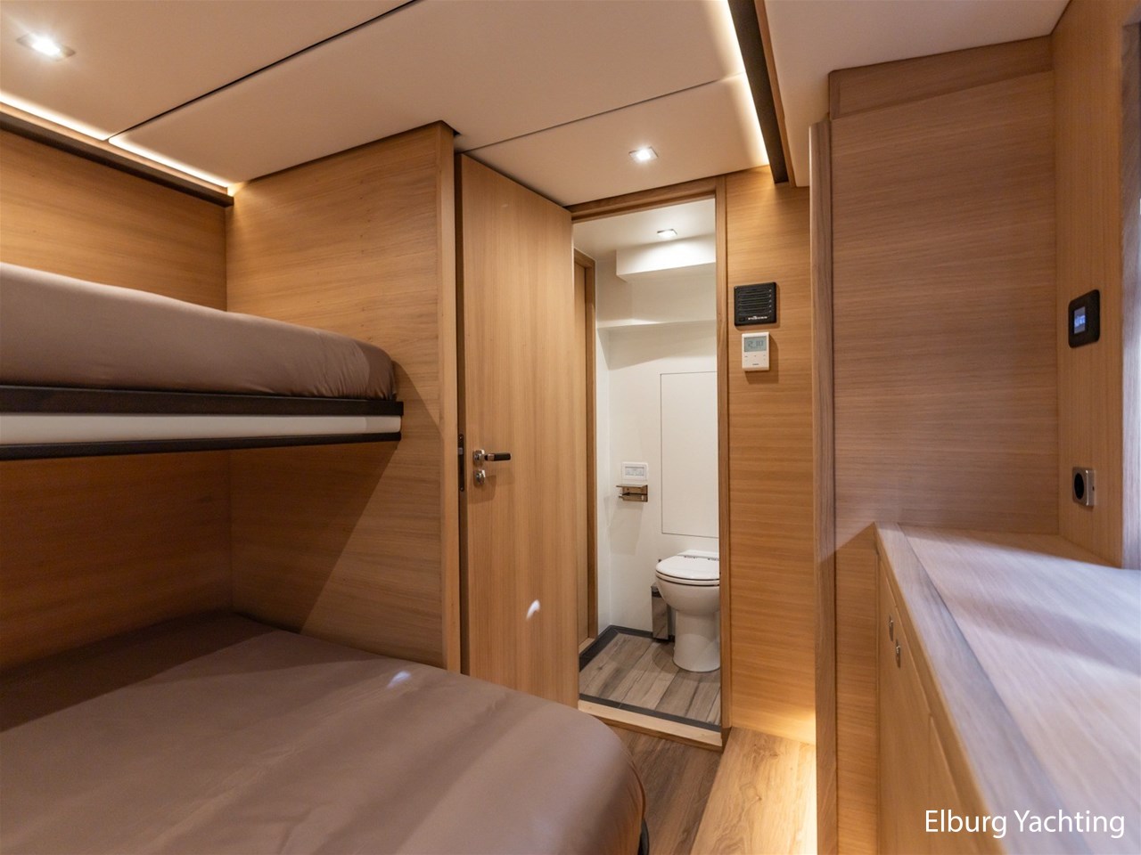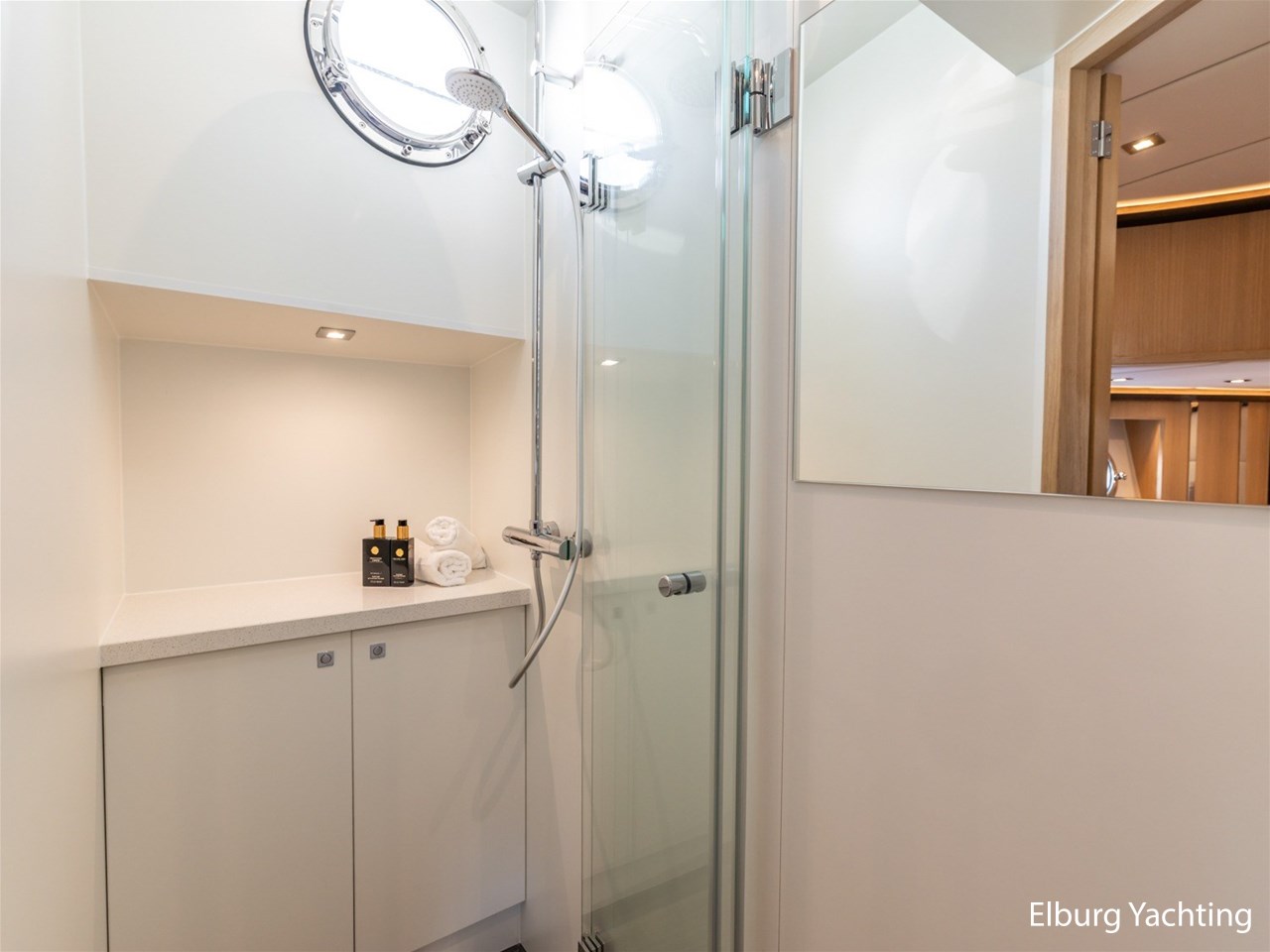 Aan boord valt direct het oog voor ruimte en design op. Het jacht is zeer ruimtelijk vormgegeven met veel hoogte (stahoogte salon ruim 2 meter). Het moderne eiken interieur in combinatie met de p.v.c. vloer (voorzien van vloerverwarming) is vakkundig tot stand gekomen en zorgt voor een aangename omgeving. Naast de centrale verwarming is het jacht voorzien van airconditioning in alle hutten, de salon en het stuurhuis. Het jacht beschikt over drie volwaardige hutten met in de eigenaarshut een ruim dubbel vrijstaand bed en on suite badkamer (lengte ca. 2 meter), aan bakboord twee enkele bedden (lengte ca. 2 meter) en aan stuurboord een ruim dubbel bed (lengte ca. 2 meter) + een enkel bed.