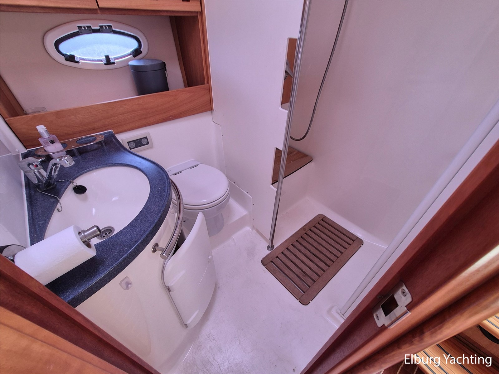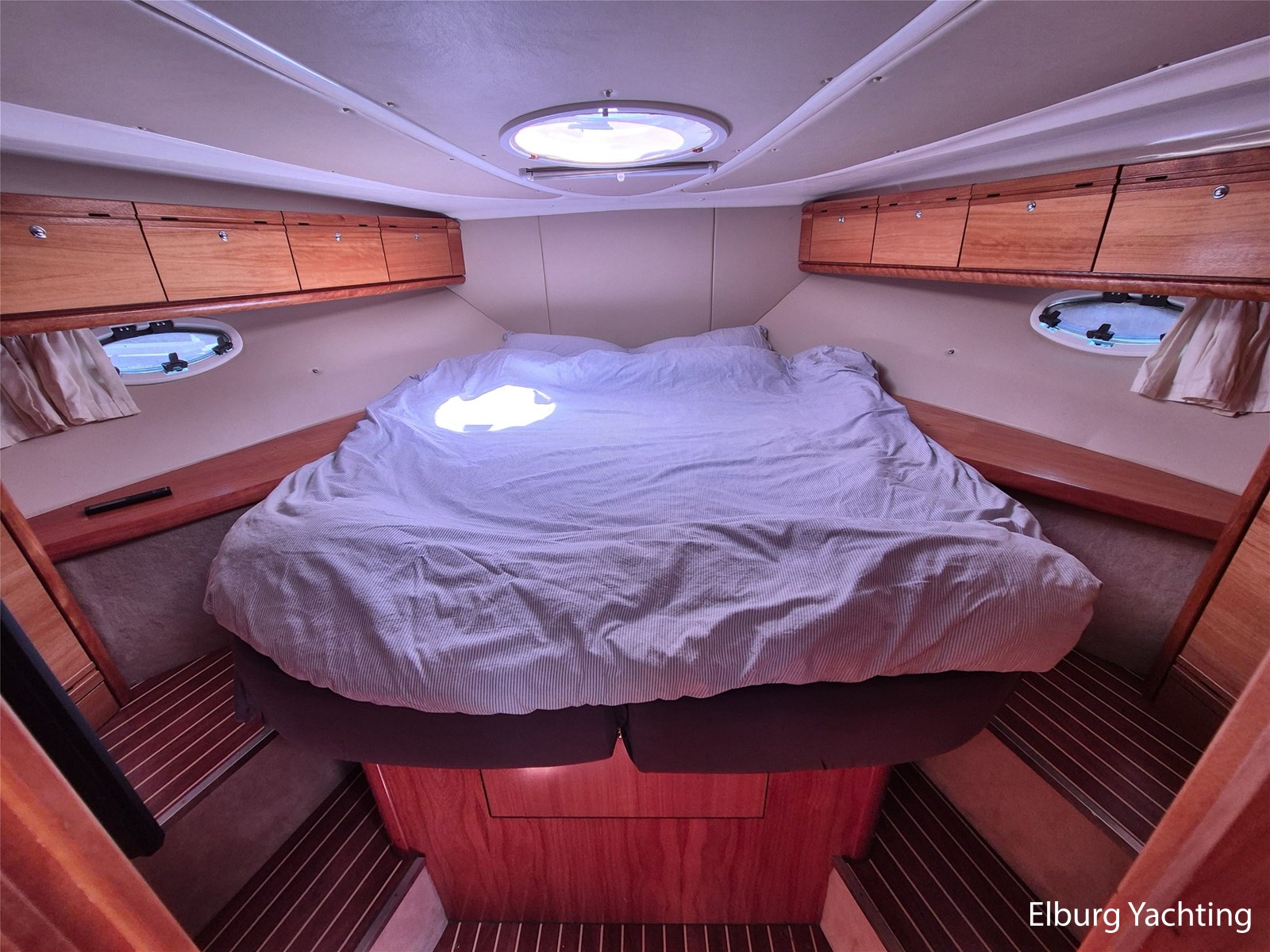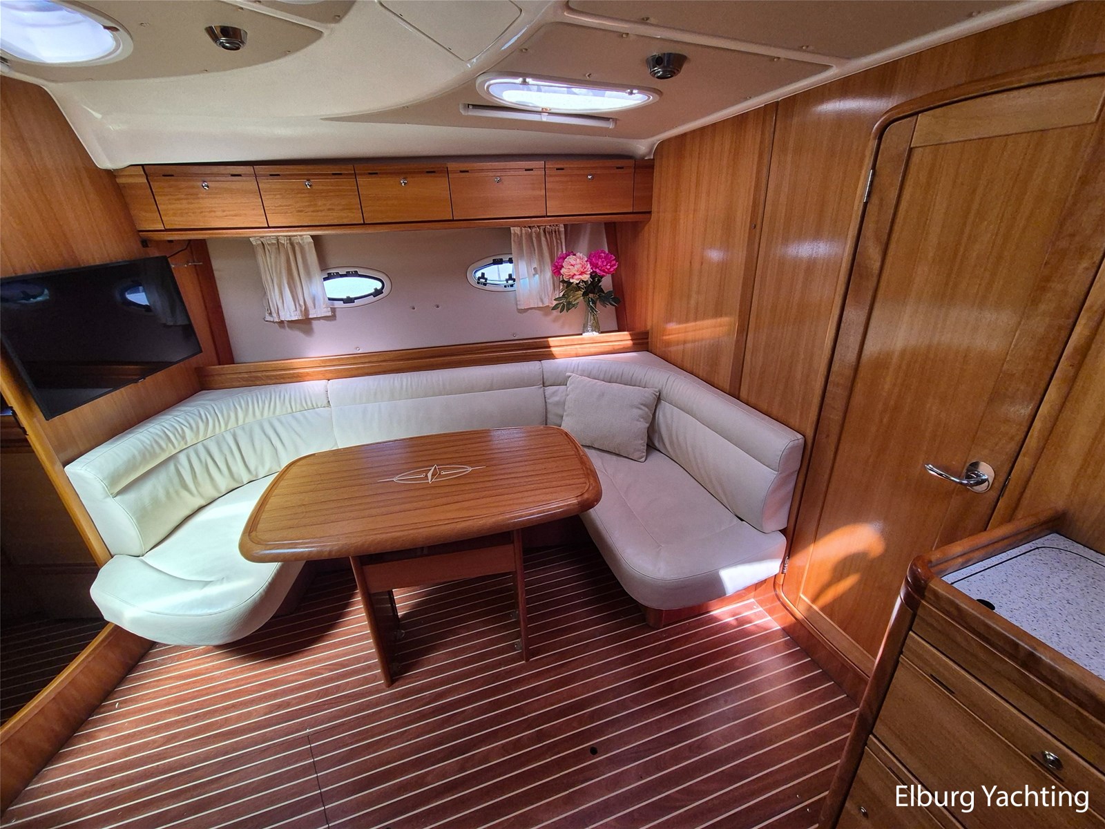 De indeling is praktisch met een fijne dinette met vaste tafel en handige kombuis met veel bergruimte, inductiekookplaat, dubbele spoelbak, magnetron/oven en ruime koelkast met vriesvak. Verder is ze voorzien van 2 ruime hutten (2 persoons vrijstaand Frans bed in de voorkajuit + 2 enkele bedden in de ruime achterkajuit) en een royale natte cel met elektrisch toilet, wastafel en grote afsluitbare douchekabine.
