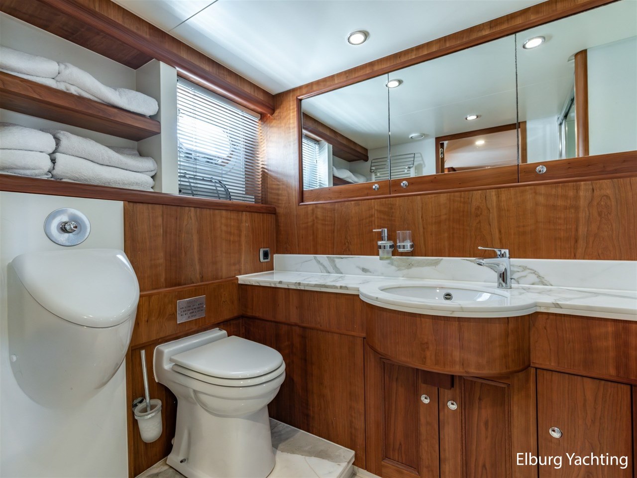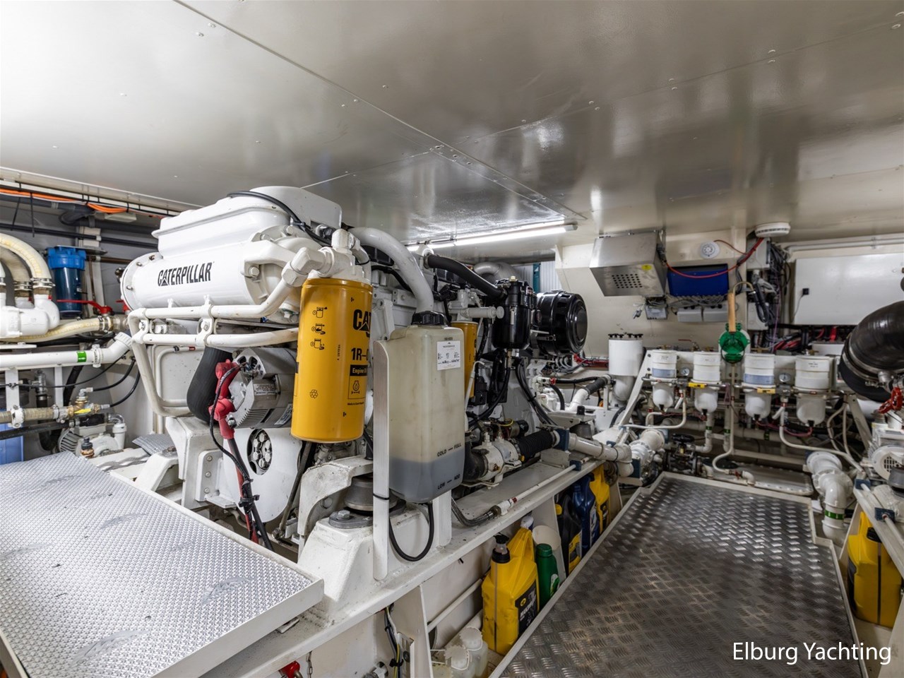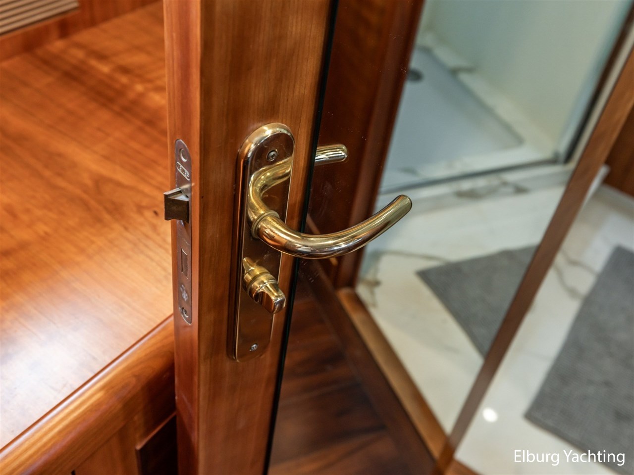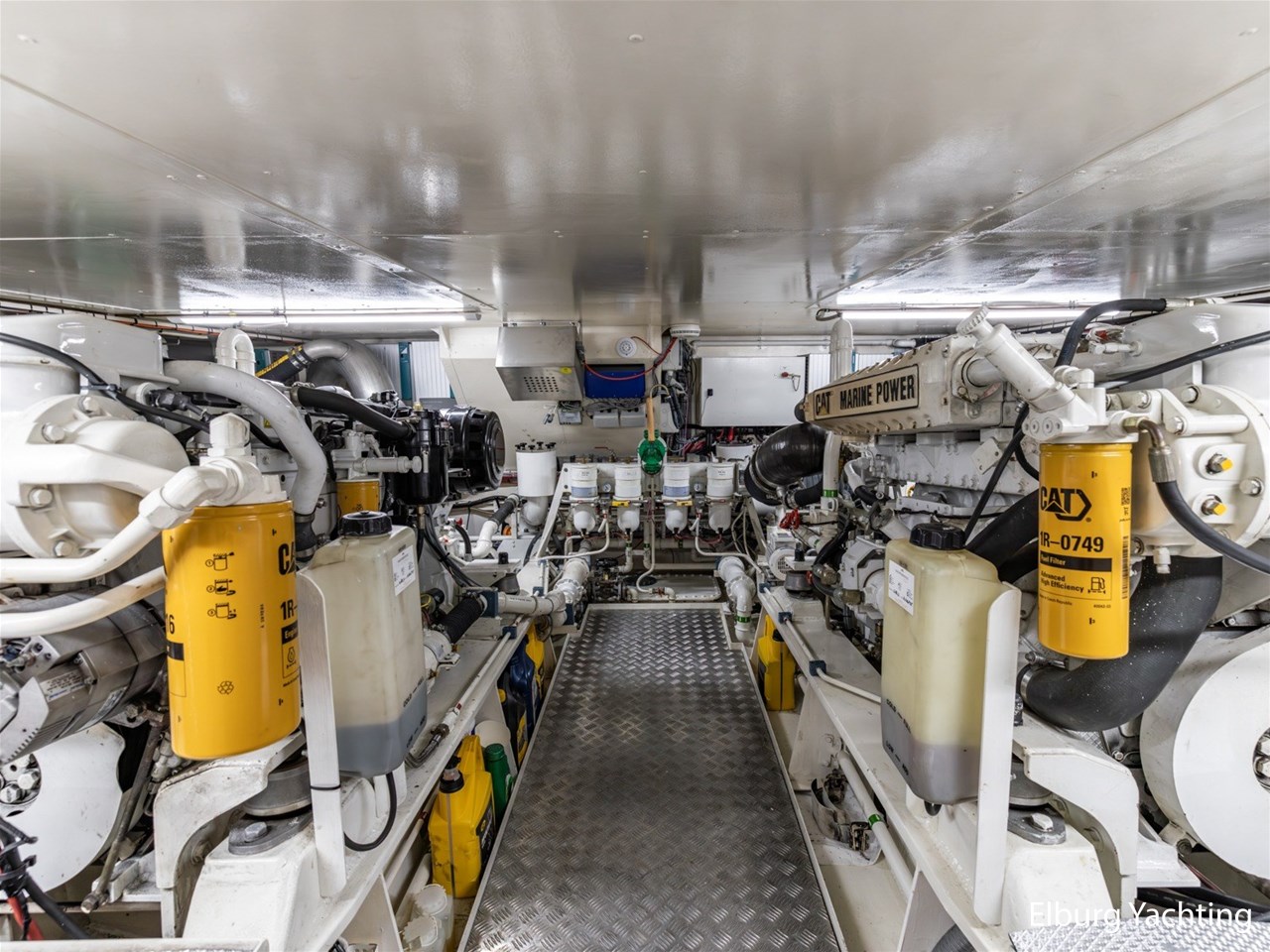 Het jacht beschikt over 3 luxe hutten en een crew cabin. Het interieur in kersenhout en wengé vloer, in combinatie met moderne technologie: Raymarine Axiom-systeem, Naiad stabilisatie, hydraulische transomdeur, passerelle, airconditioning en generatorsets. De brandstoftanks van ca. 7.200 L en vers watercapaciteit van ca. 2.500L garanderen lange zeereizen met comfort.
