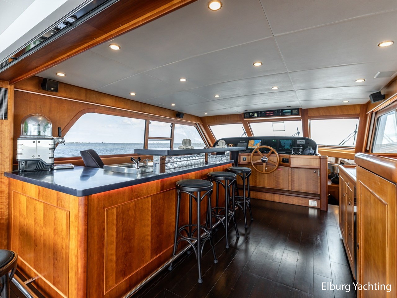 Exclusief in stijl gebouwde bar voor de verbinding tussen achterdek en stuurhut. diverse koelkasten, muziekinstallatie aan boord. Zeer rijk uitgeruste stuurstand, ruime salon met grote U-dinette, 2 x poef, TV op lift., veel daglicht, veel opbergruimte, ruime keuken met zicht naar buiten, granieten keukenblad, Miele keuken apparatuur, vaatwasser, 2 x Liebherr,koelkast, 1 x kantoor in aparte cabin. De Mulder 73 Wheelhouse Alu Fast Going heeft een ruime mastercabin met 2 pers. kingsize bed vrijstaand met veel opbergruimte en grote badkamer en-suite met toilet en urinoir. Er is een guestcabin met een 2 pers. bed vrijstaand en badkamer en-suite, 1 guest cabin met 2 x 1 pers bed als een half overlappend stapelbed, TV in salon + stuurhuis en achterhut, 2-persoons crew cabine met eigen ingang