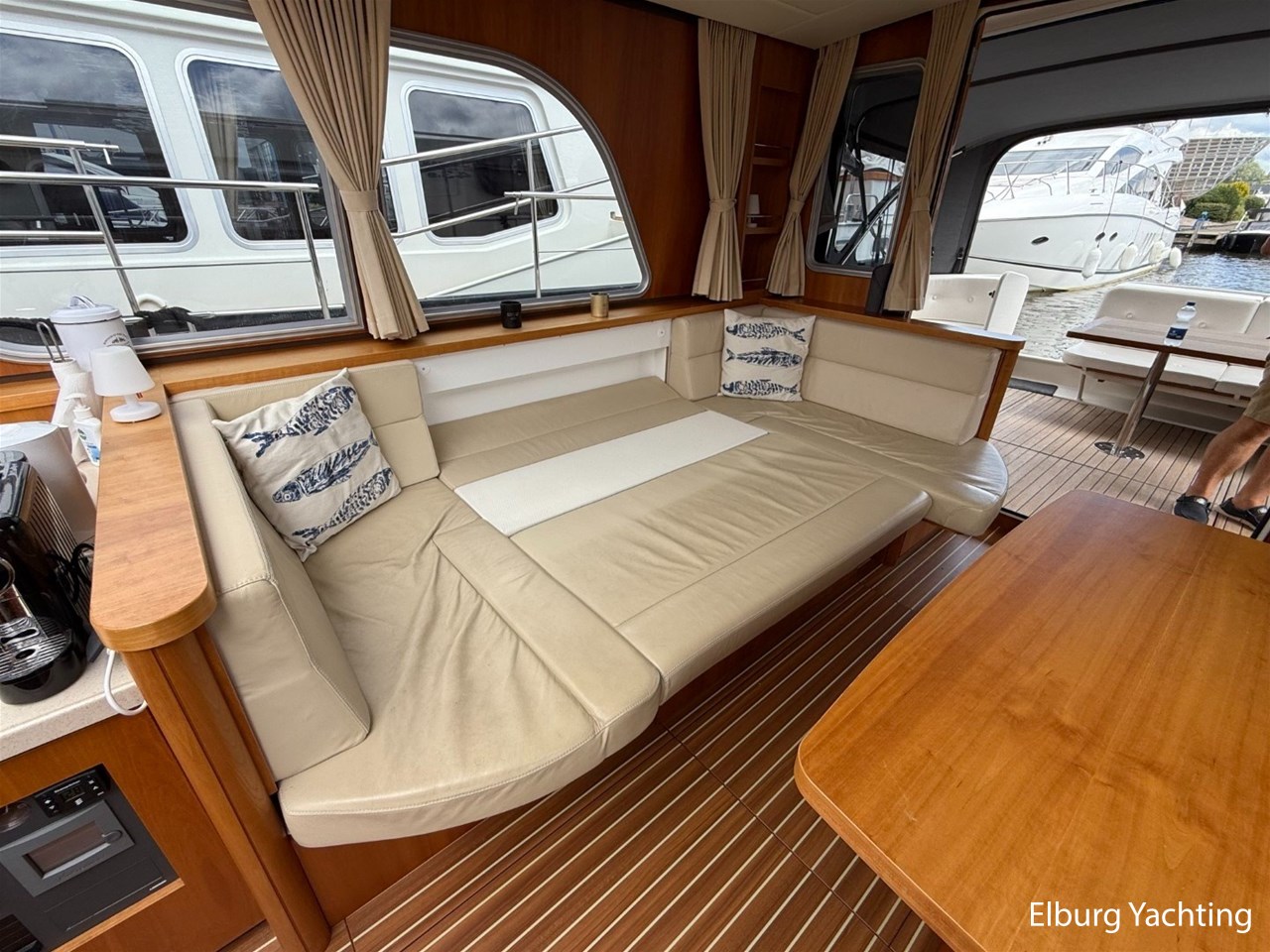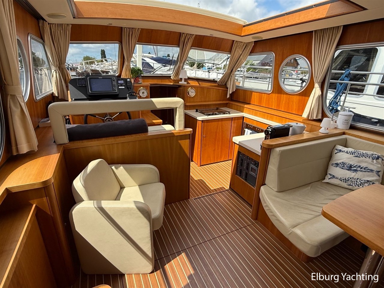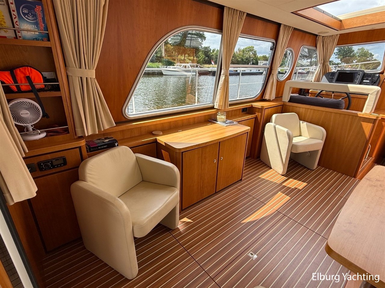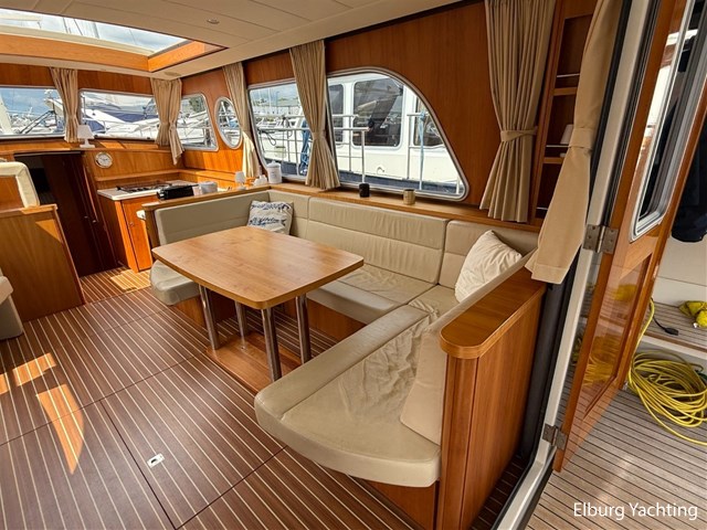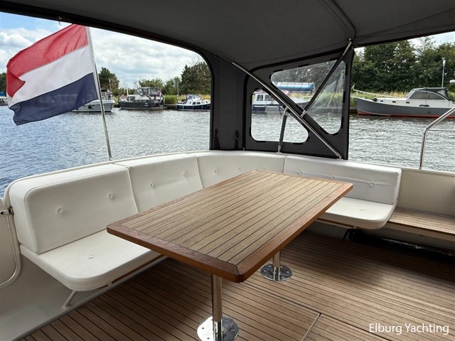 Het Sedan model kenmerkt zich met de ruime Open kuip met luxe kussens en een grote vaste Teakhouten tafel. Via deze royale kuip beweegt u zich comfortabel naar de gelijkvloerse Salon met royale U-bank (welke uit te schuiven is tot een 2 persoons bed) met daartegenover 2 comfortabele fauteuils. Aan bankboordzijde is de stuurstand gesitueerd met ruime bank voor twee personen. Boven de stuurstand is een fraai schuifdak gemonteerd voor het ultieme buitengevoel. Verder naar voren is de Kombuis gesitueerd met royale koelkast, 3 pits kooktoestel, elektrische combi oven/magnetron. Voorin is de eigenaarshut met dubbel bed, aan bakboord de gastenhut met twee enkele bedden en aan stuurboord de aparte toilet en de aparte douche met mogelijkheid tot het inbouwen van een wasmachine. Voor vragen en/of het maken van een afspraak bent u 7 dagen per week van harte welkom bij Elburg Yachting.
