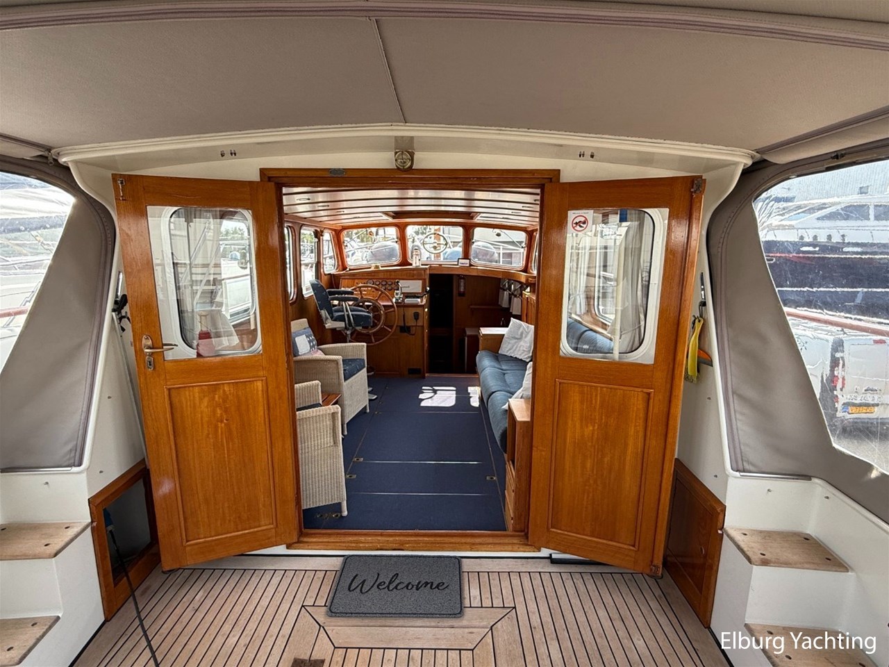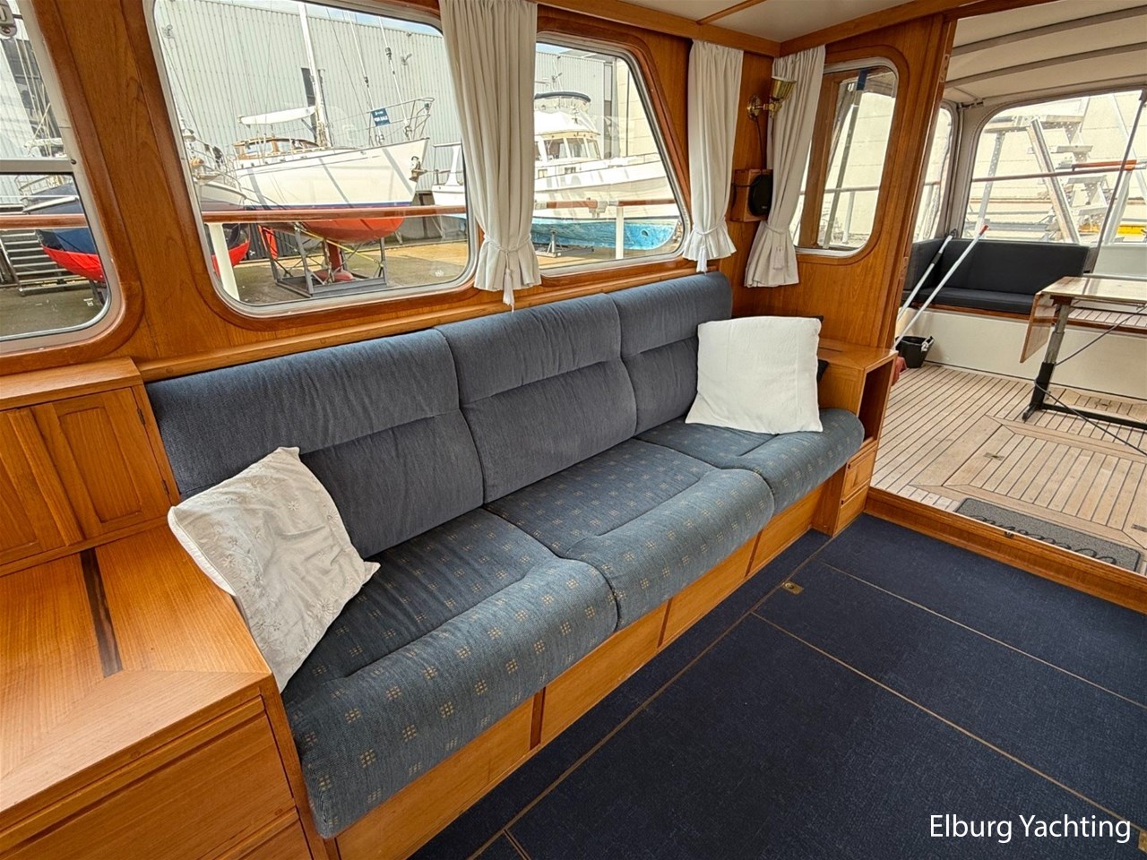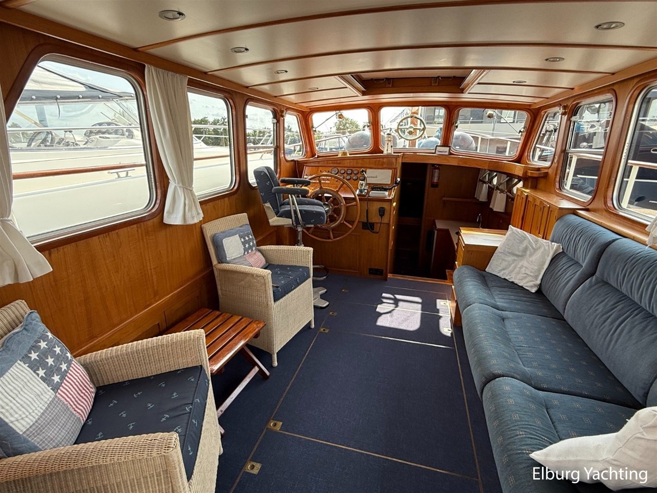 - Scheeps Teakhouten interieur met blauwe bekleding en recente blauwe vloerbedekking