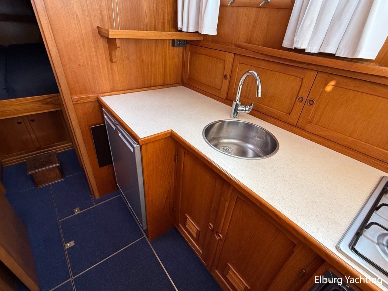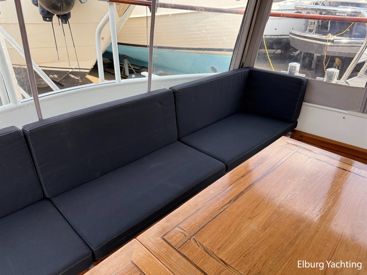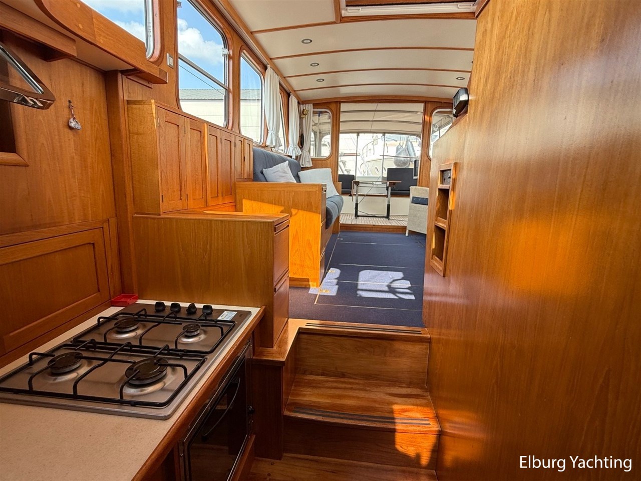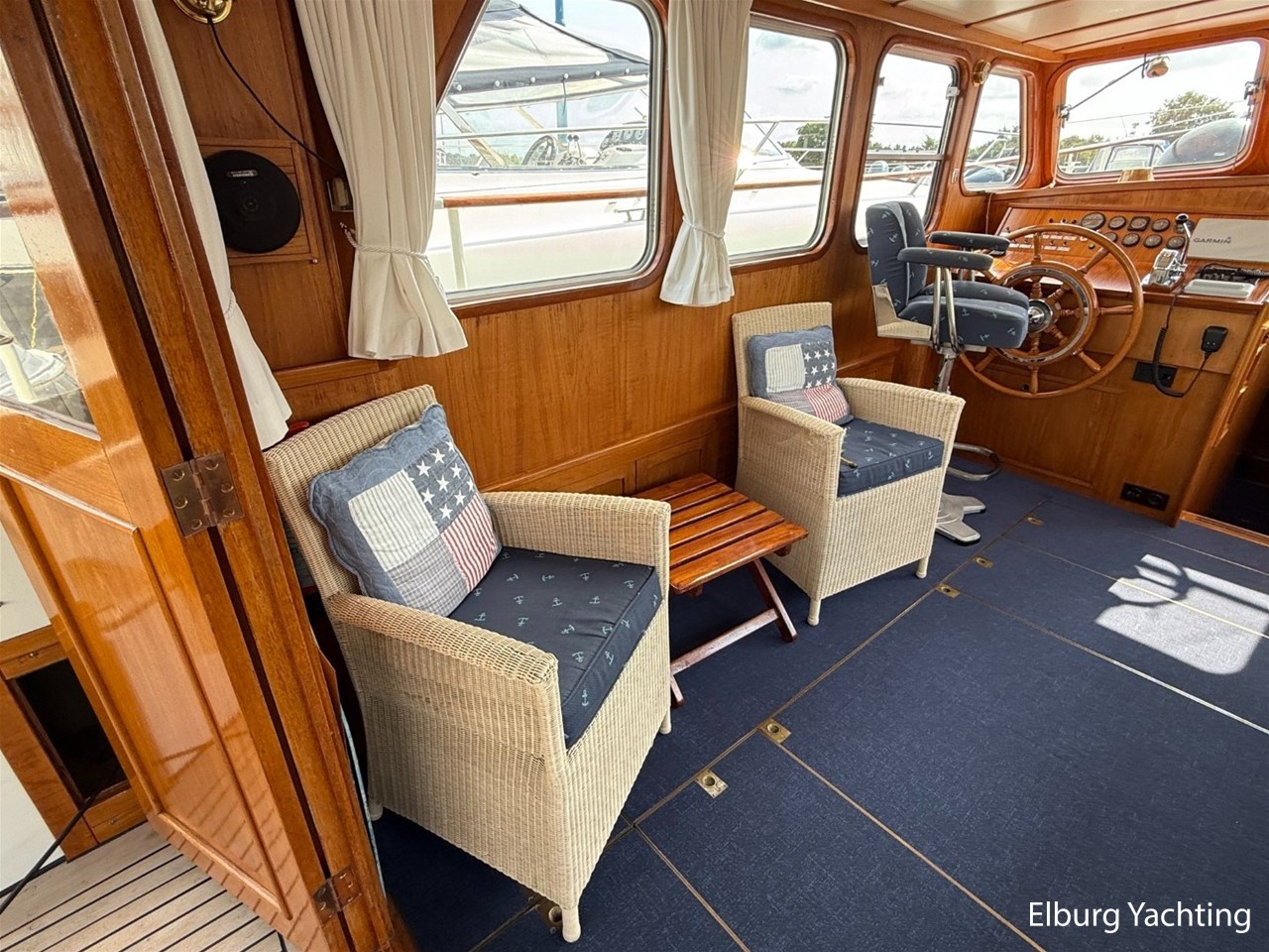 - Scheeps Teakhouten interieur met blauwe bekleding en recente blauwe vloerbedekking