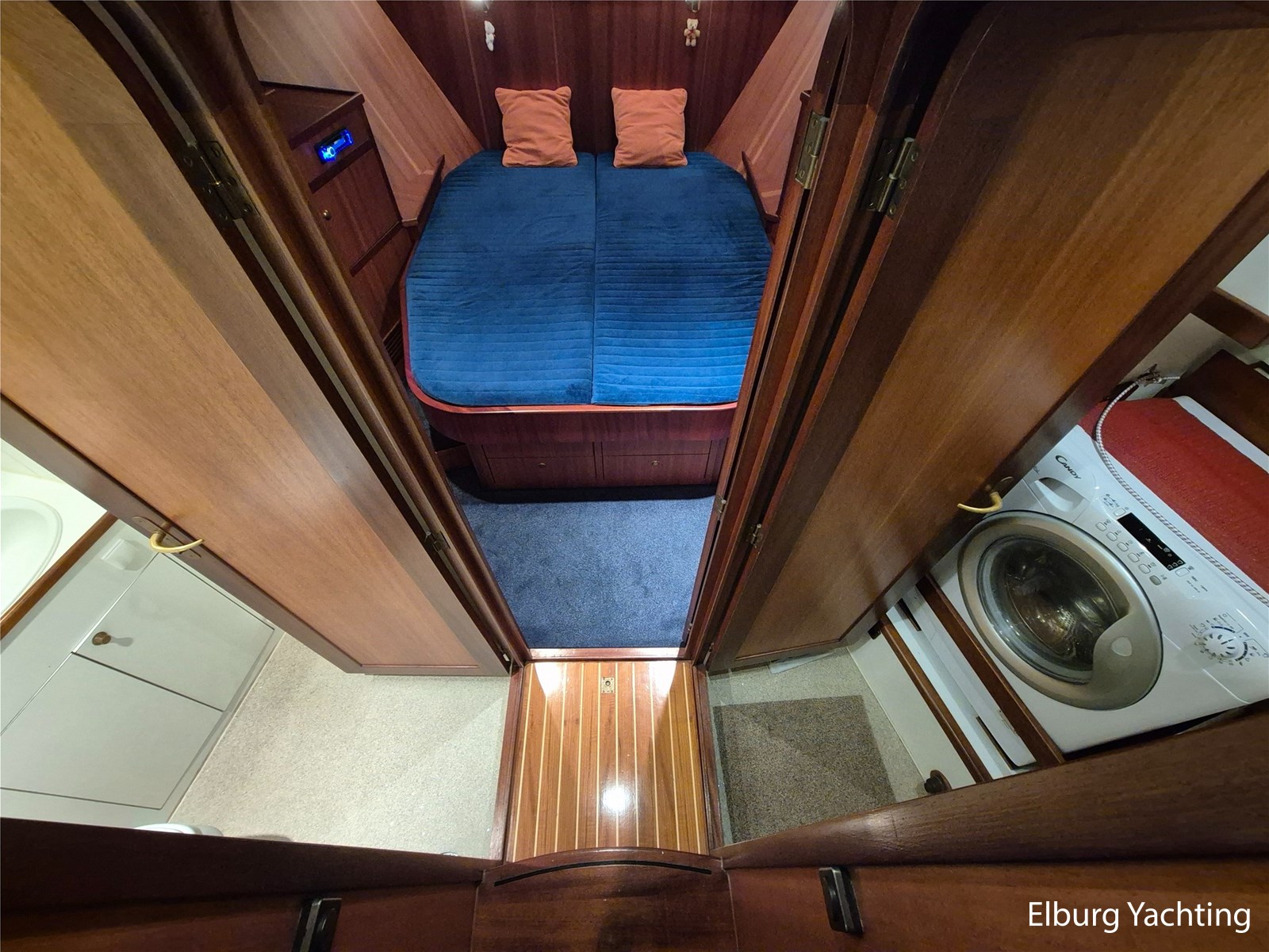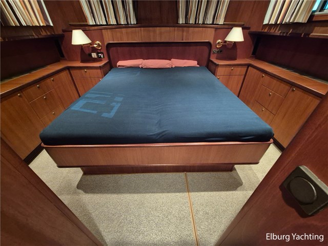 Verder voorzien van o.a. een complete tent over het achterdek, met uitritsbare delen, salon voorzien van dakluik en muggenhorren, voorkajuit in 2015 omgebouwd naar frans bed met veel opbergruimte, ventilatieroosters onder de bedden, blindering (geheel gewassen en nagelopen zomer 2025), een hydraulisch klapbare mast, Intellion TV (2015), Wasdroger Candy (2015), blindering voor alle vensters, dekdouche, twee wateraansluitingen aan dek (voor en achter), davits met bijpassende bijboot, zij-instap in de zeereling en zijdeuren aan weerszijden van de opbouw. Het enorme achterdek kan dienen als buitenruimte of als serre, al naar gelang de wensen van de eigenaar is deze ruimte geheel of gedeeltelijk te overkappen. Diverse bakskisten met goed georganiseerde bergruimte completeren de functionaliteit. Onder een grote hoes loopplanken, schuifhouten voor de franse sluizen, en extra meubilair. Verder: dubbele bolders voor en achter, middenbolder, grote eettafel met stoelen op achterdek, salon voorzien van luxaflex rondom, dakluik, was-droogcombinatie, voorhut met zeer veel kastruimte (essentieel voor verre reizen of wonen aan boord), zeer overzichtelijke motorkamer waarbij alle componenten goed bereikbaar zijn, mangaten in de tanks en ontdreuningsplaatjes voor reductie van geluid, veiligheidsrailing rondom de motor, camera in de motorkamer, vaatwasser, goed uitgeruste en ruime kombuis met dinette ernaast, en eigenaarshut met veel daglicht en separate toilet en douche.