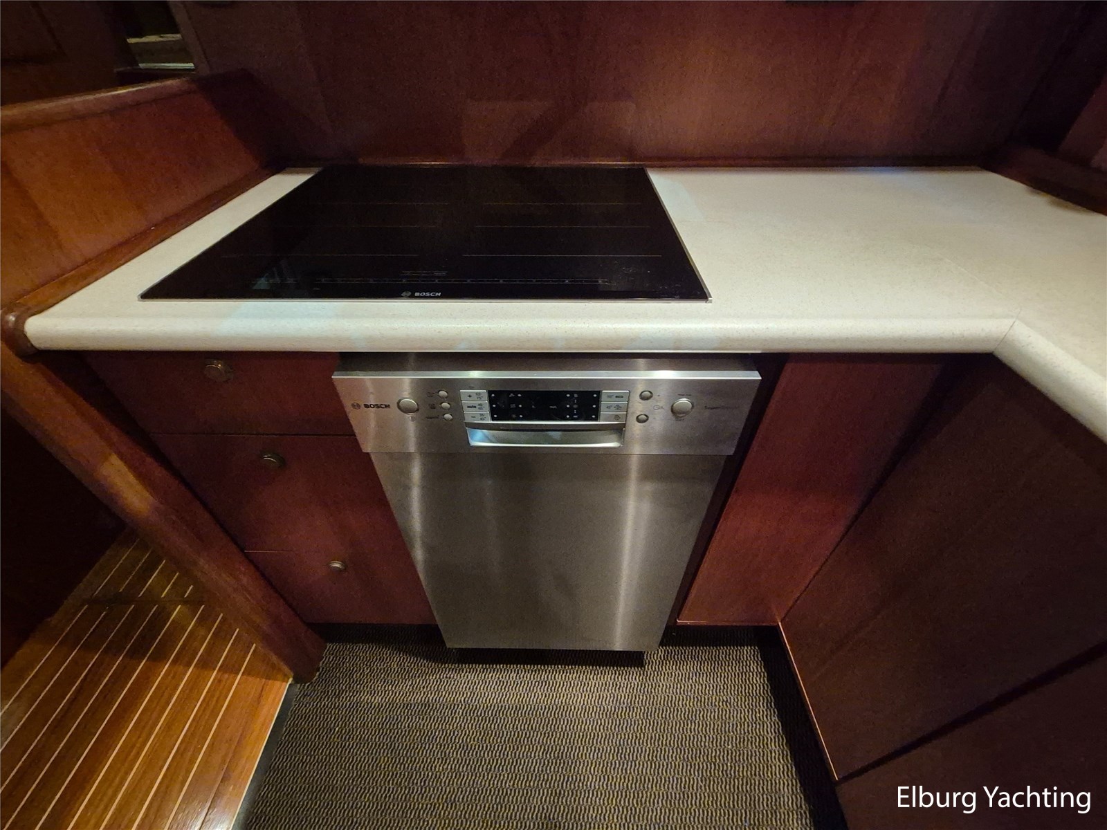 - Alu Antislip materiaal (2012) in gang boorden, teak op achterdek en flexiteak op zwemplateau
