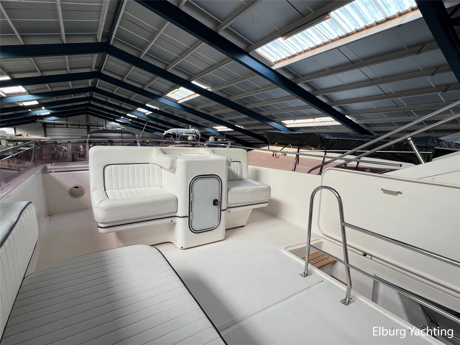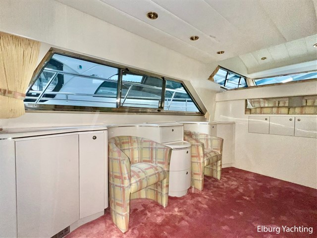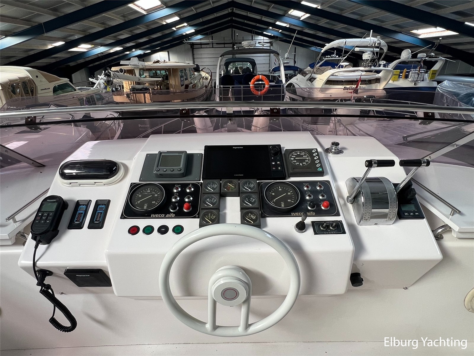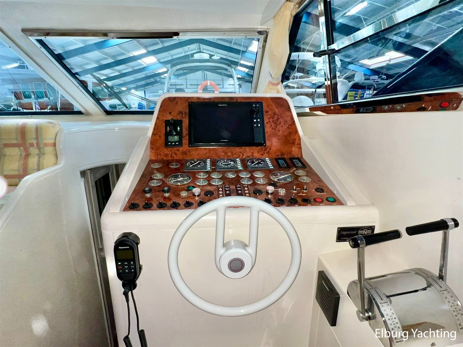 Deze ruime en sportieve Neptunus 156 verkeert in nette staat voor zijn leeftijd en wordt verkocht door de eerste eigenaar. Het jacht beschikt over drie hutten voor minimaal 6 opvarenden en heeft twee aparte badkamers. De open kuip en de salon zijn gelijkvloers met elkaar verbonden. Een complete tent dekt de open kuip af met grote zichtvensters. Via een vaste trap in de kuip krijg je krijg je toegang tot de riante flybridge met een U-vormige zitbank. De stuurstand heeft een 2-persoons vaarbank en biedt een overzichtelijke dashboard met alle benodigde apparatuur waaronder een vernieuwde Raymarine Axiom Pro 9 S plotter. De salon wordt betreden via een afsluitbare r.v.s. schuifpui. Een riante L-bank met twee geïntegreerde fauteuils bieden veel zit comfort. Er zijn veel opbergmogelijkheden in banken en kasten. De dinette bevindt zich tegen over de stuurstand waardoor de gehele crew op vaarhoogte kan meekijken. Benedendeks bevind zich de kombuis met een koelkast / vriezer / magnetron / vaatwasser / kookplaat en spoelbak. Aan SB-zijde bevind zich een 2 x 1-persoons gastenhut en aan BB-zijde een 1 x 2 persoons hut met frans bed. De gasten badkamer bevind zich midscheeps en is vrij toegankelijk. In het voorschip bevind zich de eigenaarshut met een 1 x 2 persoons bed met badkamer en-suite. Onder het bed van de voorhut bevind zich een ruime berging. Via een breed luik in de kuipvloer wordt het achterschip betreden. In het achterschip bevind zich opbergruimte, zowel een wasmachine als droger, de generator en nog verdere techniek. Via het achterschip is er een doorloop naar de machinekamer. De bakboordmotor is in de winter van 2023-2024 vervangen, rekeningen van deze werkzaamheden zijn beschikbaar. Deze Neptunus 156 is verder voorzien van: Afneembare kussens voor het achterdek, flybridge en voordek, bimini top over de flybridge, delen op de flybridge voorzien van afdekhoezen, r.v.s. fenderhouders, afsluitbare kuip met deur naar zwemplateau, buiten verlichting, 4 x schuifraam in salon voor ventilatie + 2 horren, muggenhorren voor patrijspoorten, afneembaar zonnescherm op voorruit, zijladder. Stahoogte in het interieur ca. 2 meter.
