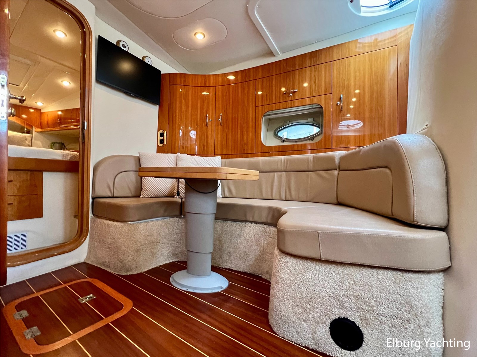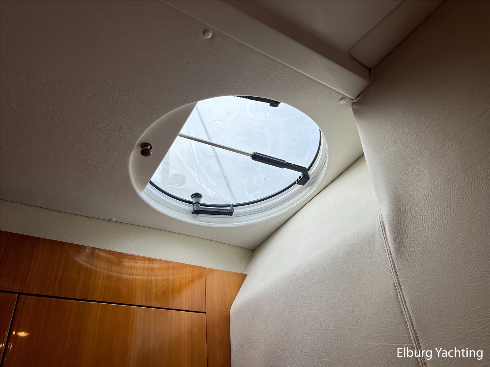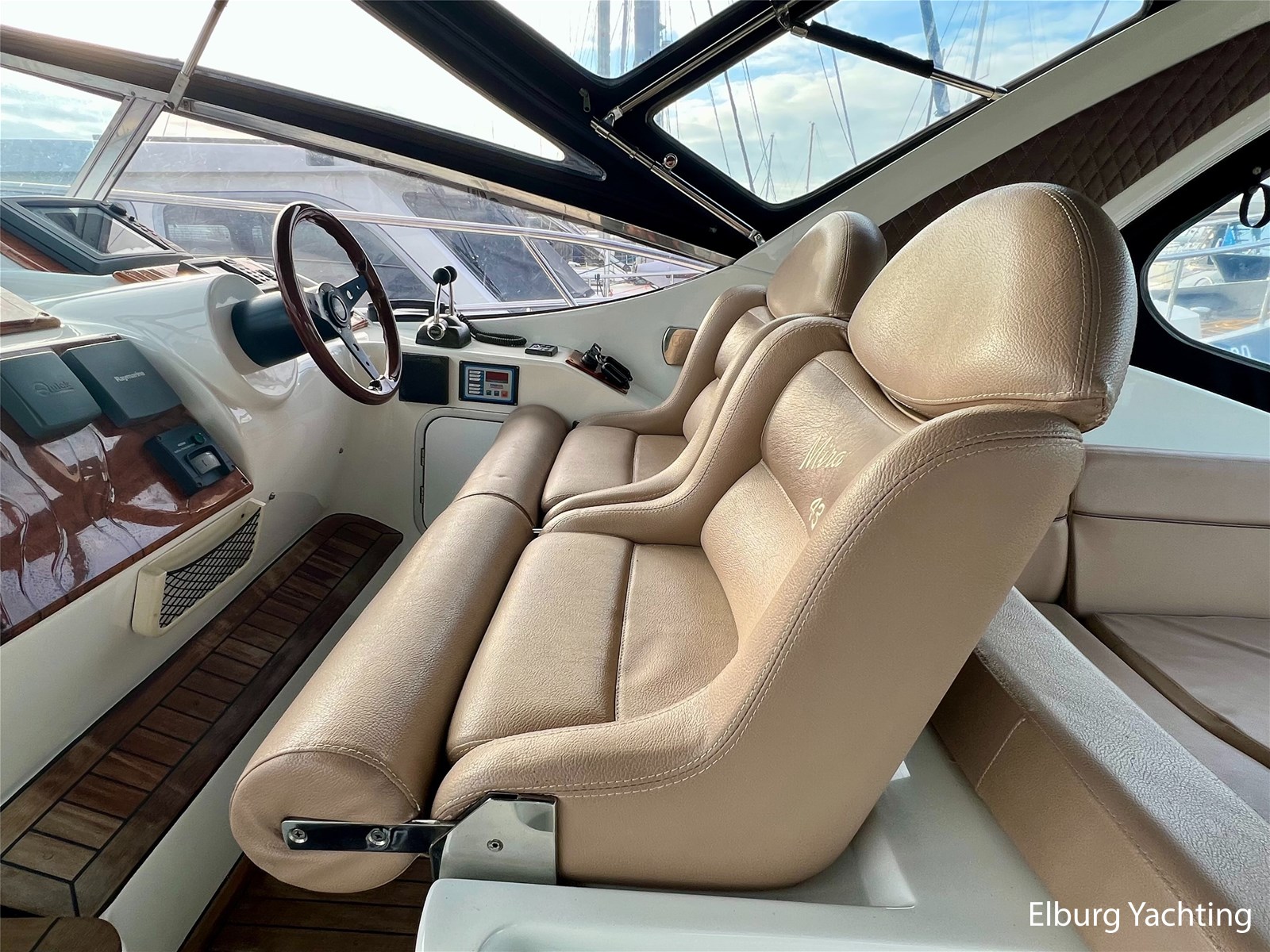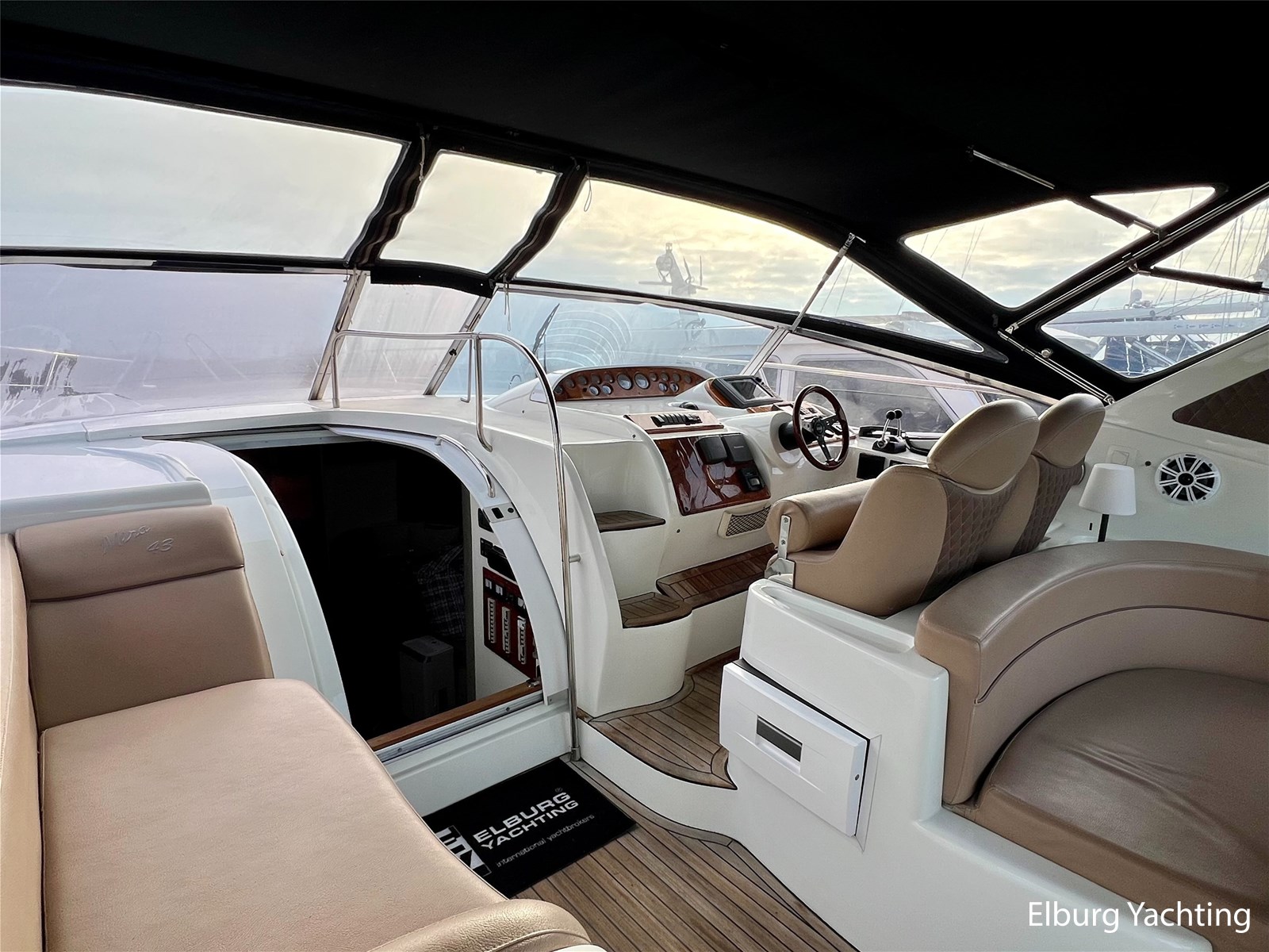 - Gelakt teak interieur met creme kleurige lederen bekleding, licht tapijt over teakvloer (niet verlijmd)