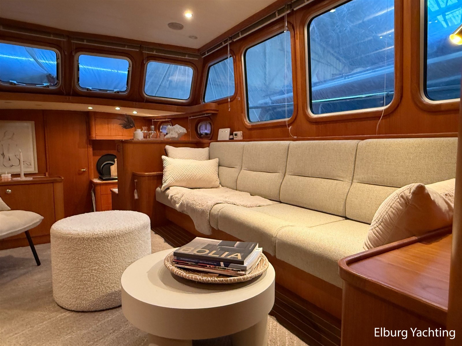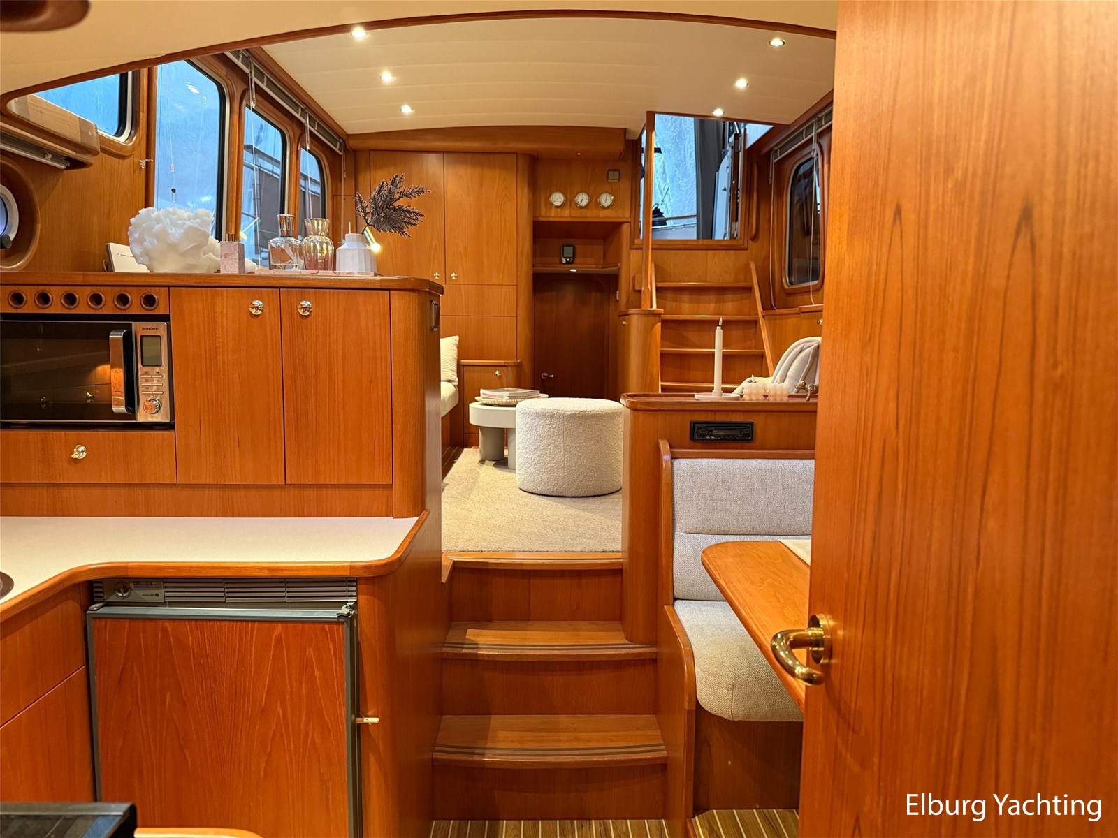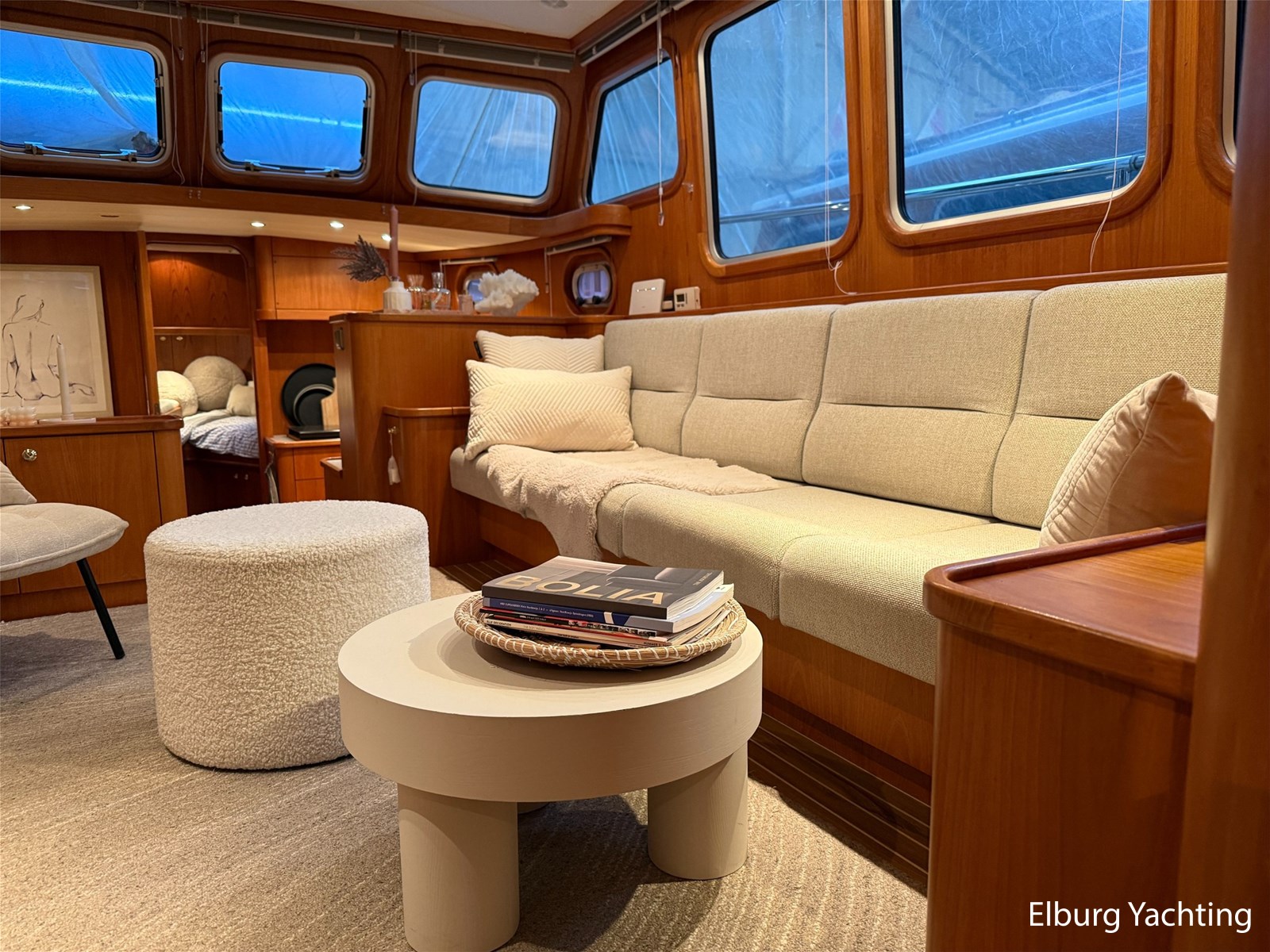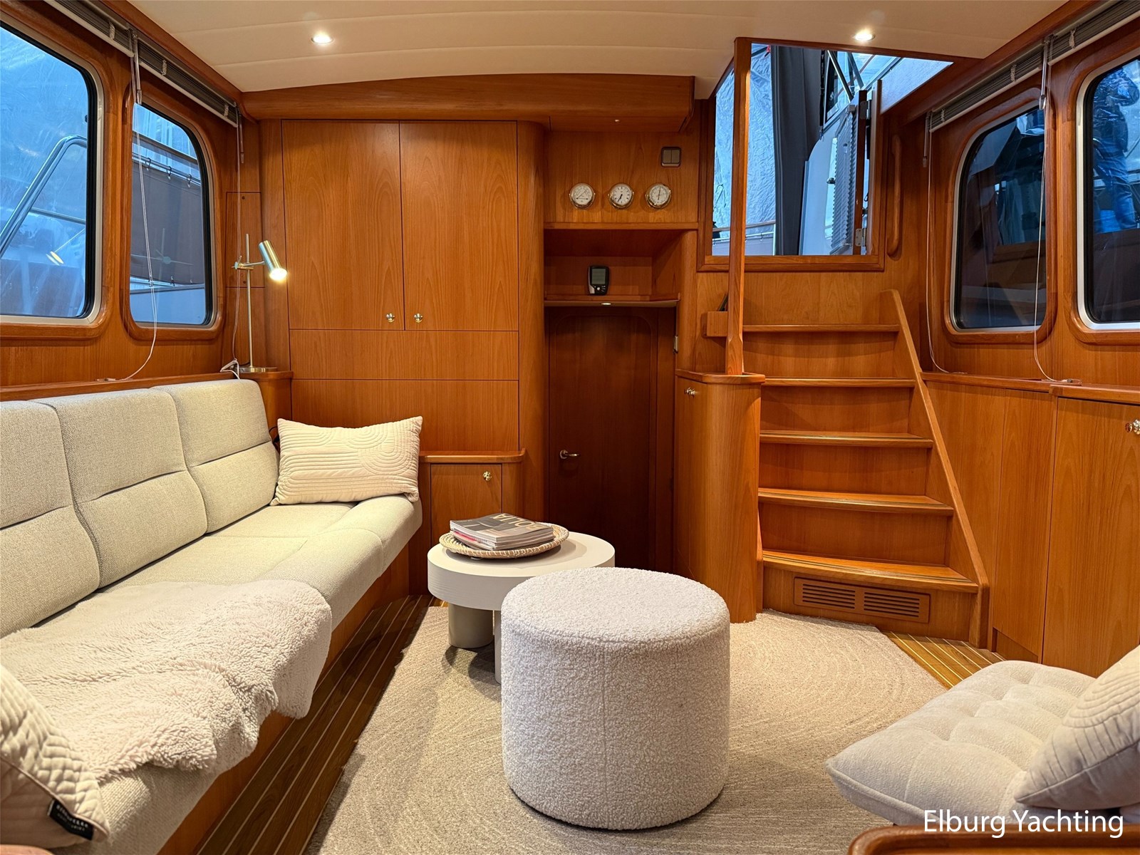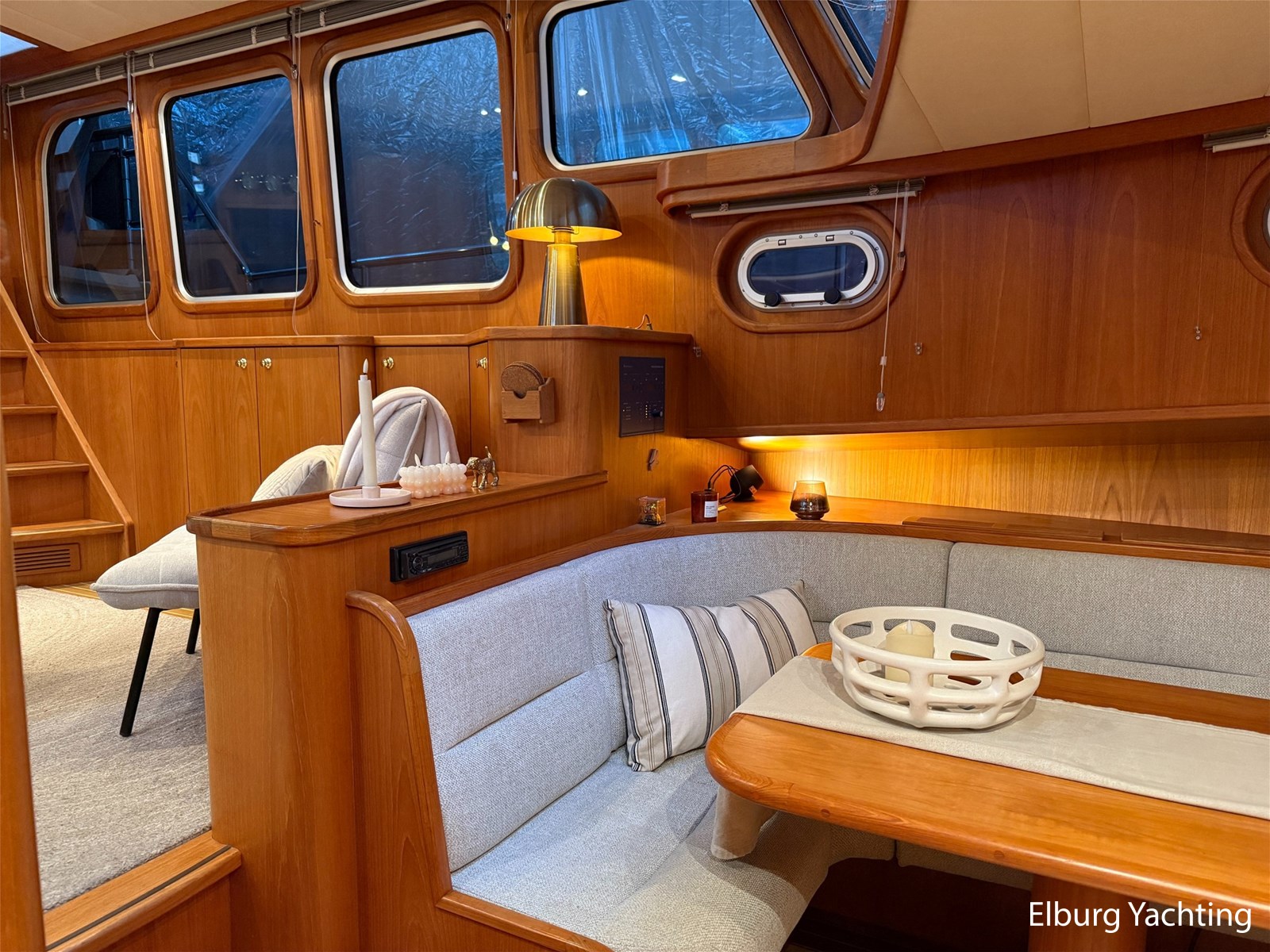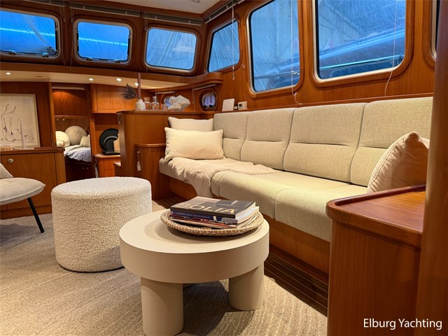 - Hoogwaardig Teakhouten interieur met ronde afwerking en nieuwe grijze stoffering (2024)