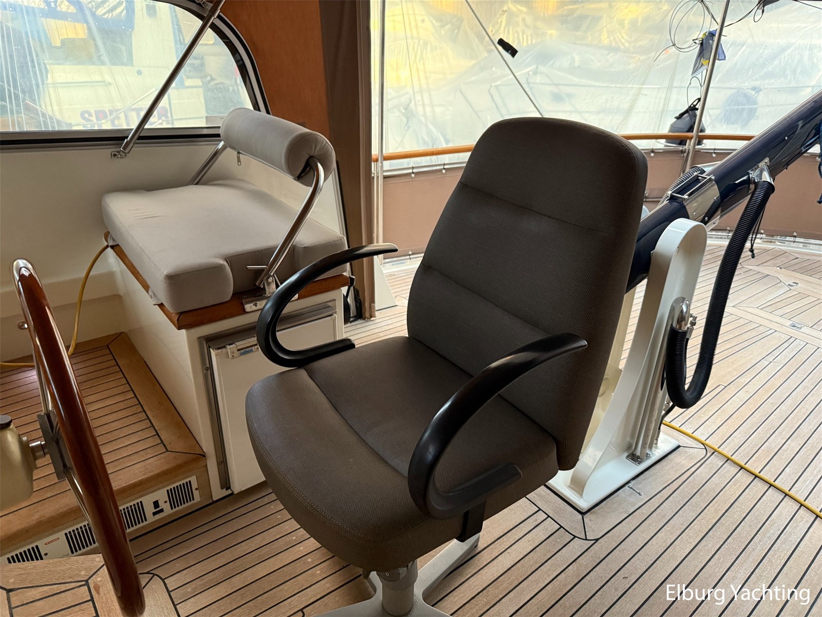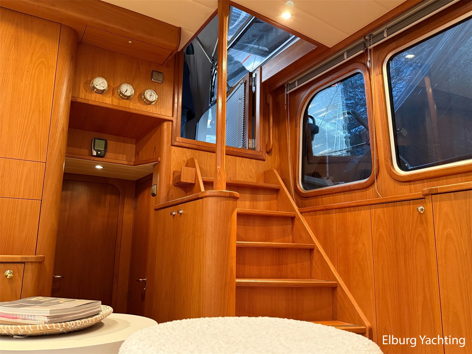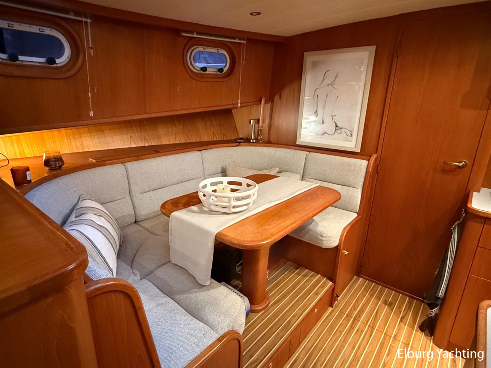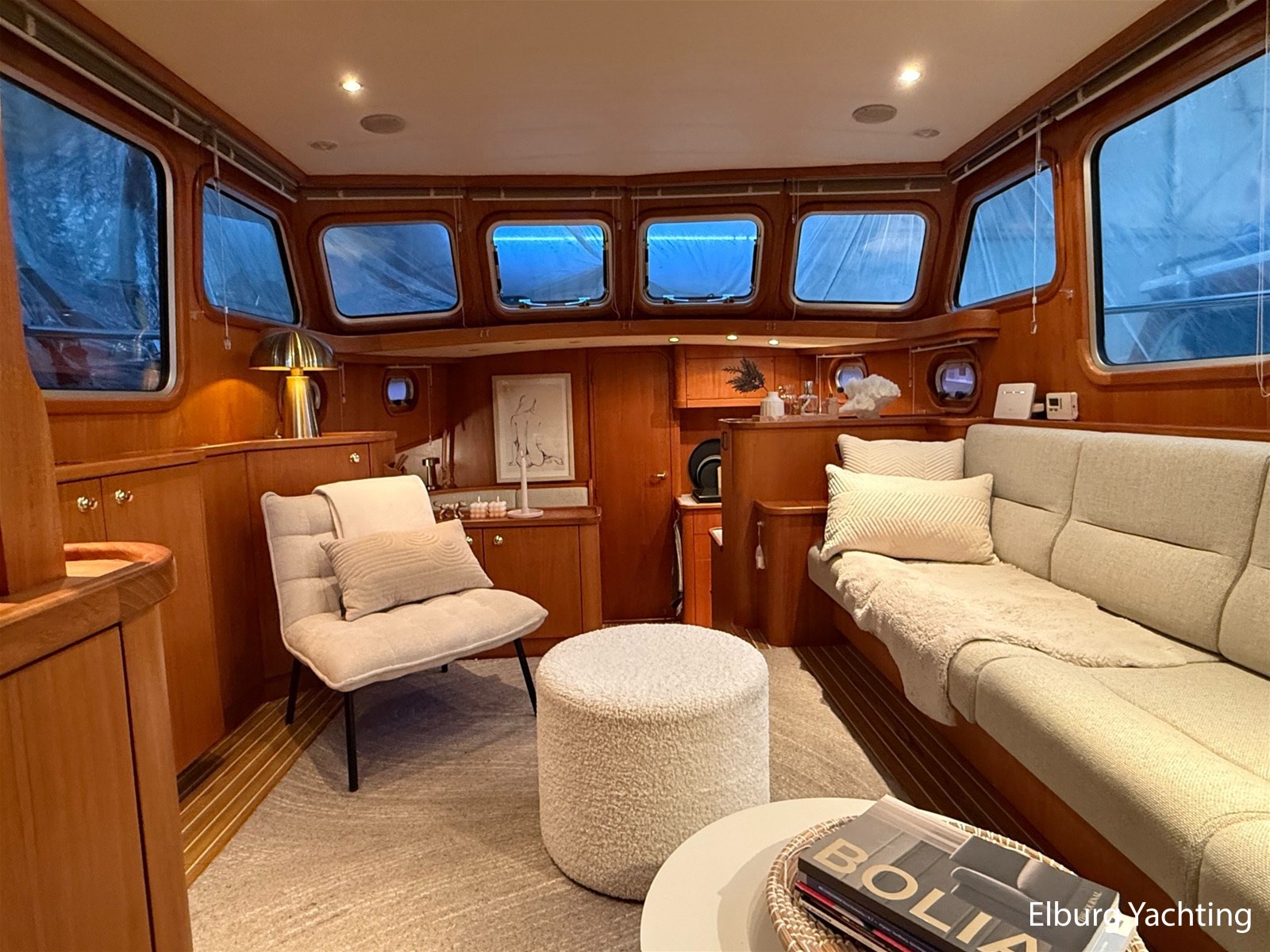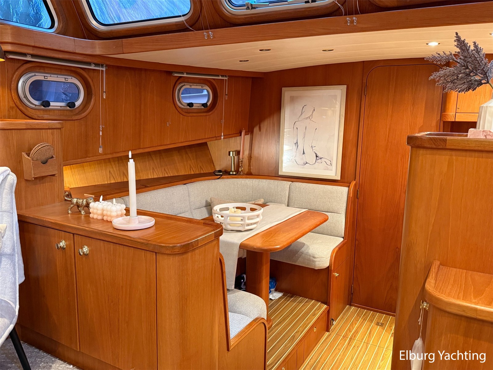 - Hoogwaardig Teakhouten interieur met ronde afwerking en nieuwe grijze stoffering (2024)