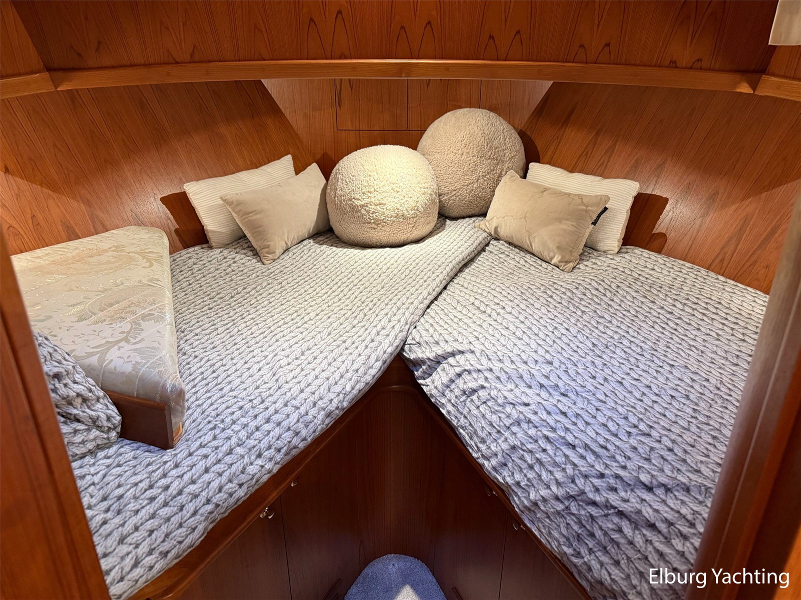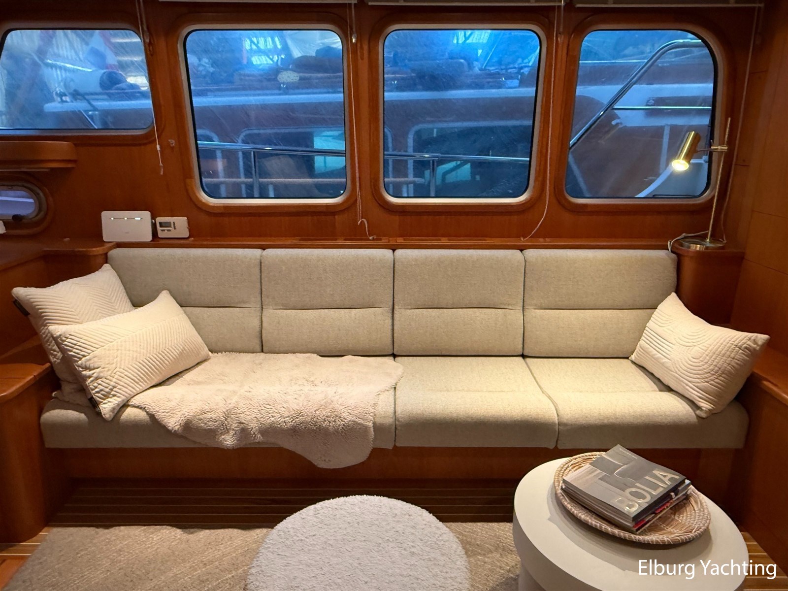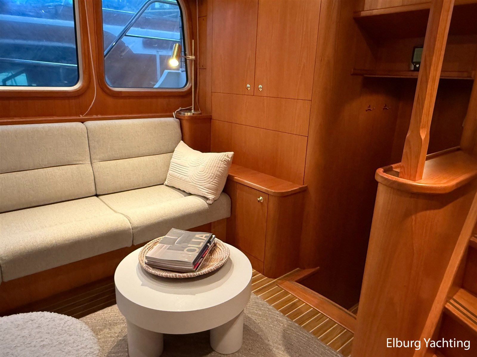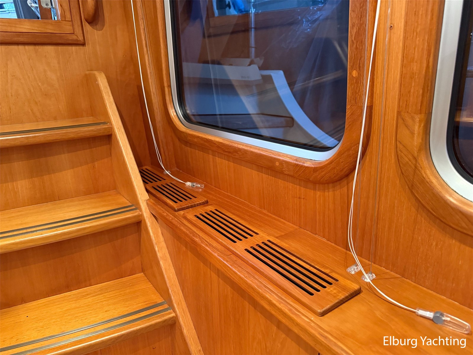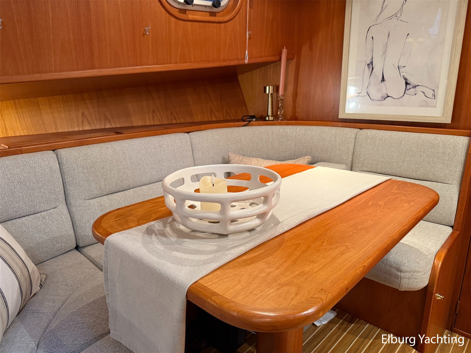 - Hoogwaardig Teakhouten interieur met ronde afwerking en nieuwe grijze stoffering (2024)