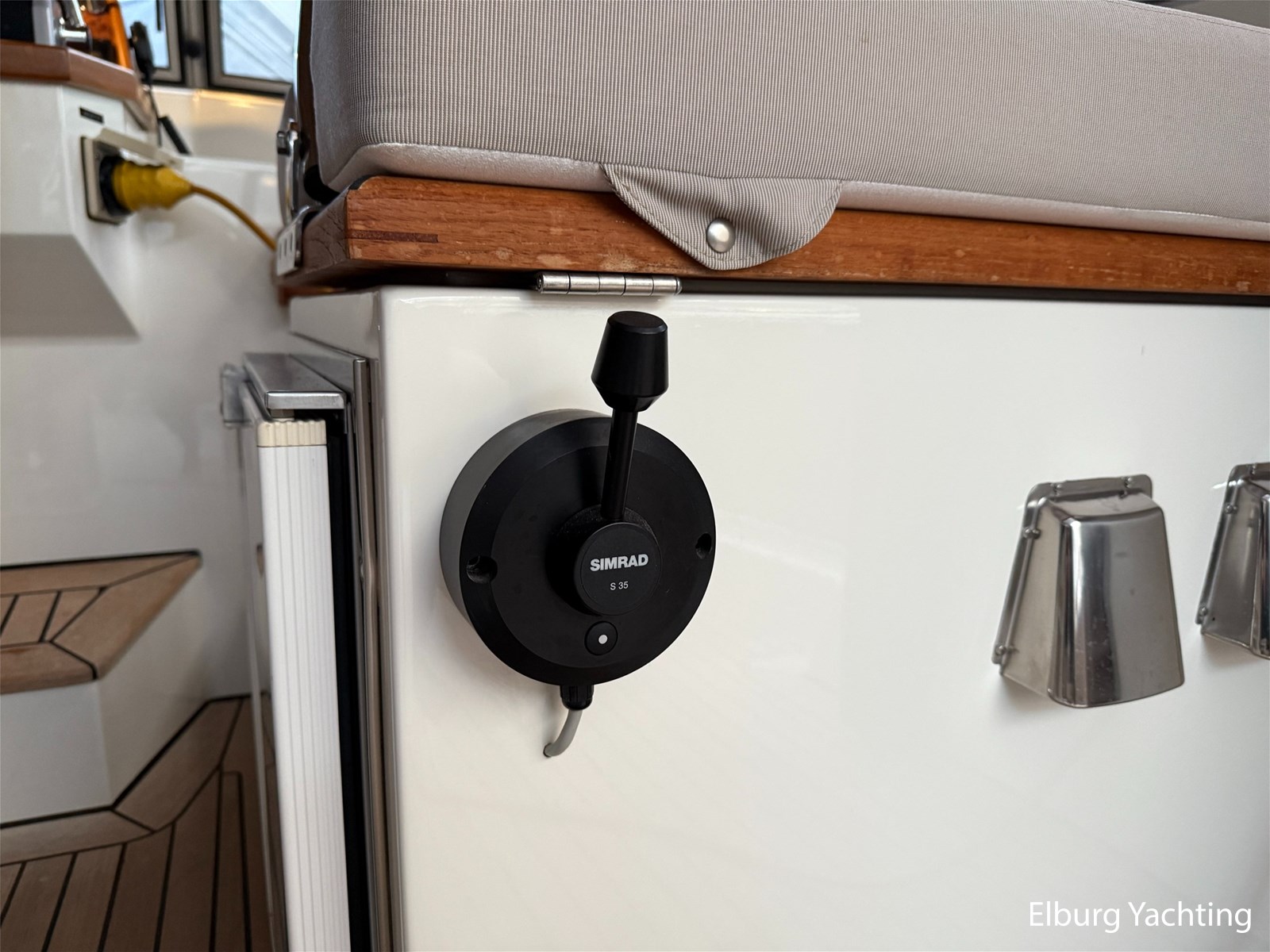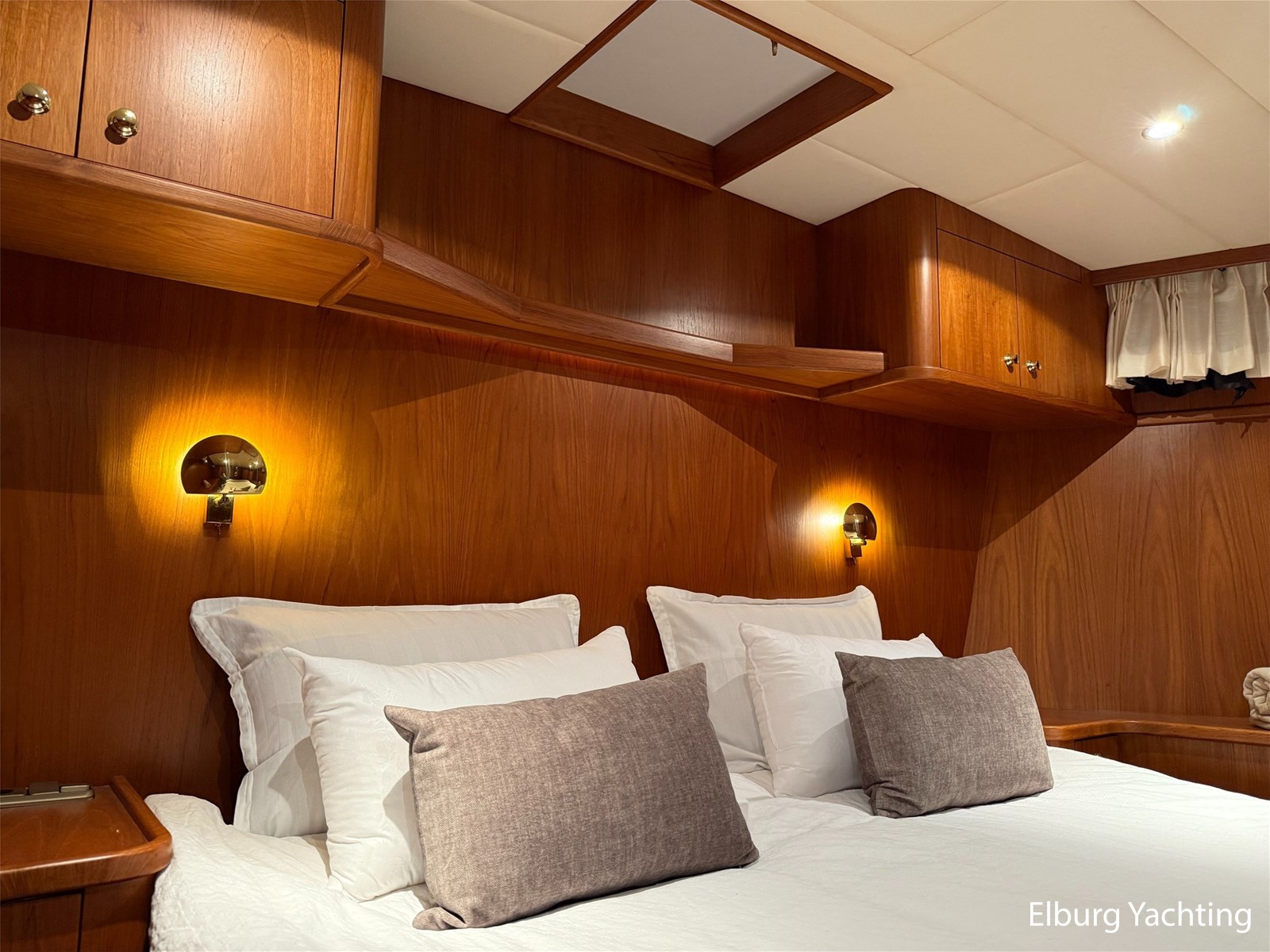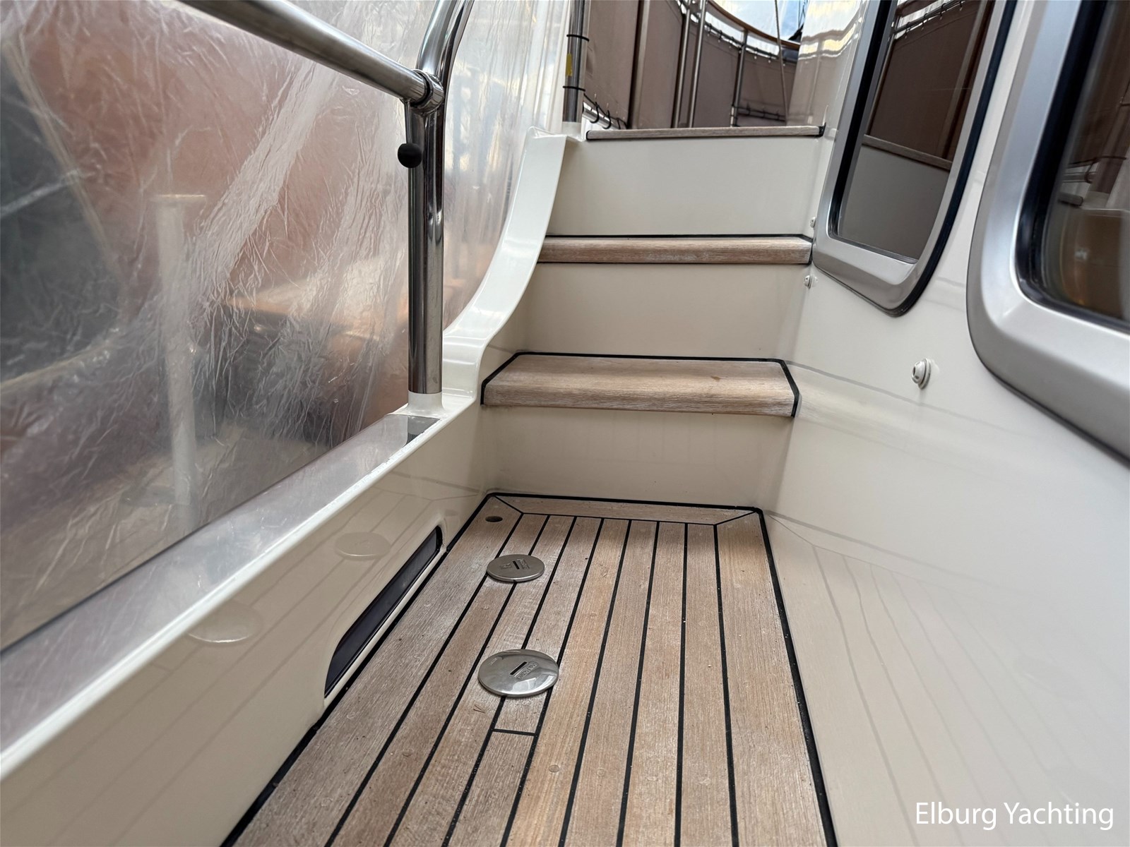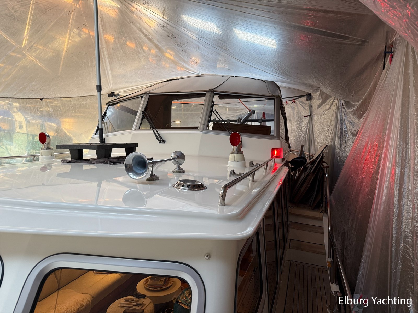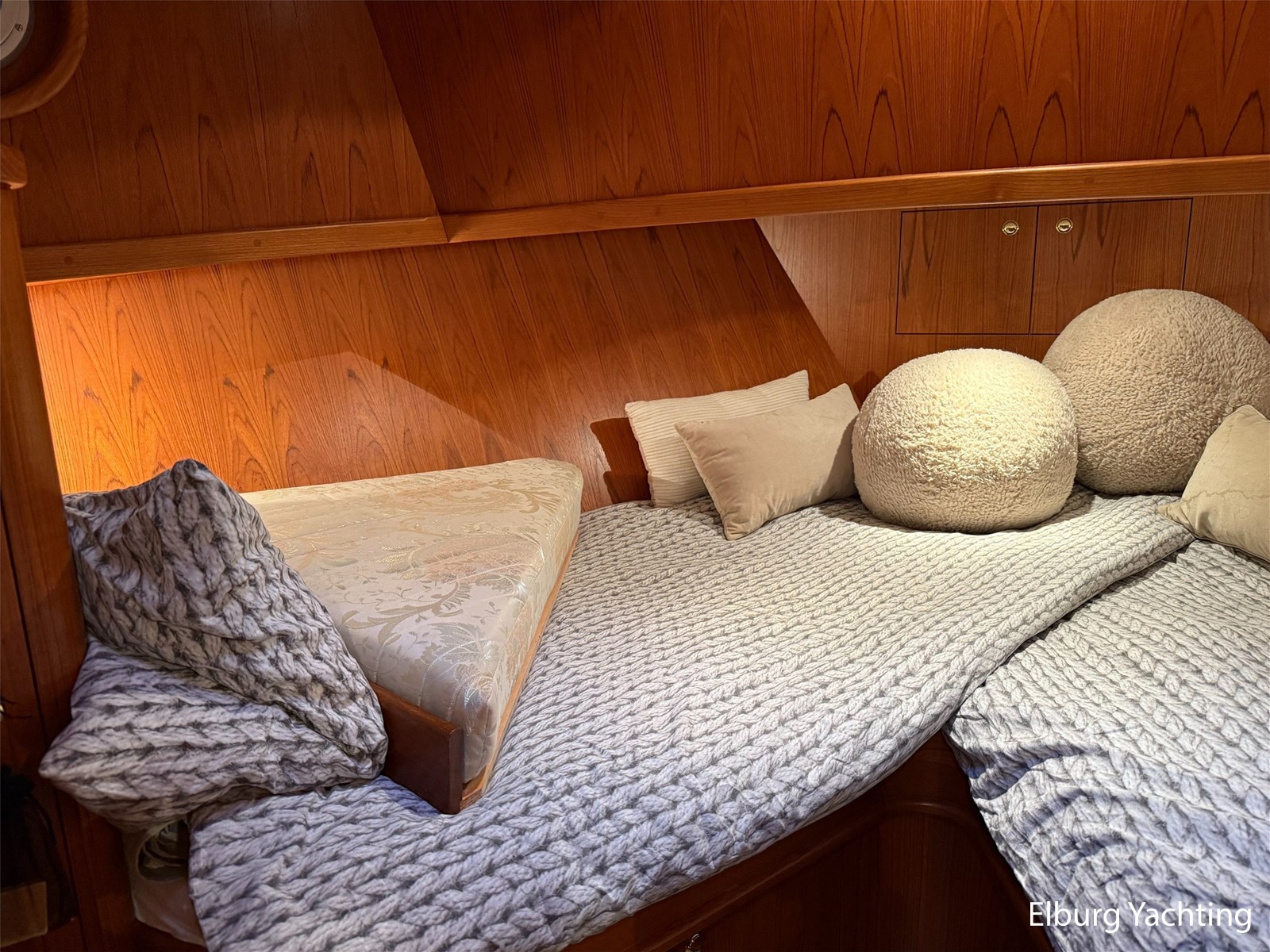 - Hoogwaardig Teakhouten interieur met ronde afwerking en nieuwe grijze stoffering (2024)