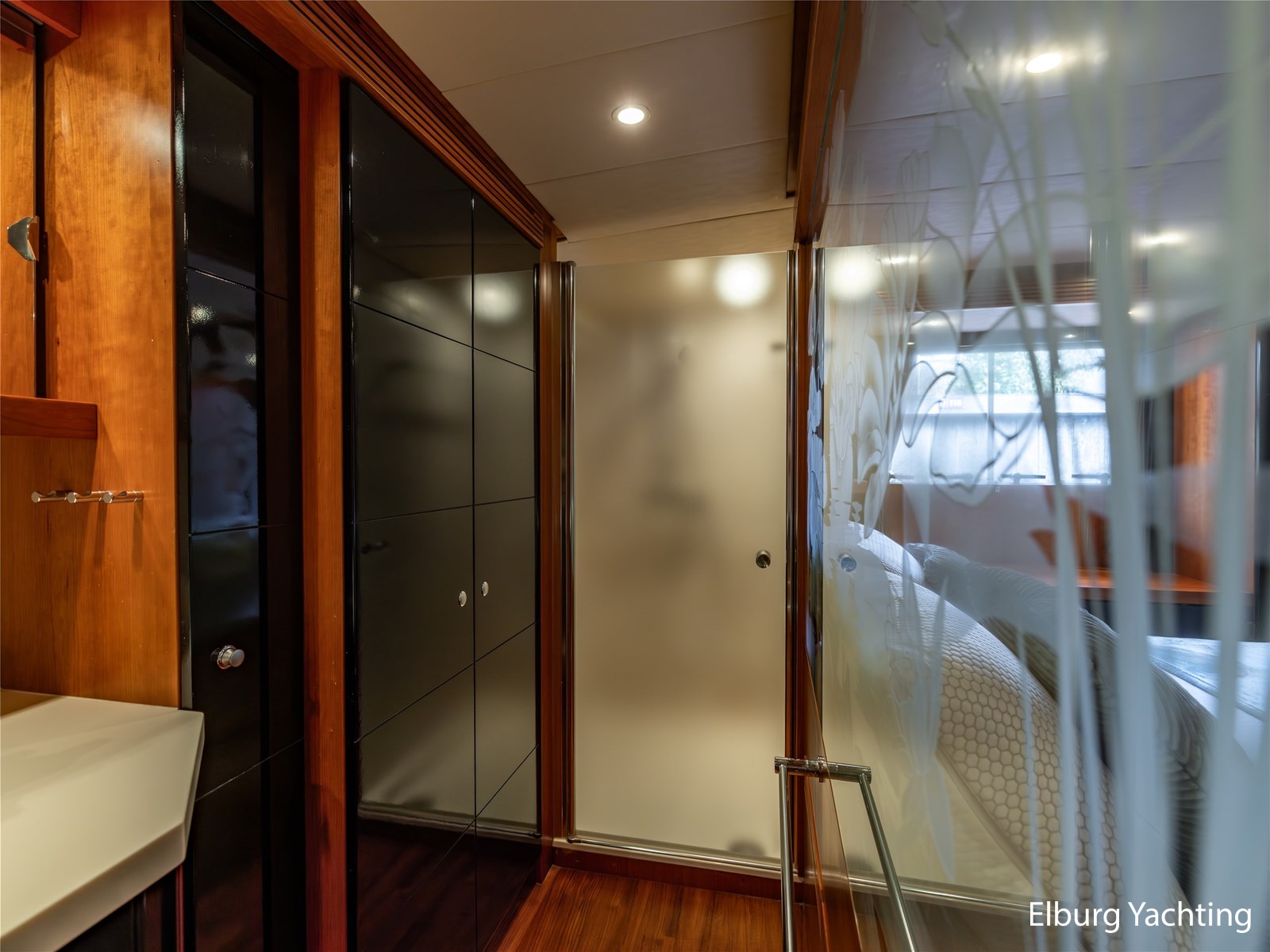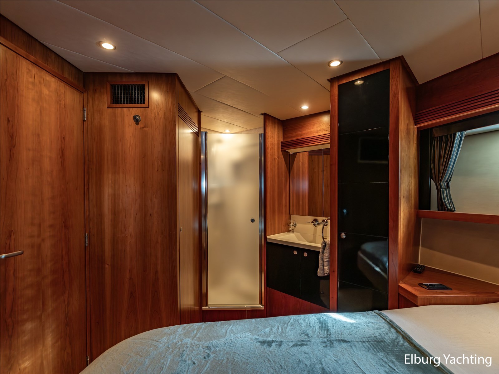 De eigenaarshut achterin is bijzonder royaal en beslaat de volle breedte van het jacht. Deze luxe 'full beam' master cabin beschikt over een vrijstaand tweepersoonsbed, een badkamer en suite, ruime kastopstelling en een sfeervolle afwerking.