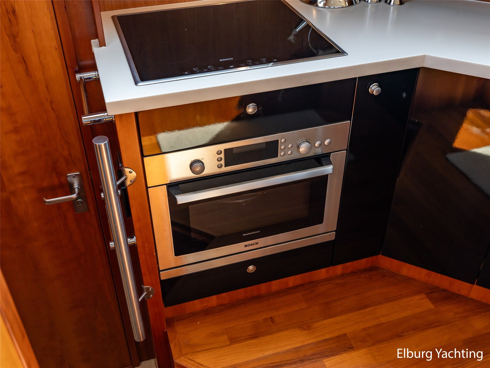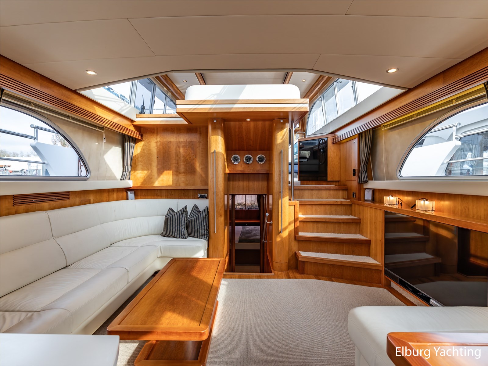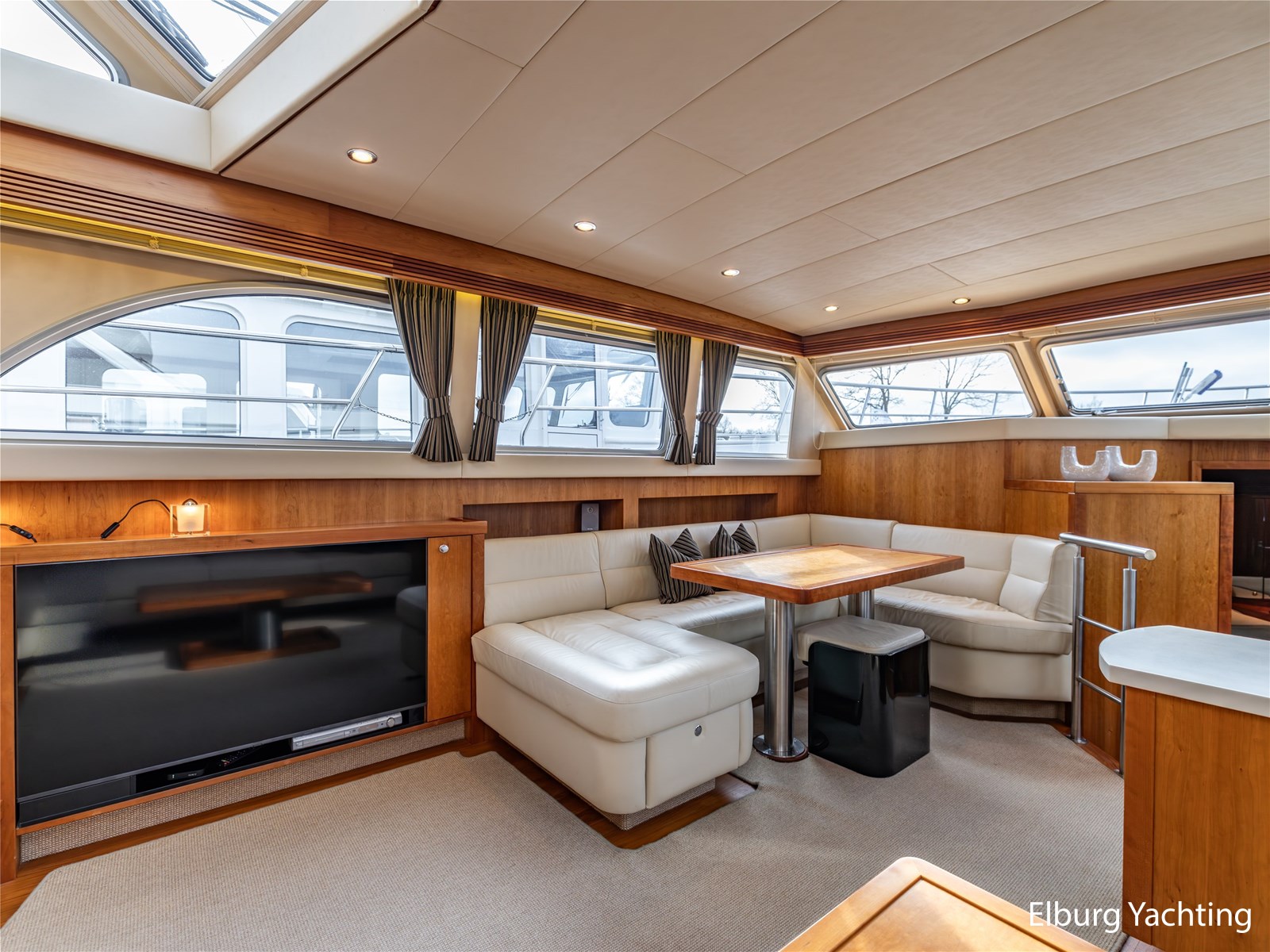 Vanuit de stuurhut loopt u via een niveauverschil naar de ruime salon, uitgevoerd in teak met crème-witte lederen bekleding en royale lichtinval dankzij de grote ramen. De salon is sfeervol verlicht met ingebouwde LED-verlichting en uitgerust met een flatscreen-tv, zodat ontspanning aan boord gegarandeerd is. Aansluitend bevindt zich, een niveau lager, de volledig uitgeruste kombuis. Deze keuken is voorzien van een Corian werkblad, keramische kookplaat, afzuigkap, Bosch oven, combimagnetron en dubbele koelkast. Alles is aanwezig om aan boord volwaardig te kunnen koken en leven.