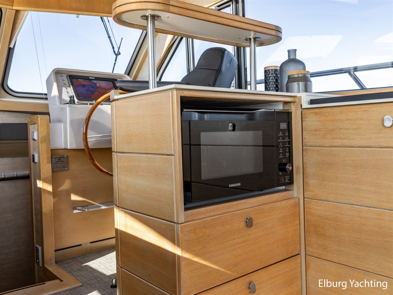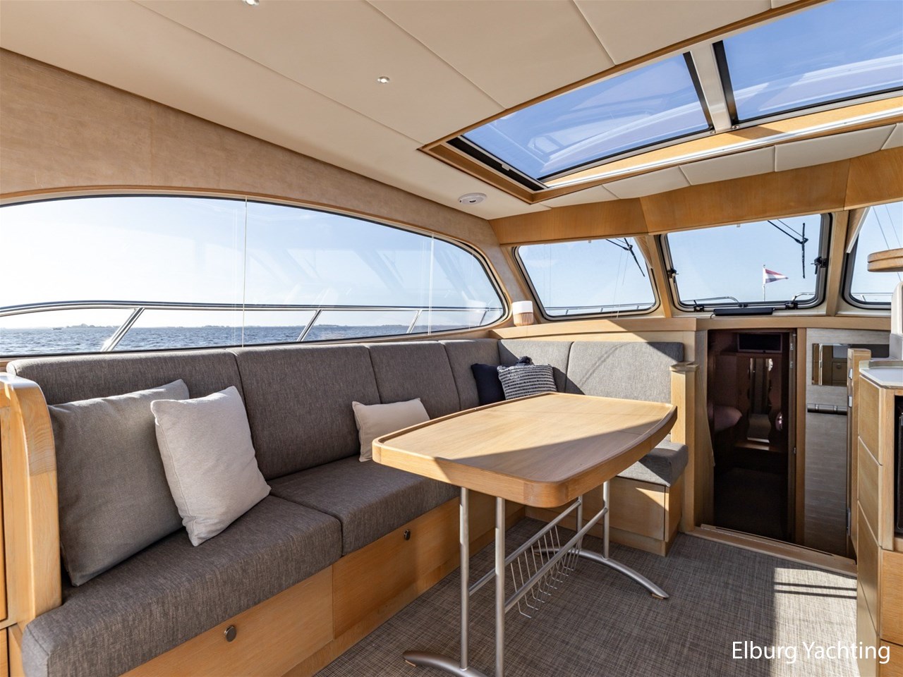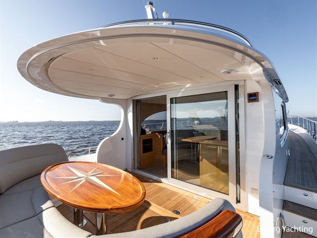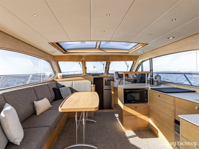 De keuken, stuurstand, 4-persoons eettafel en salonbank zijn opgenomen in een en dezelfde ruimte waardoor er veel contact mogelijk is. De aandrijving wordt verzorgd door een enkele 170 pk Vetus Deutz motor, dit zorgt voor een soepele toch krachtige manoeuvreerbaarheid in combinatie met een boeg- en hekschroef.