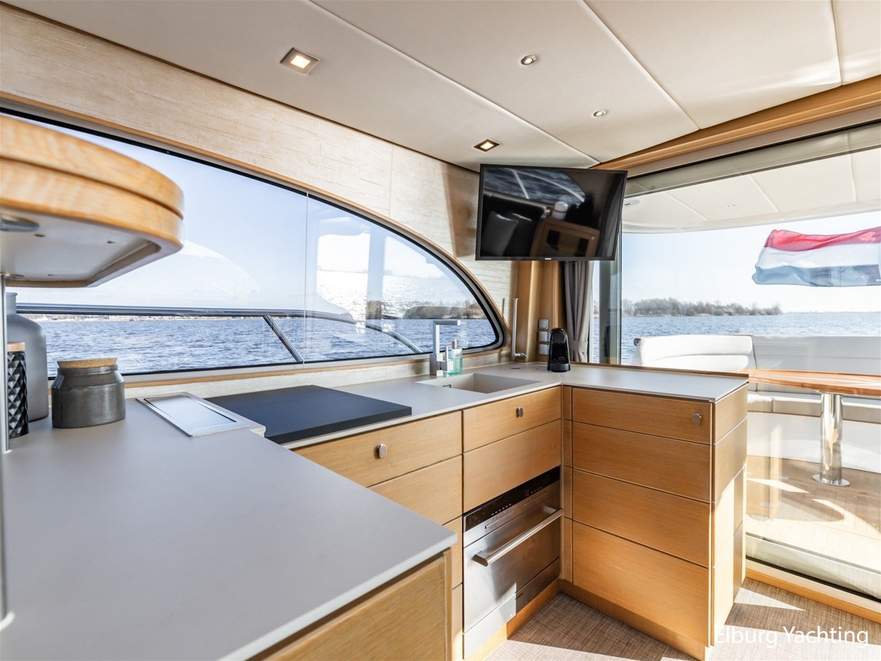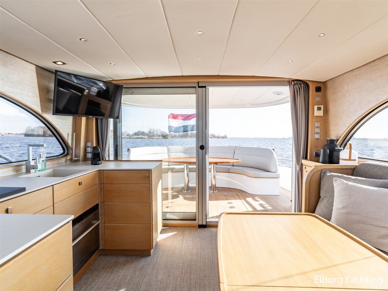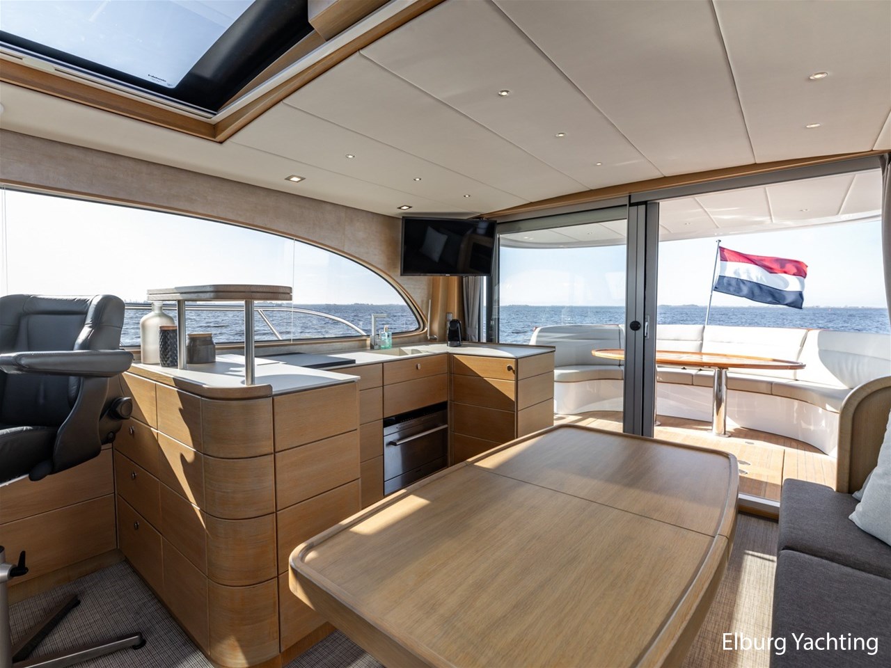 De keuken, stuurstand, 4-persoons eettafel en salonbank zijn opgenomen in een en dezelfde ruimte waardoor er veel contact mogelijk is. De aandrijving wordt verzorgd door een enkele 170 pk Vetus Deutz motor, dit zorgt voor een soepele toch krachtige manoeuvreerbaarheid in combinatie met een boeg- en hekschroef.
