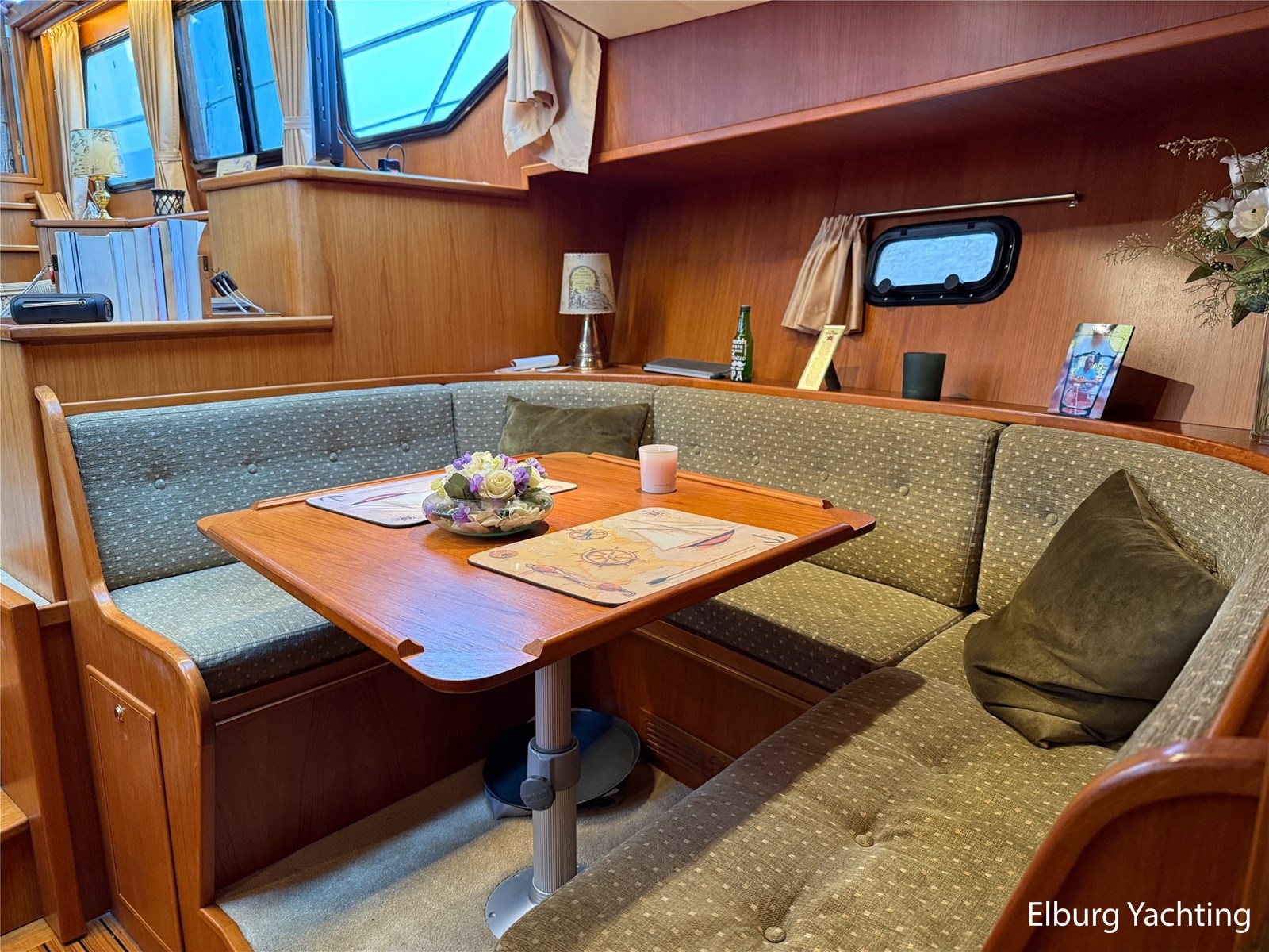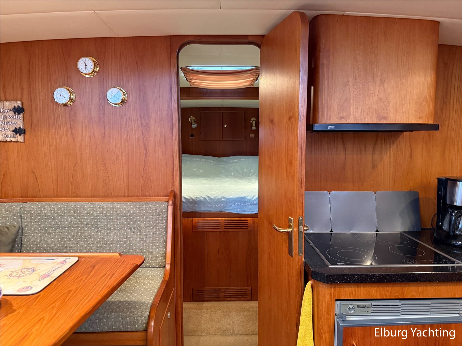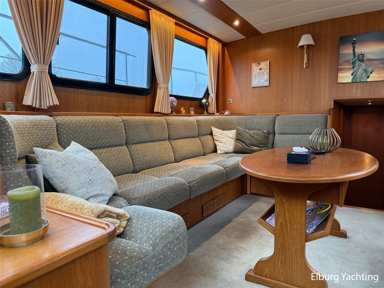 Binnen is het interieur van prachtig scheeps Teakhout in combinatie met bruine stoffen bekleding. Dit creëert een rustige ruimtelijke omgeving waar men heerlijk tot rust komt. Het jacht heeft een grote salon met comfortabele bank met tv en vloerbedekking. Verder naar voren de kombuis met daartegenover de dinette. Helemaal voorin is de voorhut met dubbel vrijstaand bed. Achter de salon via de luie trap naar beneden zijn de derde hut met stapelbed en daar tegenover de badkamer met elektrisch toilet, douche en wastafel gesitueerd en helemaal achterin zit de eigenaarshut met vrijstaand tweepersoons bed.