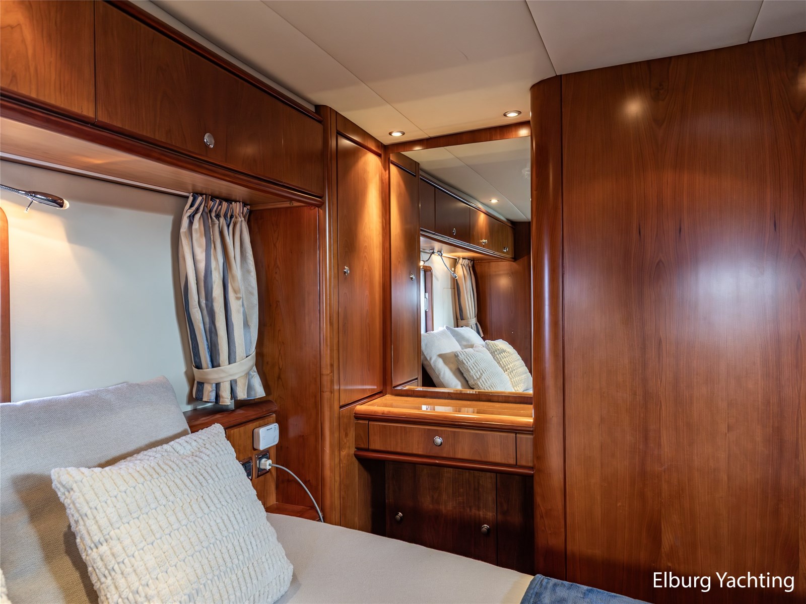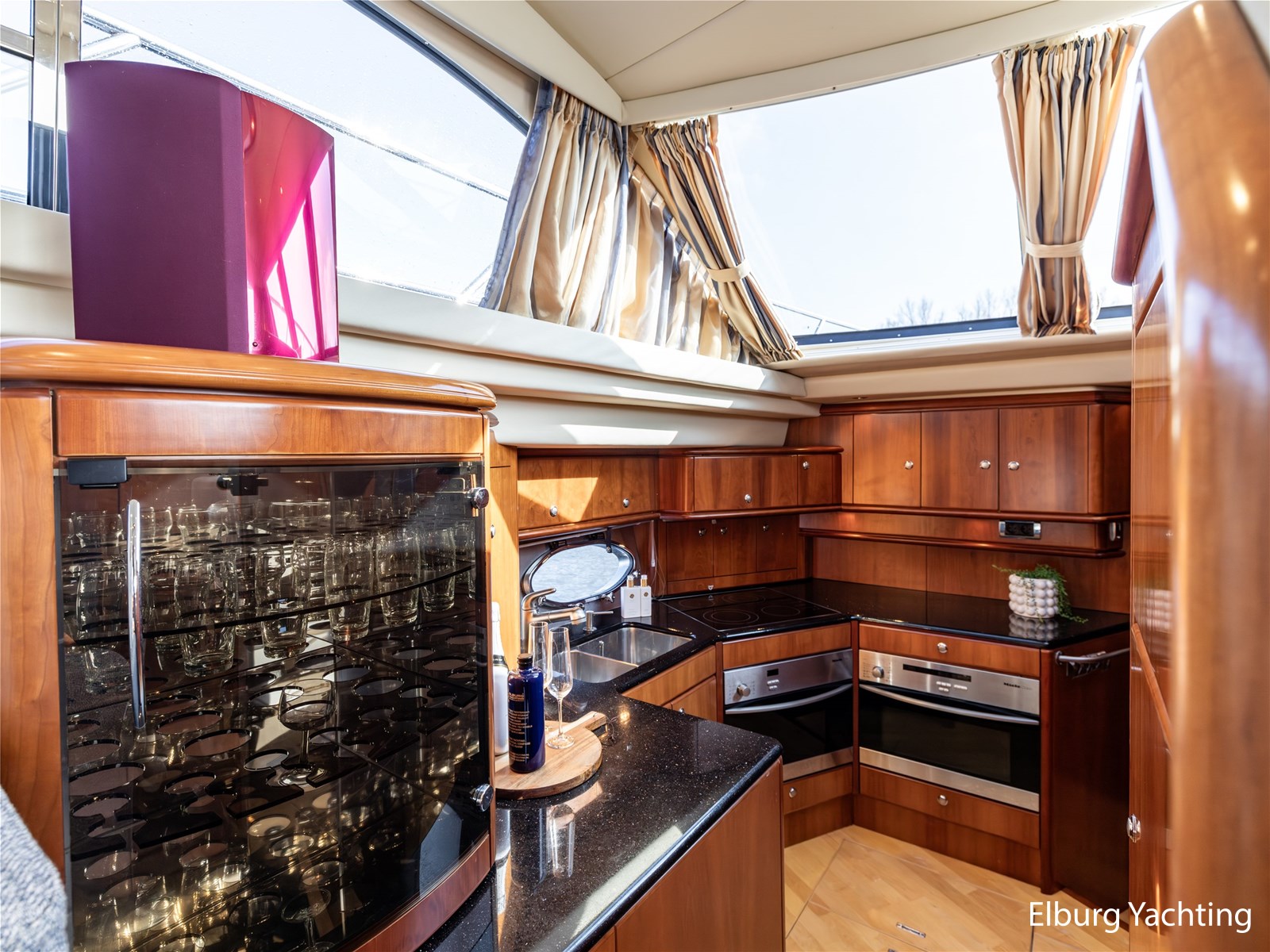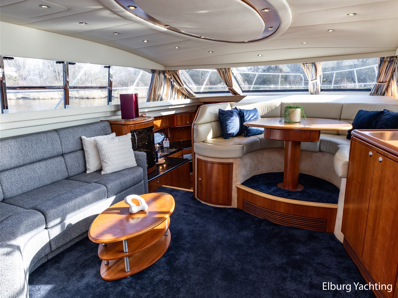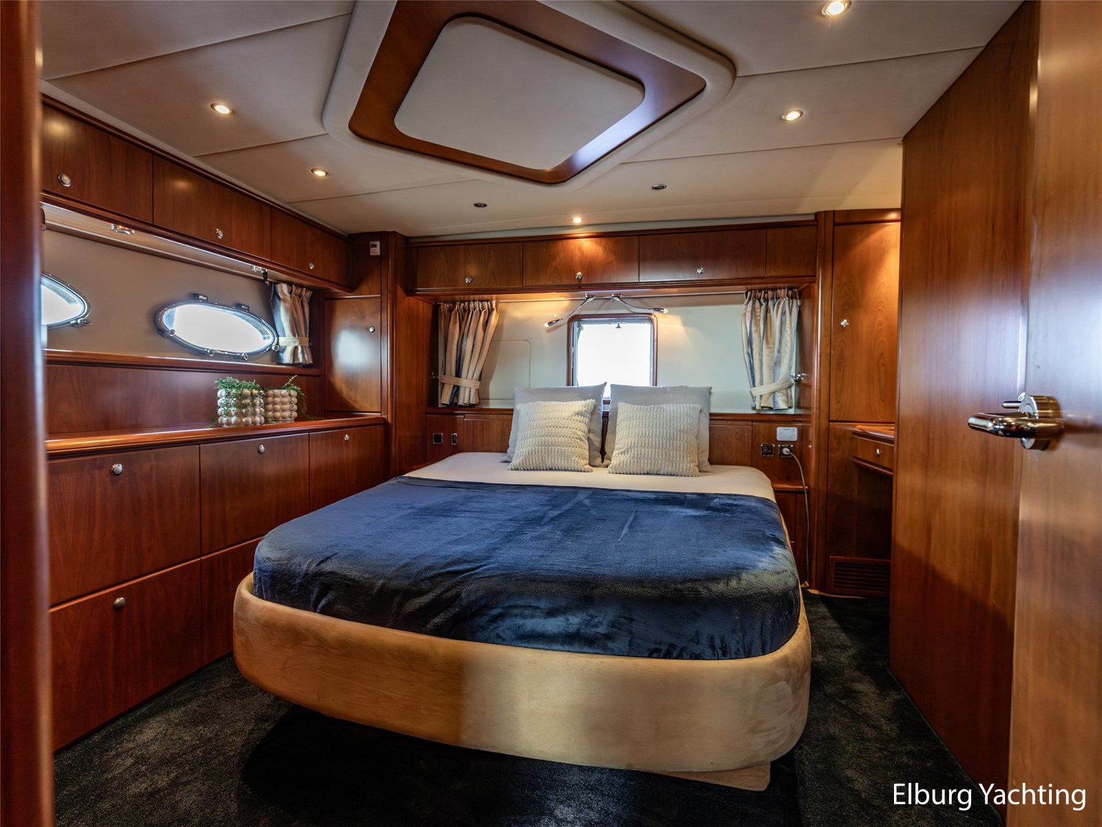 Rondom is het jacht voorzien van een prachtig Teakdek in combinatie met een driedubbel uitgevoerde r.v.s. zeereling. Aan beide zijden zijn relingpoortjes aangebracht met een comfortabele boegopstap waardoor het jacht ook bij de lagere steigers eenvoudig te betreden is. Het zwemplateau is eenvoudig te bereiken via de luie trap aan stuurboordzijde en een hydraulische gangway tevens is het zwemplateau voorzien van een Teakdek met steunen voor de bijboot, welke eenvoudig met de uitschuifbare gangway kunt kranen. Binnen is het jacht voorzien van een warm luxe Kersenhouten interieur met granieten werkbladen. De Kombuis is voorzien van Miele kwaliteitsapparatuur, het is aangenaam op temperatuur te krijgen via de Kabola centrale verwarming. Dimbare verlichting en 3 volwaardige hutten met 3 maal sanitair (3 x elektrische toiletten met 3 douches). Aan boord is de kastruimte goed doordacht en het interieur is prachtig afgewerkt.