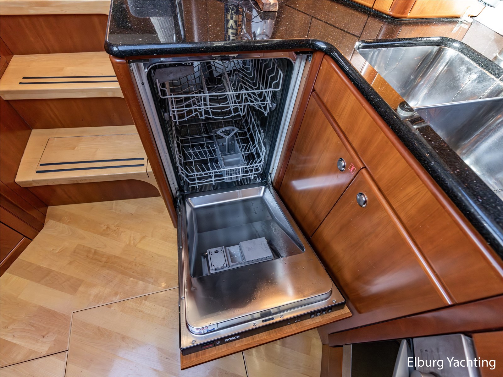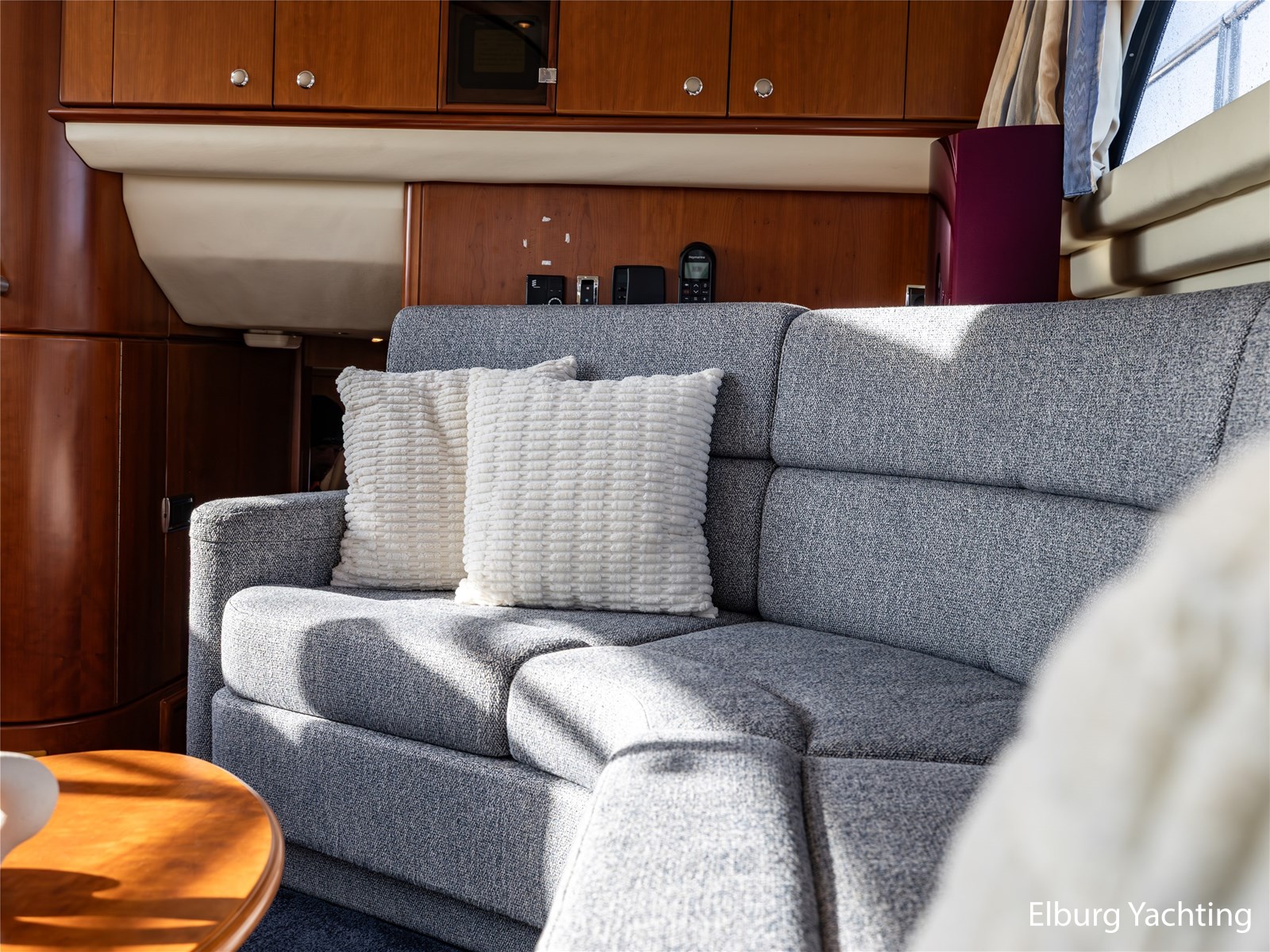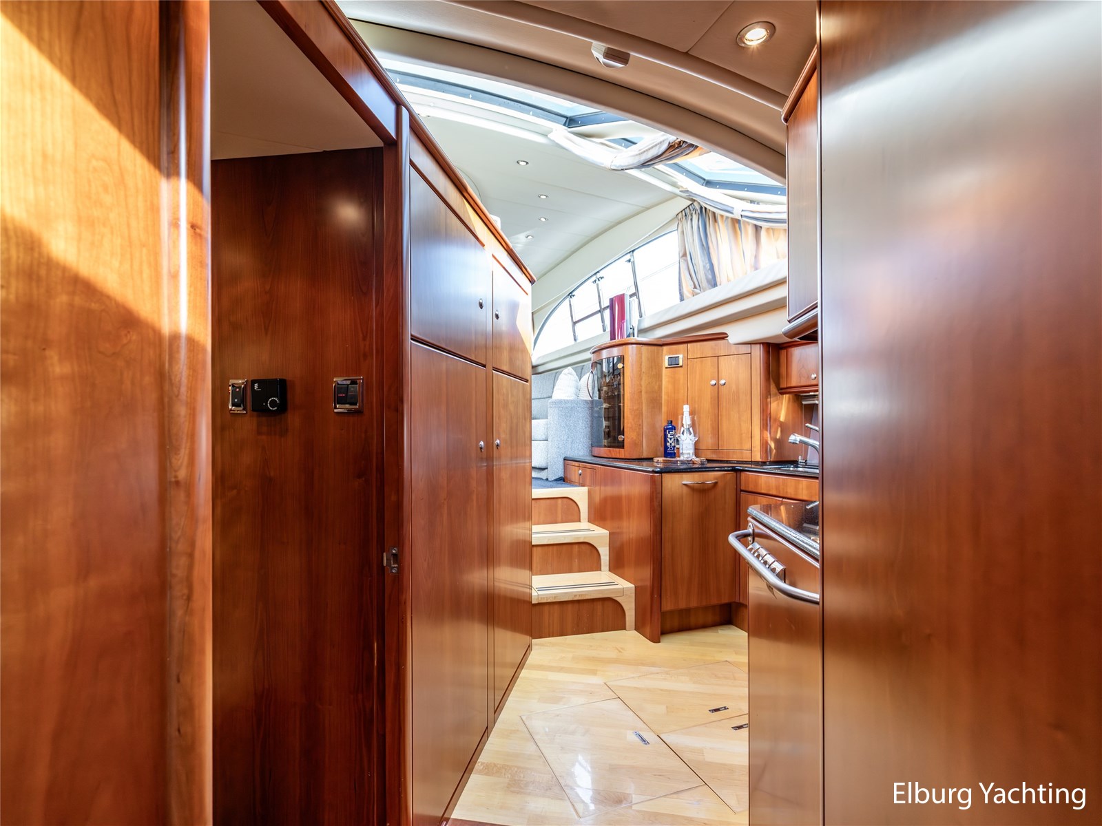 Rondom is het jacht voorzien van een prachtig Teakdek in combinatie met een driedubbel uitgevoerde r.v.s. zeereling. Aan beide zijden zijn relingpoortjes aangebracht met een comfortabele boegopstap waardoor het jacht ook bij de lagere steigers eenvoudig te betreden is. Het zwemplateau is eenvoudig te bereiken via de luie trap aan stuurboordzijde en een hydraulische gangway tevens is het zwemplateau voorzien van een Teakdek met steunen voor de bijboot, welke eenvoudig met de uitschuifbare gangway kunt kranen. Binnen is het jacht voorzien van een warm luxe Kersenhouten interieur met granieten werkbladen. De Kombuis is voorzien van Miele kwaliteitsapparatuur, het is aangenaam op temperatuur te krijgen via de Kabola centrale verwarming. Dimbare verlichting en 3 volwaardige hutten met 3 maal sanitair (3 x elektrische toiletten met 3 douches). Aan boord is de kastruimte goed doordacht en het interieur is prachtig afgewerkt.