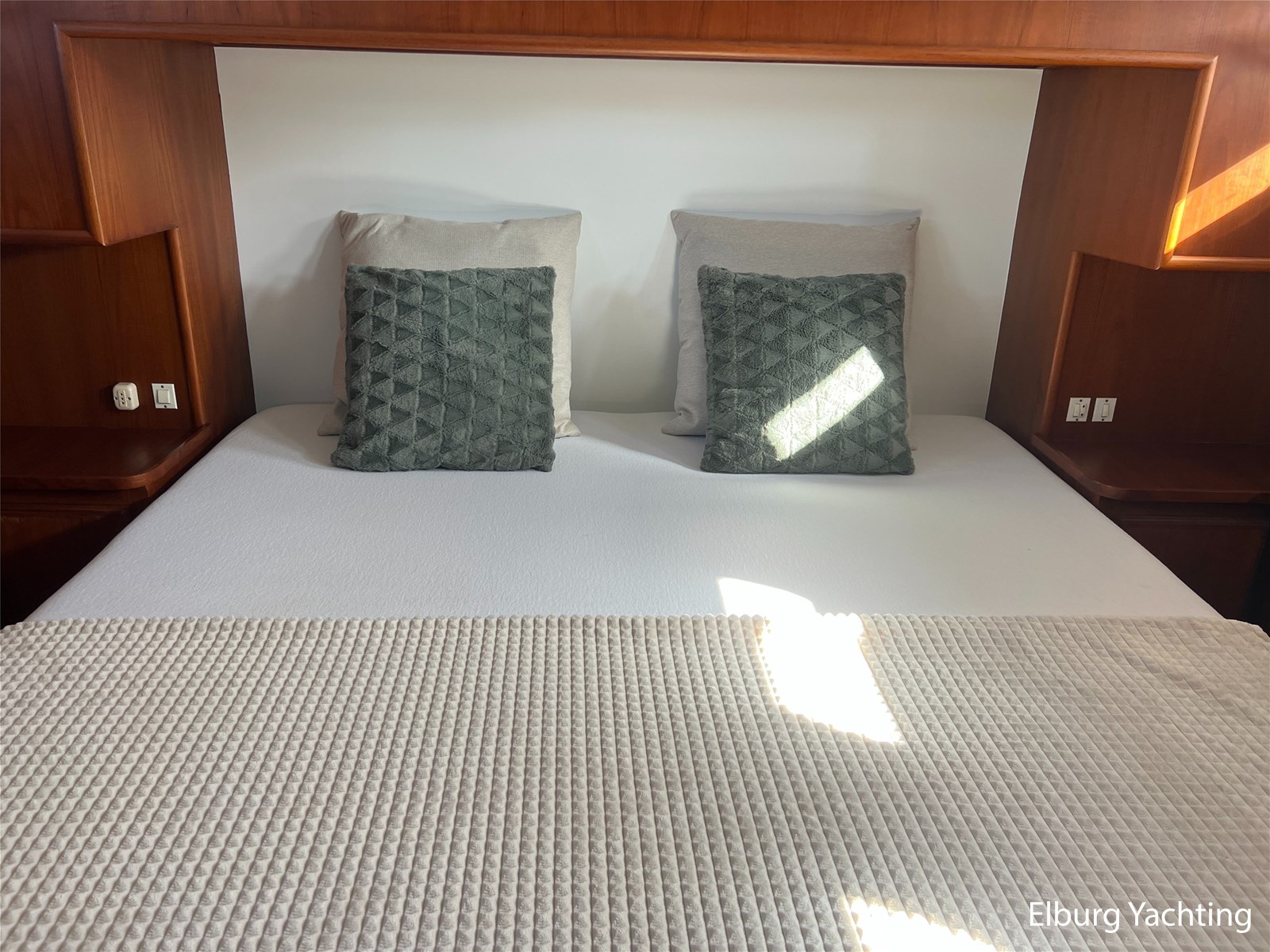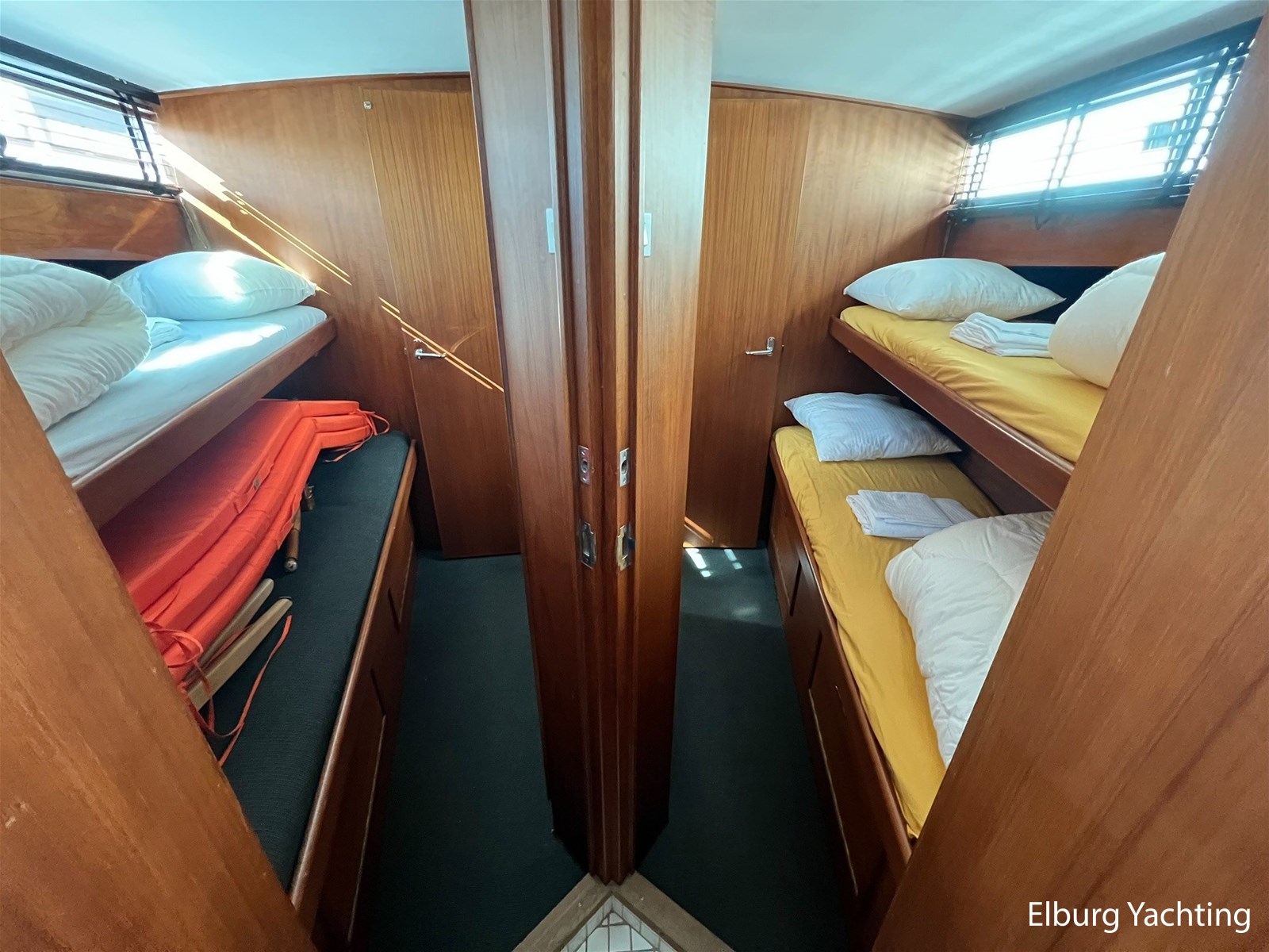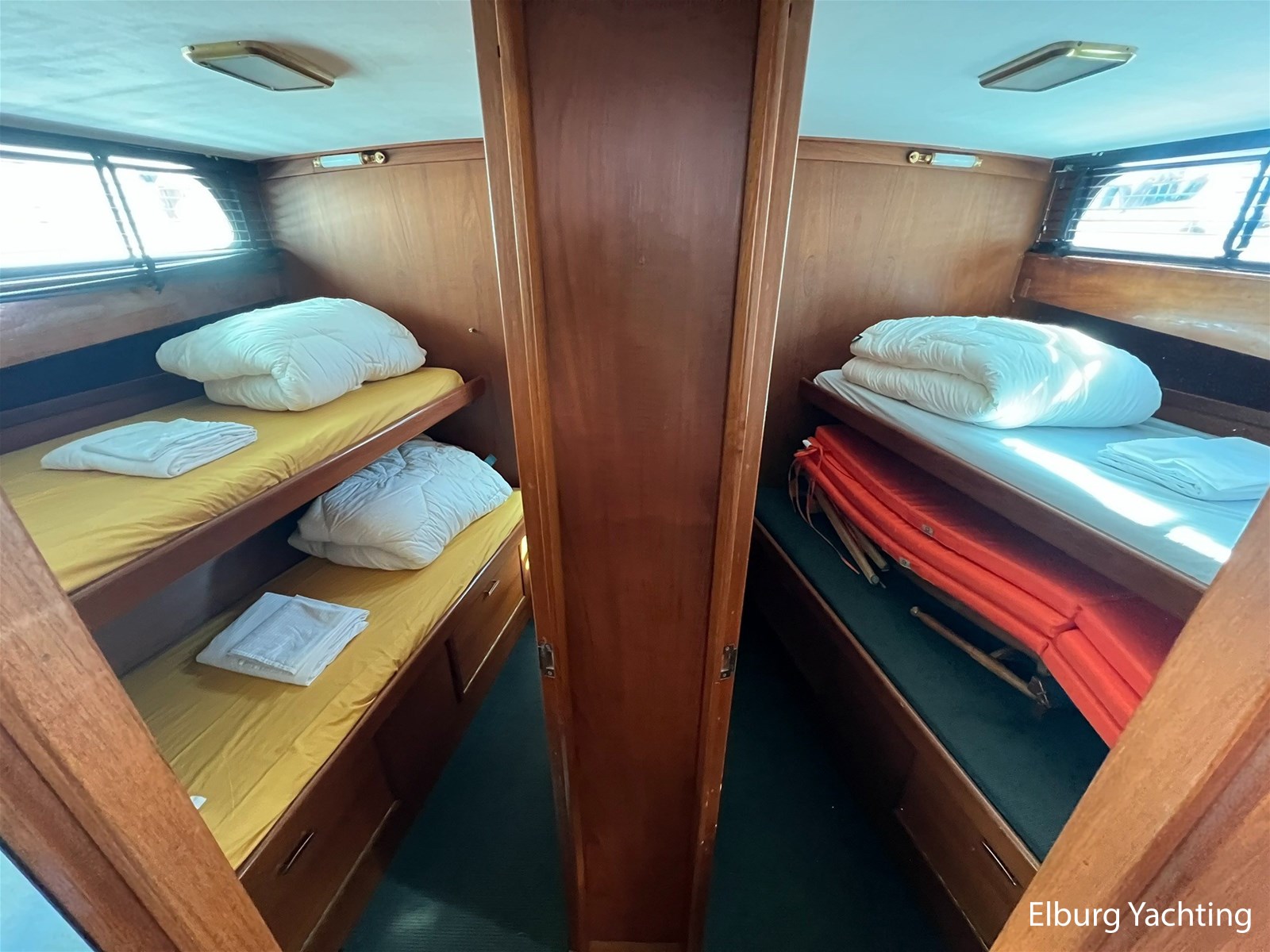 - 6 x vast (1 x 2 pers. vrijstaand bed in achterhut + 2 x 1 pers. stapelbed in voorschip BB-zijde + 2 x 1 pers. stapel bed in voorschip SB-zijde)