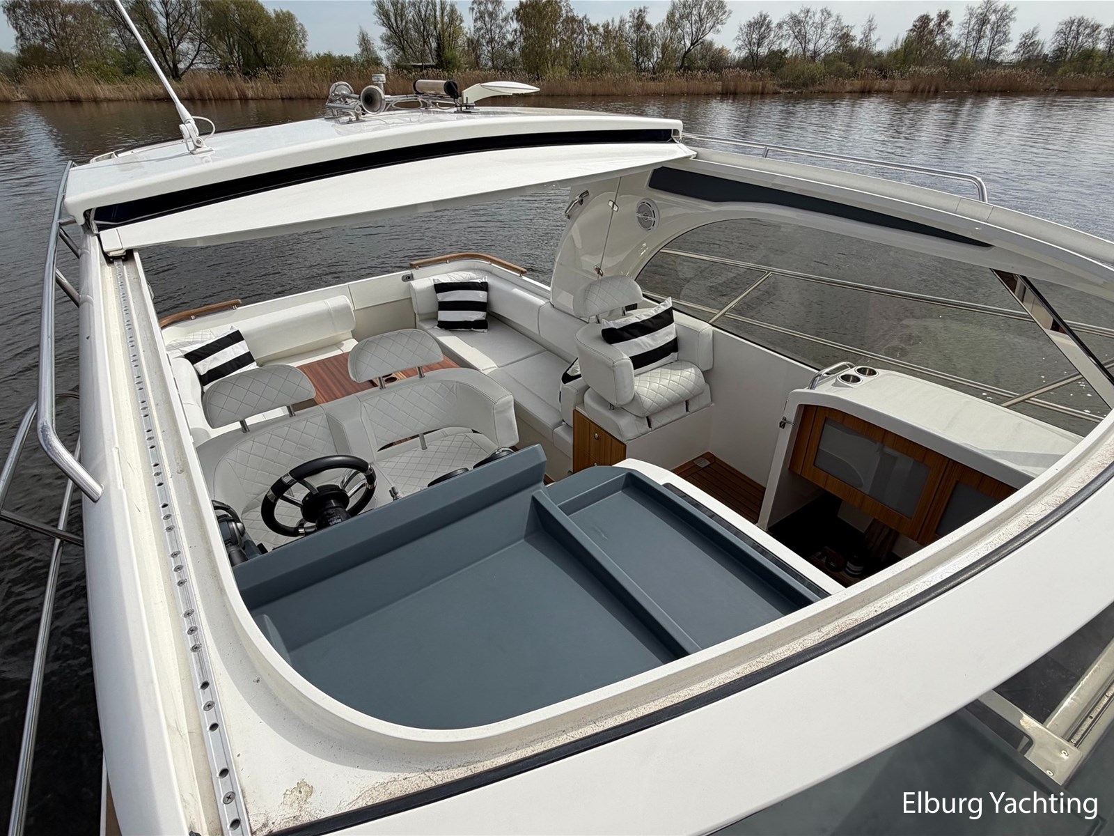 Verder beschikt het jacht over een royale open kuip met veel leefruimte, drie comfortabele vaarstoelen, sfeerverlichting in de kuip, horren, een stevige stootrand, dubbele RVS-railing rondom en, dankzij de slimme indeling, veel opbergruimte.